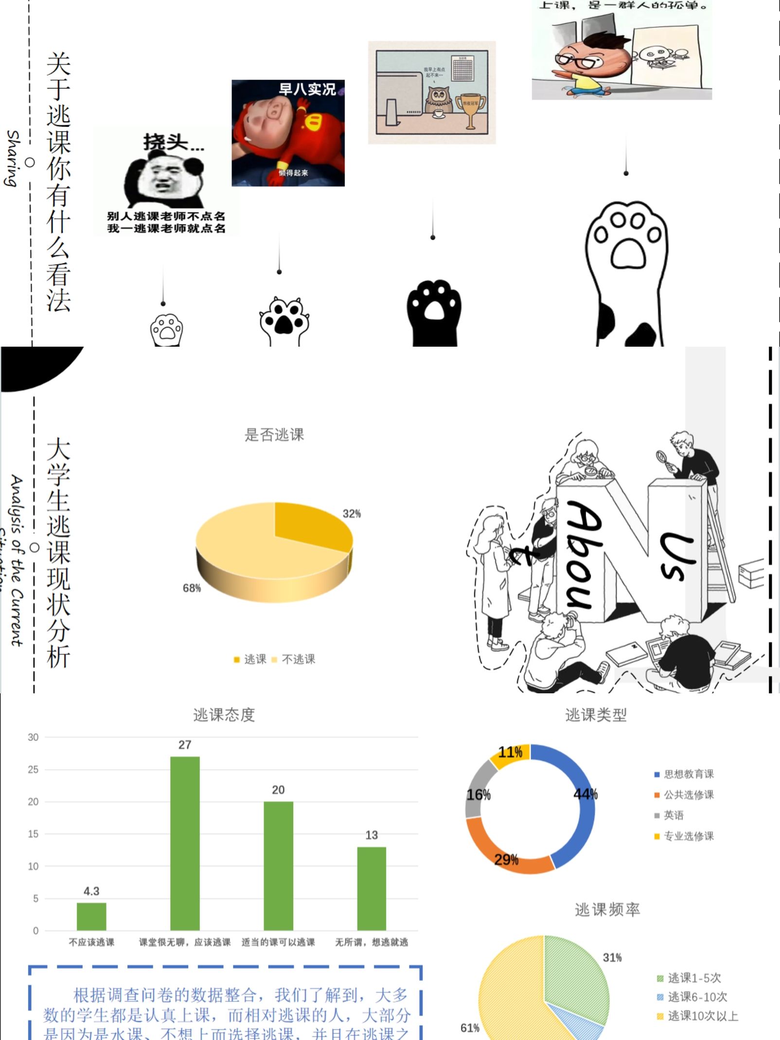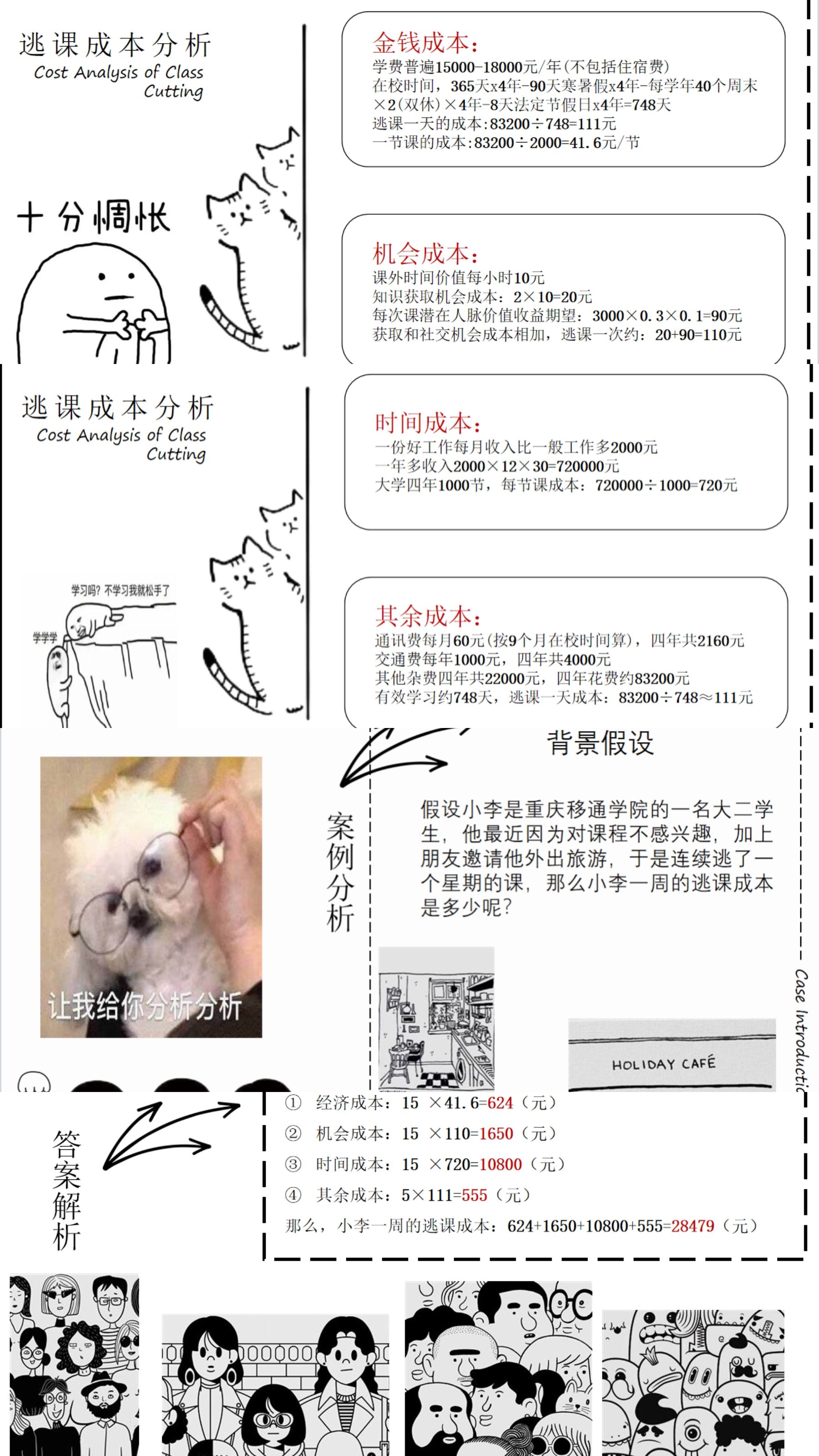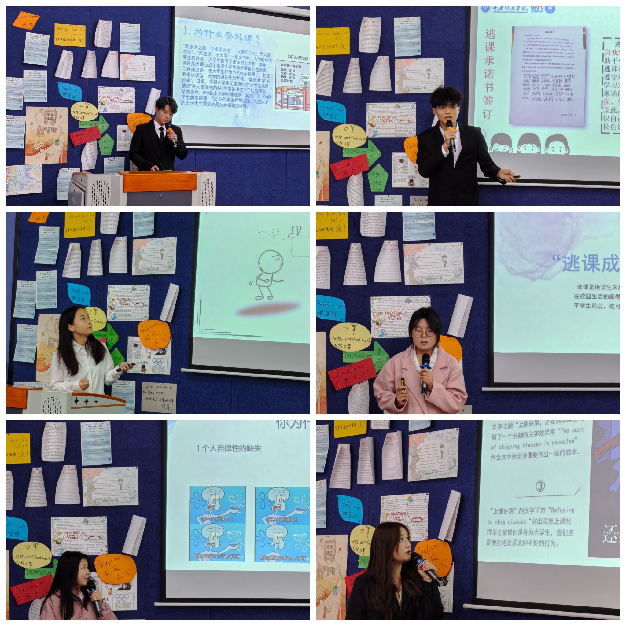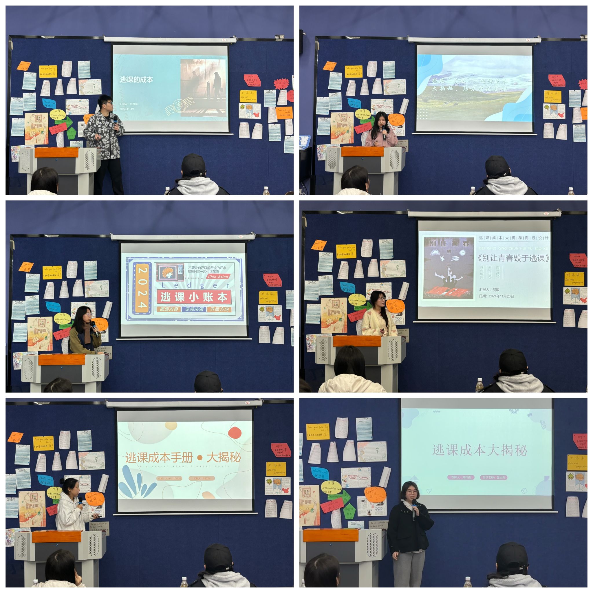 初赛以线上征集形式开展,汇聚20多支队伍的逃课成本帐作品。各队深入挖掘逃课的代价,结合自身学习过程与班级的主题班会活动,切身体验地进行了对大学生逃课成本帐的作品创作,以海报、微电影、漫画、手册等形式生动呈现。经严谨评审,12支队伍凭借深刻内容、创新思维与精妙设计脱颖而出,晋级决赛,在现场展现更精彩的答辩风采。
