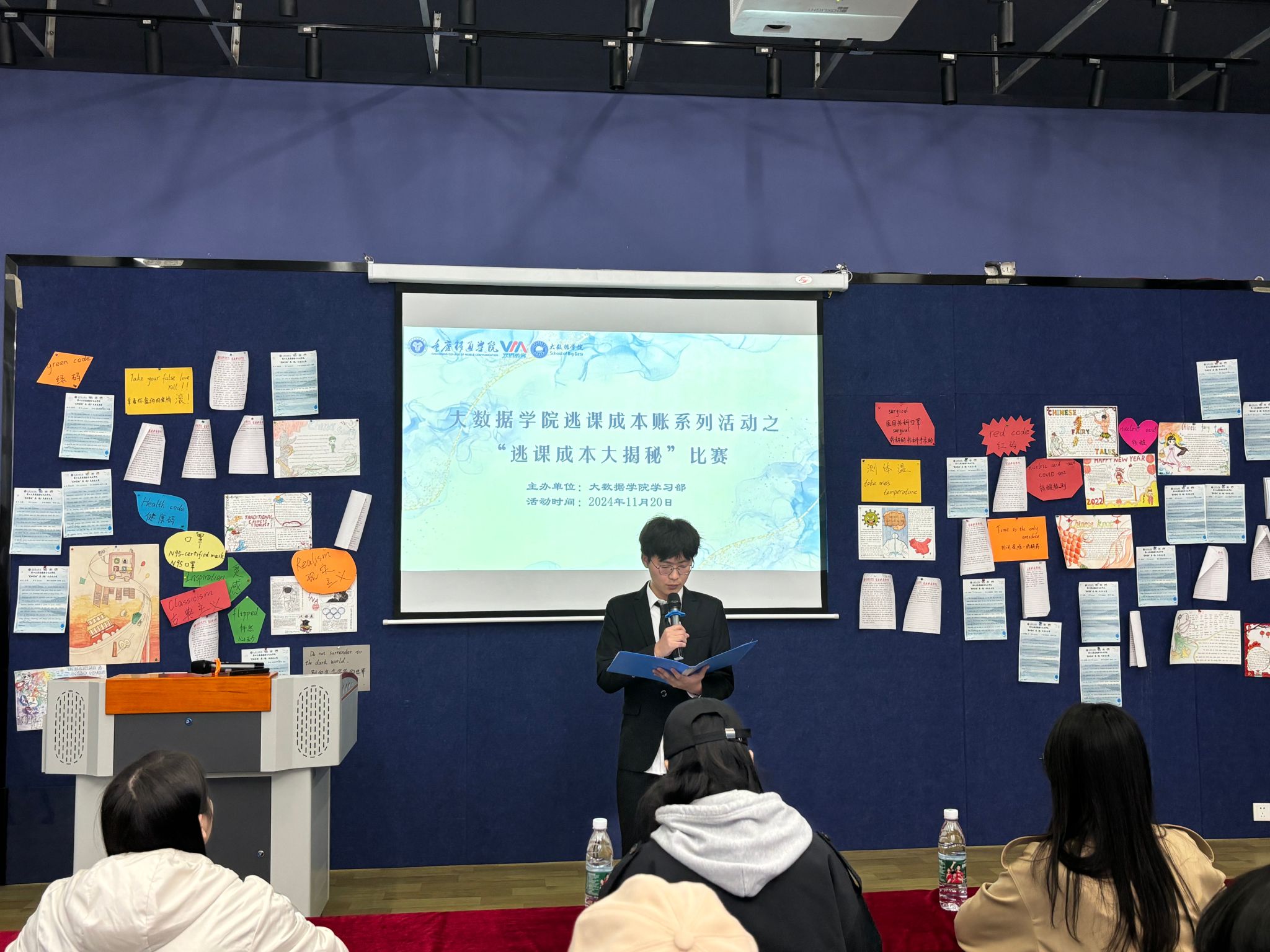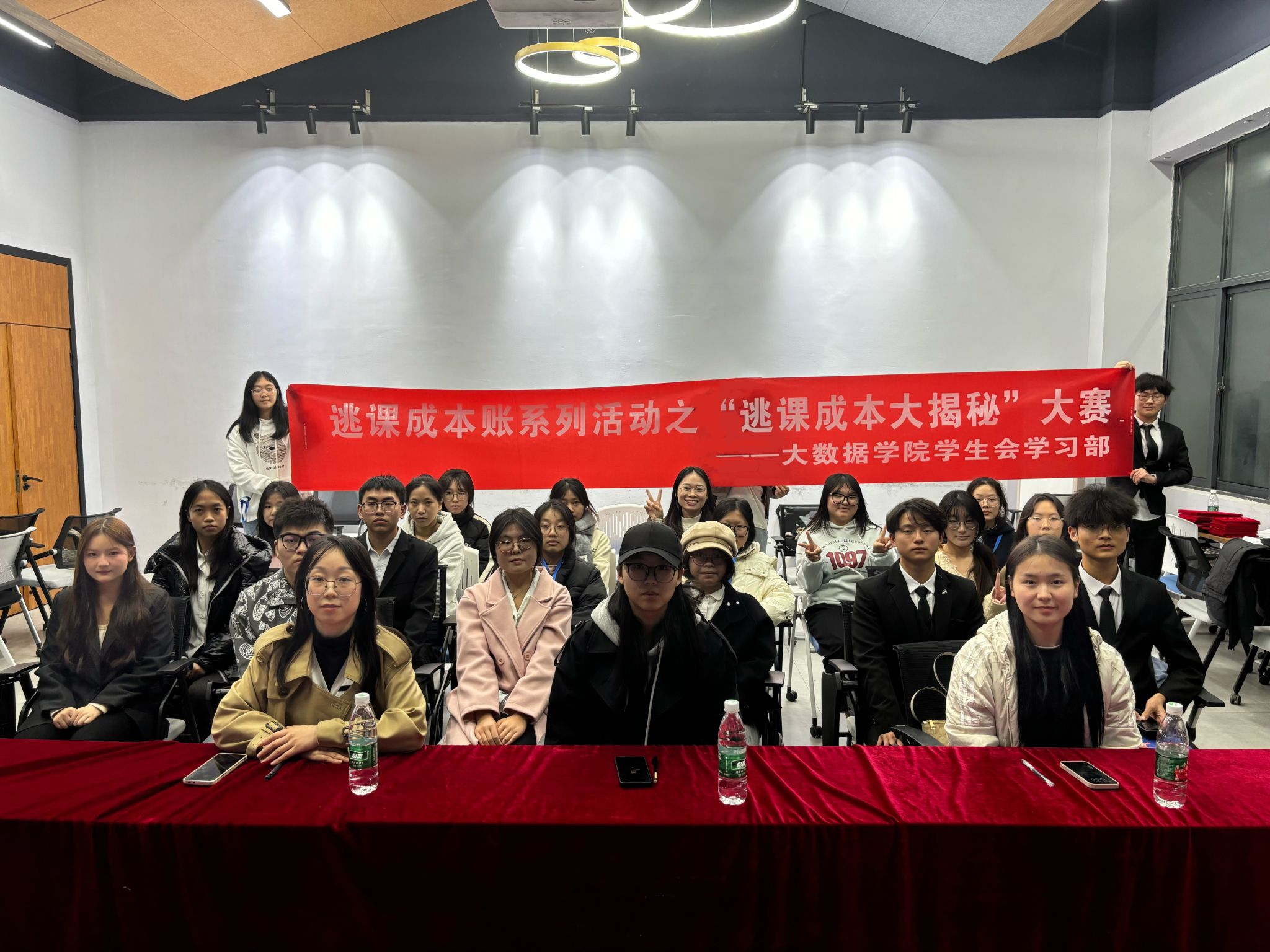 为提升学生的时间管理能力,强化学业规划意识,营造积极向上的优良学风,大数据学院学习部于 2024 年 11月20 日17:00至18:30,在綦河书院二号楼两句·演讲培训室举办逃课成本账系列活动之“逃课成本账大揭秘”比赛决赛,致力于为同学们的成长提供有力支持,全力打造有助于提升学习效率的良好氛围。