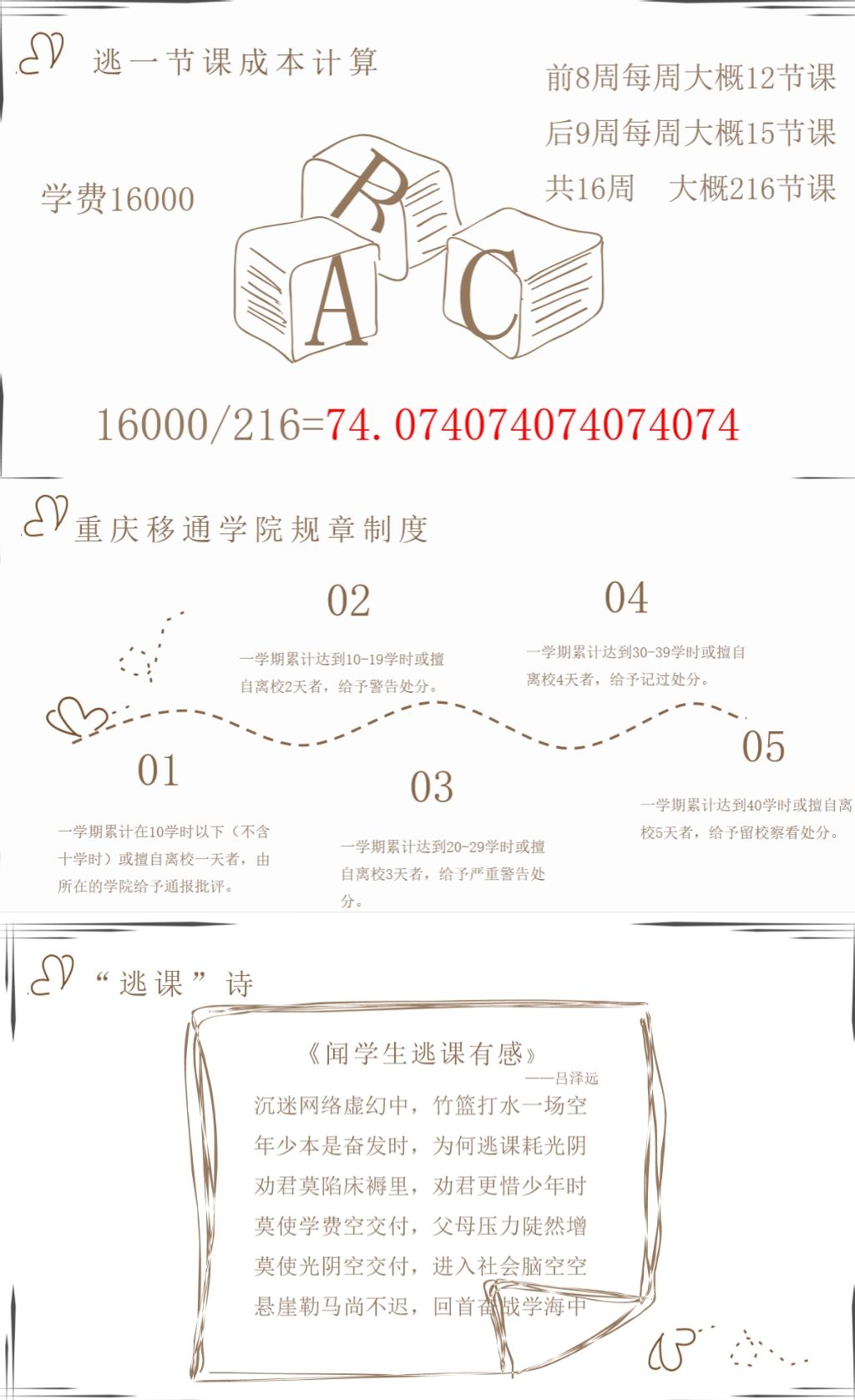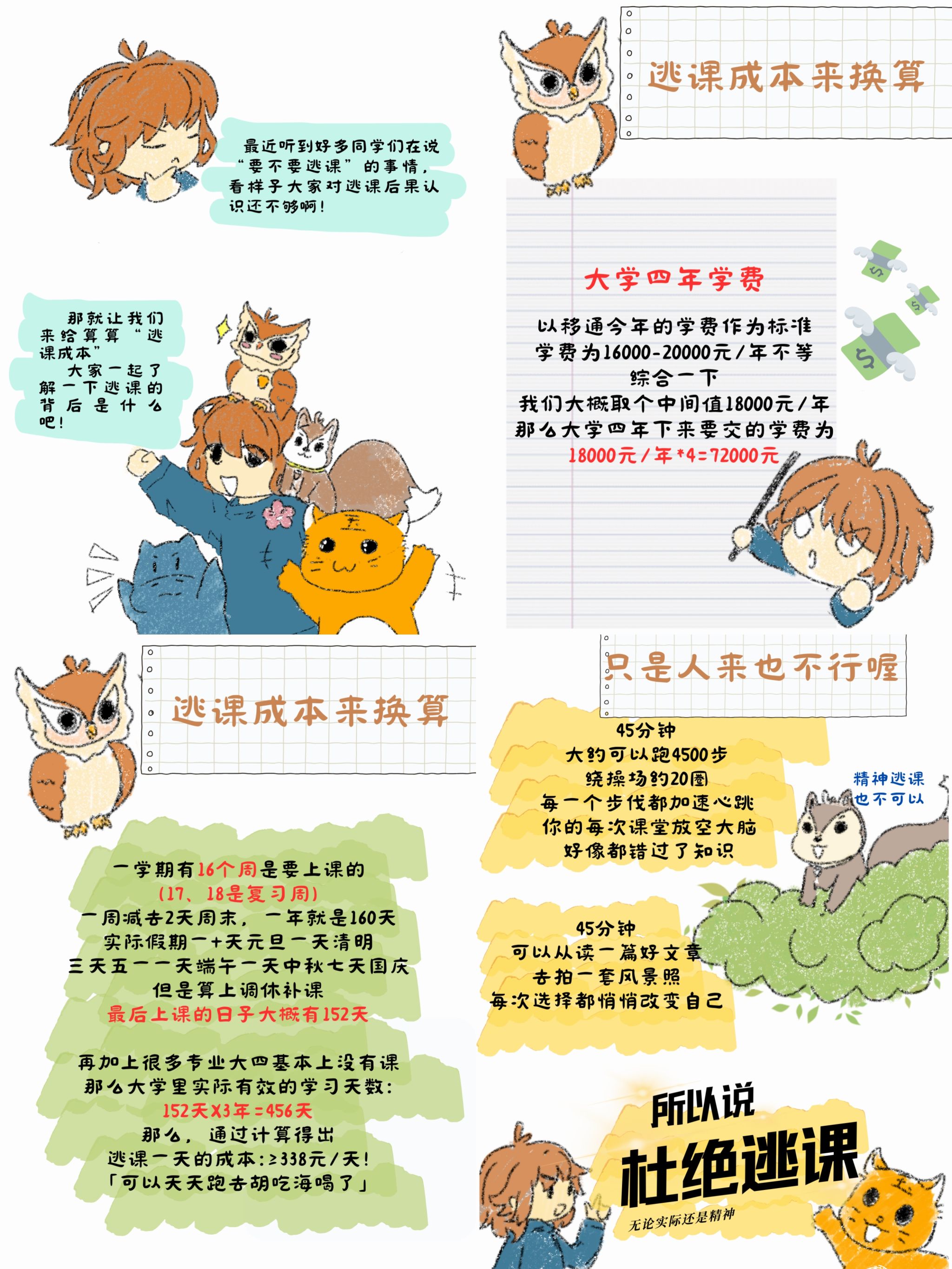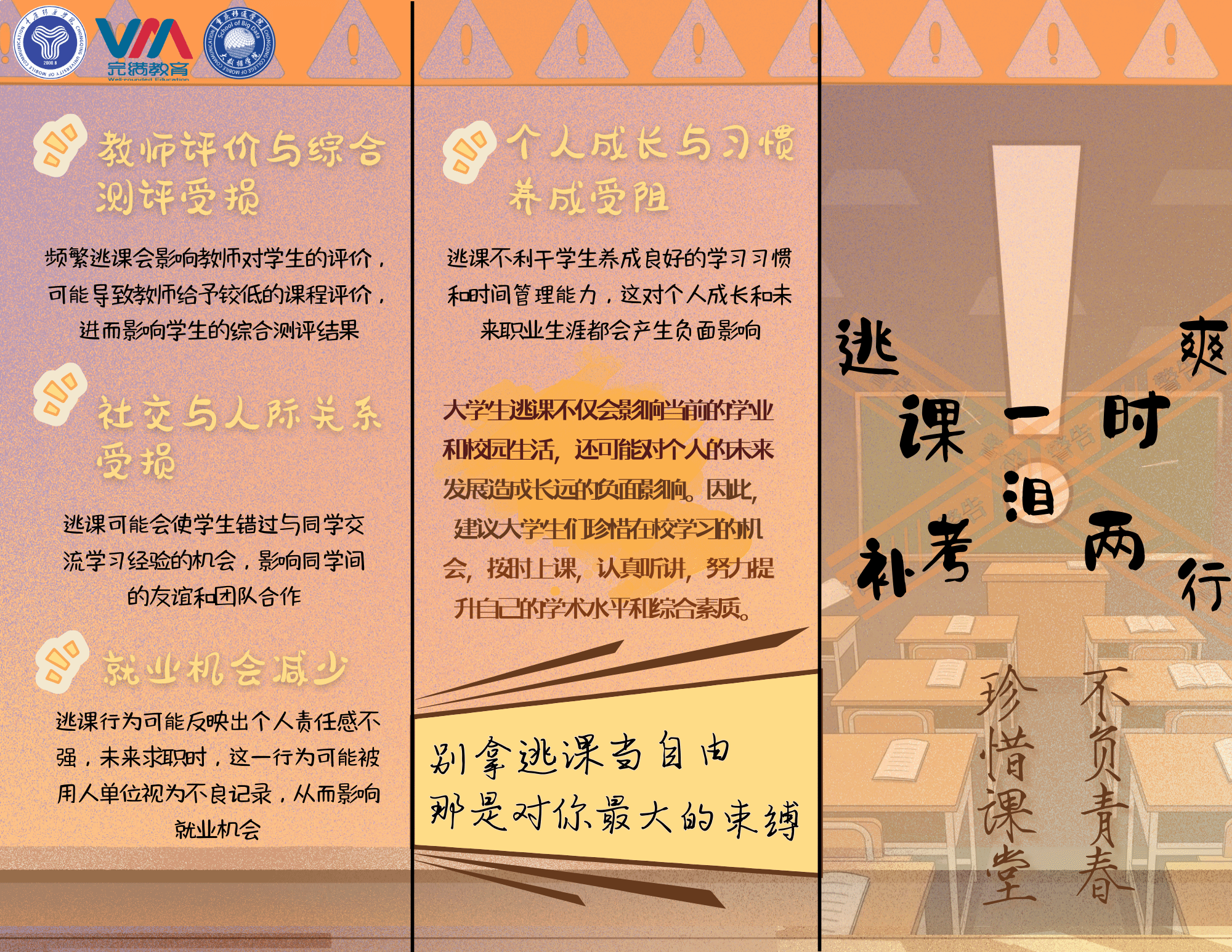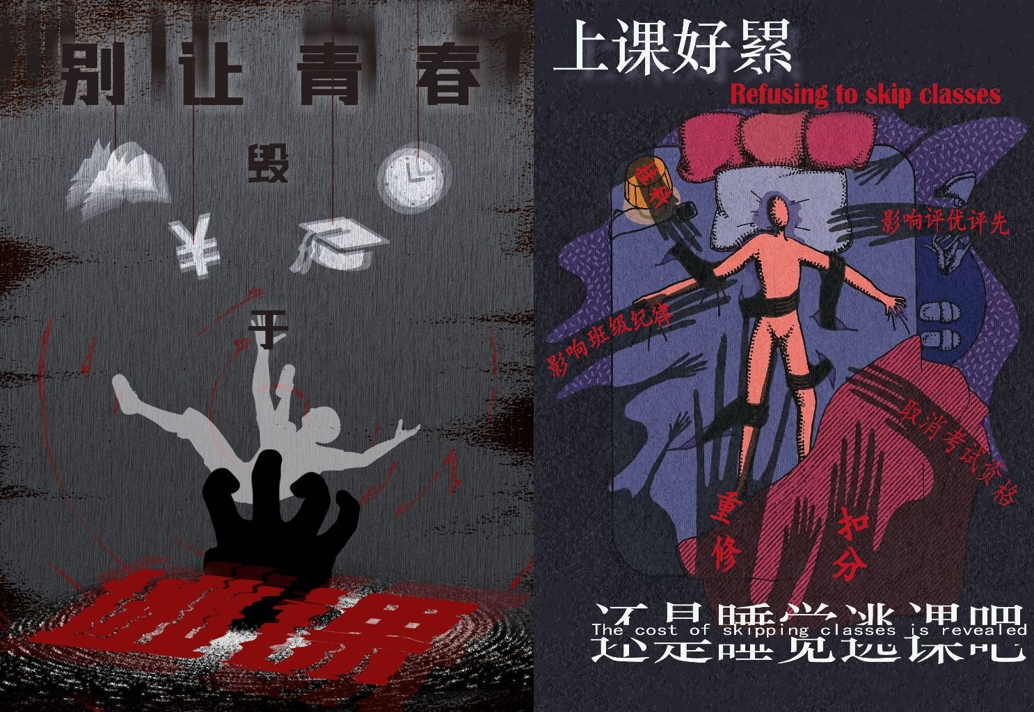 在个人展示环节,选手们对作品见解独道,从个人经历出发,讲述逃课背后的真实故事与深刻反思,以连环漫画、海报等形式,直观展示逃课成本对于学业的负面影响。有的选手以《逃课小账本》的形式展现对于逃课成本的理解,数据化换算逃课的具体成本,以警示其他同学;有的选手将逃课可能带来的影响融入作品,传递出珍惜时光、勤奋学习的正能量。