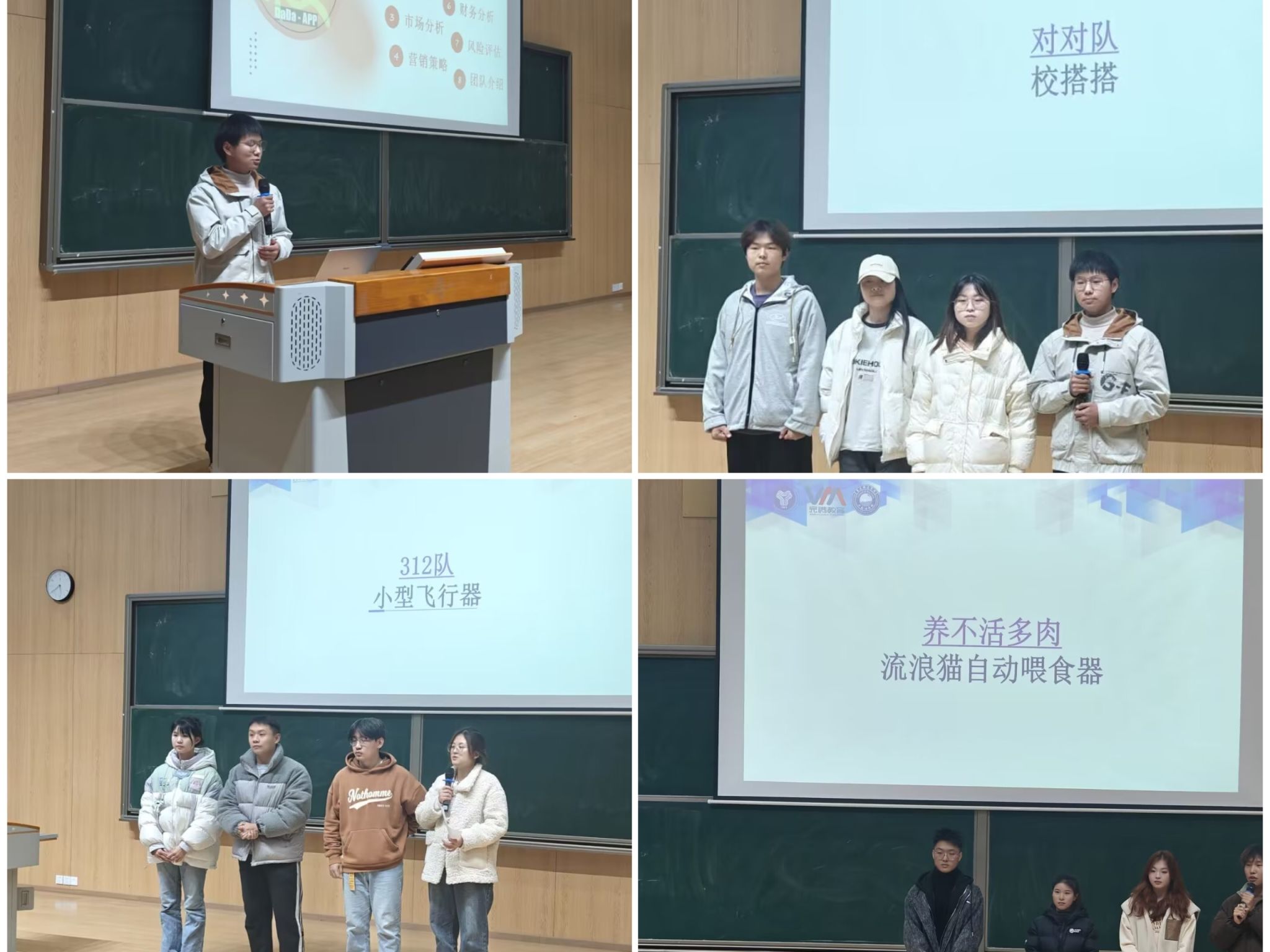 主持人清晰地介绍完比赛流程之后,现场气氛瞬间被点燃,一场扣人心弦、紧张激烈的比赛正式拉开了帷幕。各参赛团队在台上尽情地示着自己的奇思妙想。此次活动涵盖多个项目,包括甜品店开发、流浪猫自动投喂机、搭子社交平台、大学生 VR 旅游体验、美食探索以及游戏创作等。选手们以日常生活需求为导向开展项目研发,并由各项目主讲人分享团队的创新理念与创业目标,充分展现了他们对生活的细致观察和对创业的热情探索。在每对讲人完成演讲后,评委们皆以简洁精准之语,为各团队悉心提出建议,剖析其优势与劣势所在,助力选手们明晰自身问题。如针对甜品店项目,评委指出,当前甜品店数量众多,应深入思考如何凸显自身卖点;对于流浪动物自动投喂机项目,评委则就成本与前期启动资金的合理分配以及盈利模式展开探讨,询问如何从中实现利润获取;而面对大学生 VR 旅游项目,评委表示大学生或更青睐实际旅行体验,进而对该项目的市场定位与发展前景提出质疑。诸如此类评价,皆依据各队表现及项目内容给出,切中肯綮,极具建设性。