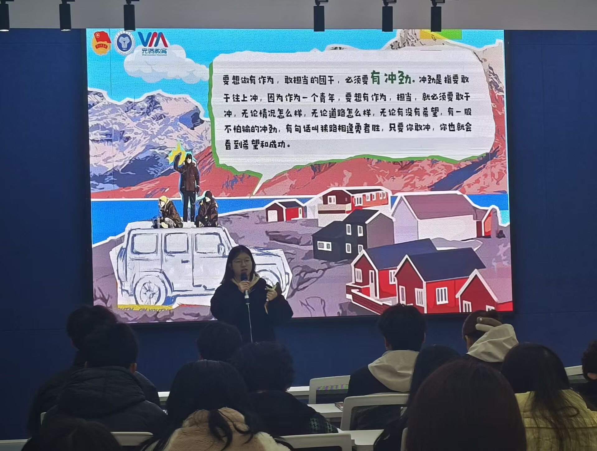 主讲人阐述了每一代中国青年都经历了时代的考验。现在的青年被称为“网生一代”的新时代青年,得益于改革开放的广阔视角,自小就得到更多走出国门认识世界的机会。并告诉当代青年们在这个有位时代里,大家需要在挑战中寻找机遇,在困难中磨砺意志,在平凡中创造不凡。要学会坦然接受,试着去改变,必须走出“躺平”误区,有为无畏。