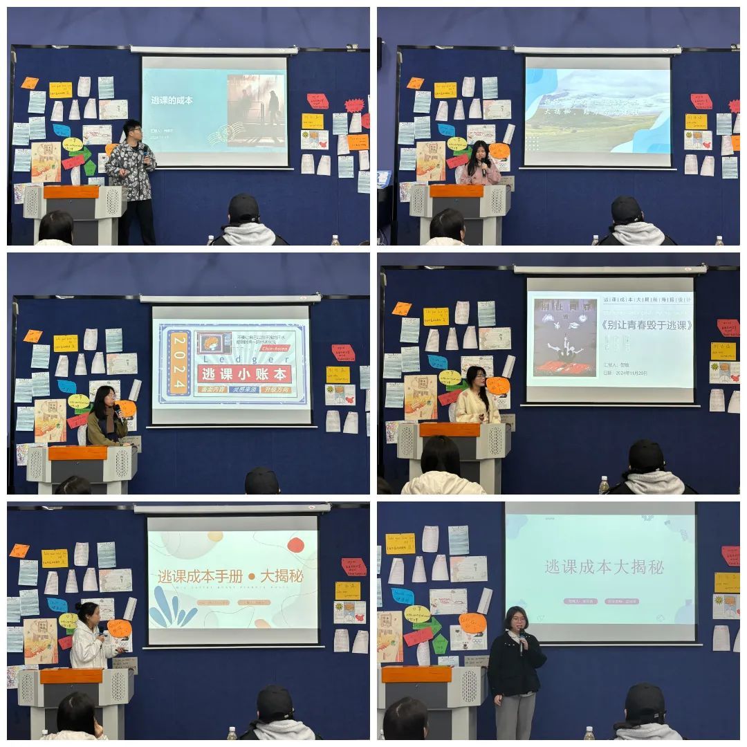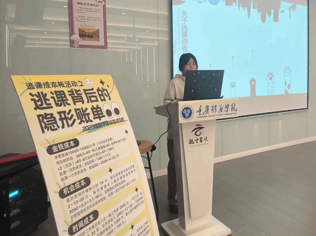 为增强学生的出勤意识,引导学生树立正确的学习观念,2024年11月12日16:30,由2023级数字媒体技术5班主办的逃课成本账之“逃课背后的隐形账单”主题活动在观云书院秋分·多功能活动室顺利举办!旨在警示同学们不要挥霍青春,要严于律己,珍惜时光!此次活动紧紧围绕“逃课成本引入”“逃课成本分析”“呼吁不逃课”三大板块,通过这些内容,使同学们深刻理解逃课行为可能带来的一系列潜在危害和损失。