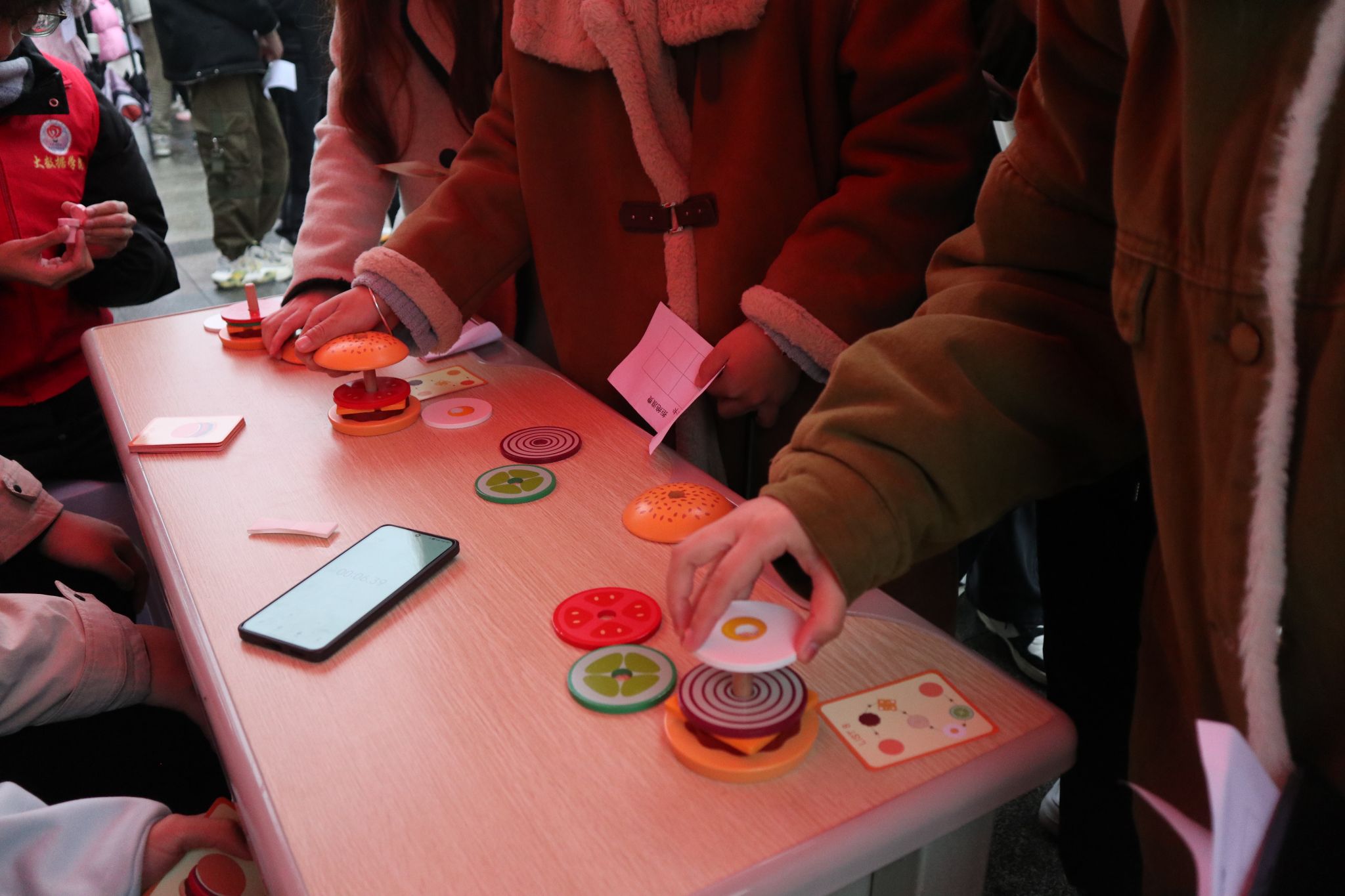 “节粮打卡”活动背景板设计精美,吸引众多同学拍照打卡并获得盖章。节粮寄语环节,同学们在便签纸上写下节约粮食的感悟与承诺,贴于KT板上。有同学写道:“每一粒粮食都是大自然的馈赠,我们应倍加珍惜,节约粮食,从我做起,让‘光盘’成为习惯。”简笔画食物、食物七巧板、拼汉堡、抓萝卜及食物词语联想等活动,巧妙融入节粮理念,让同学在创意与欢乐中体会食物珍贵,形成良好节粮风尚。