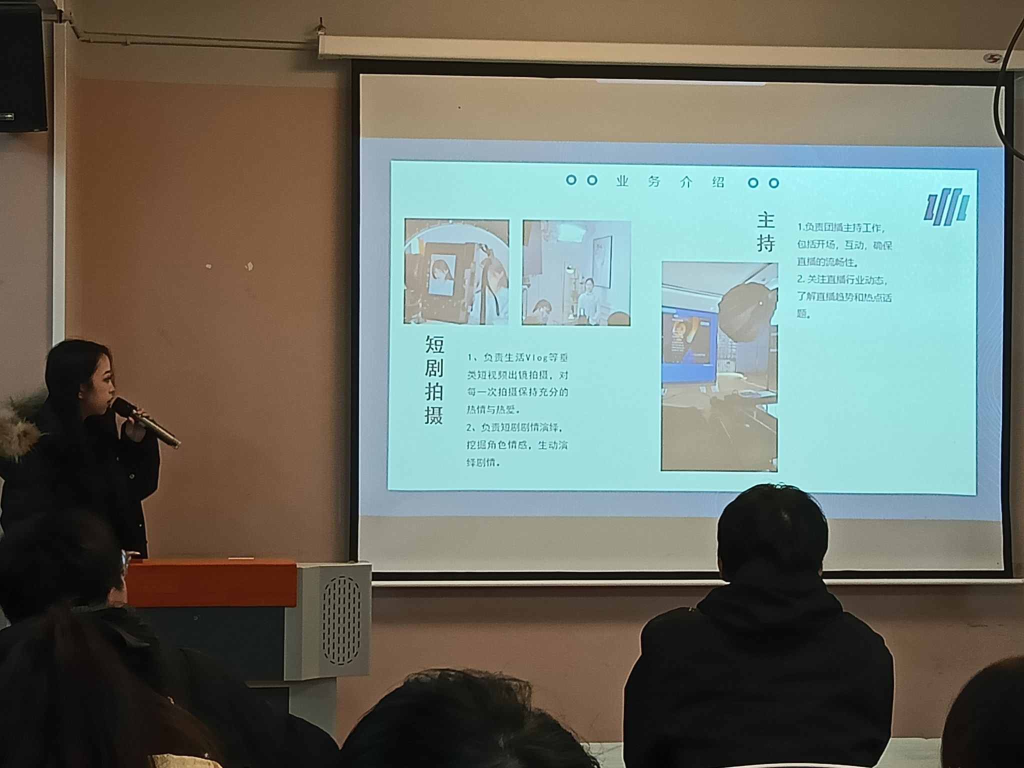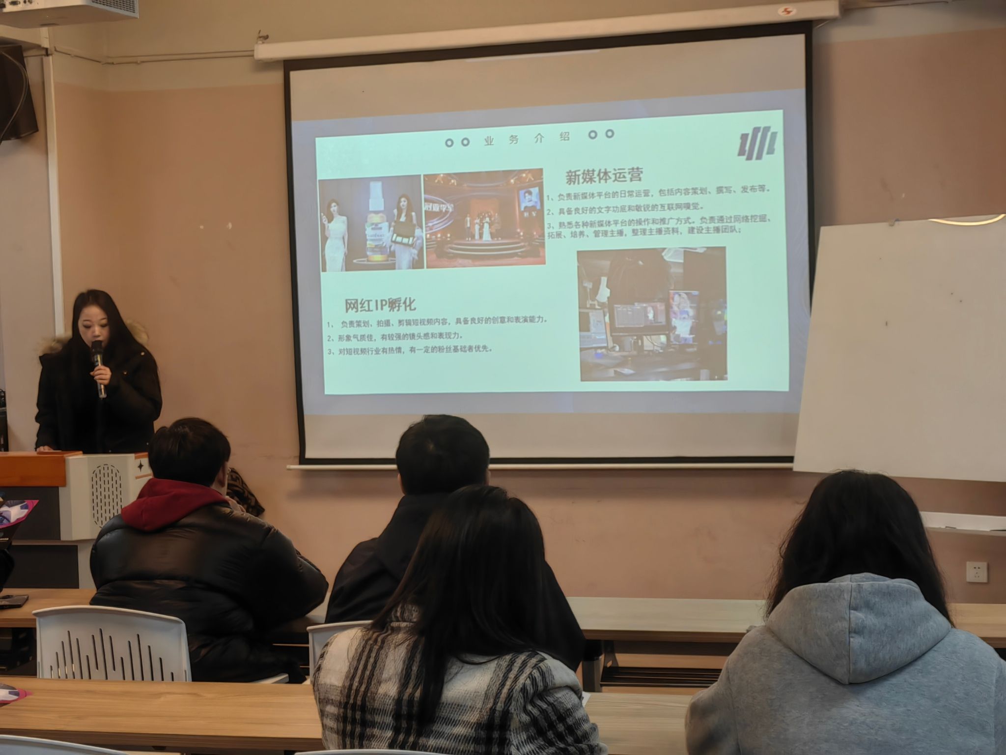 宣讲会伊始,主持人热情洋溢地开场,对中媒楼宇(重庆)文化传媒有限公司的各位嘉宾表示热烈欢迎,并简要介绍了宣讲会的流程和目的。随后,朱老师全方位地讲述了公司的发展历程、企业文化、组织架构以及取得的辉煌成就。从初创时的筚路蓝缕到如今在行业内的举足轻重,这一路走来的故事让同学们深深感受到了其蓬勃的发展活力和深厚的企业文化,引得台下阵阵掌声。