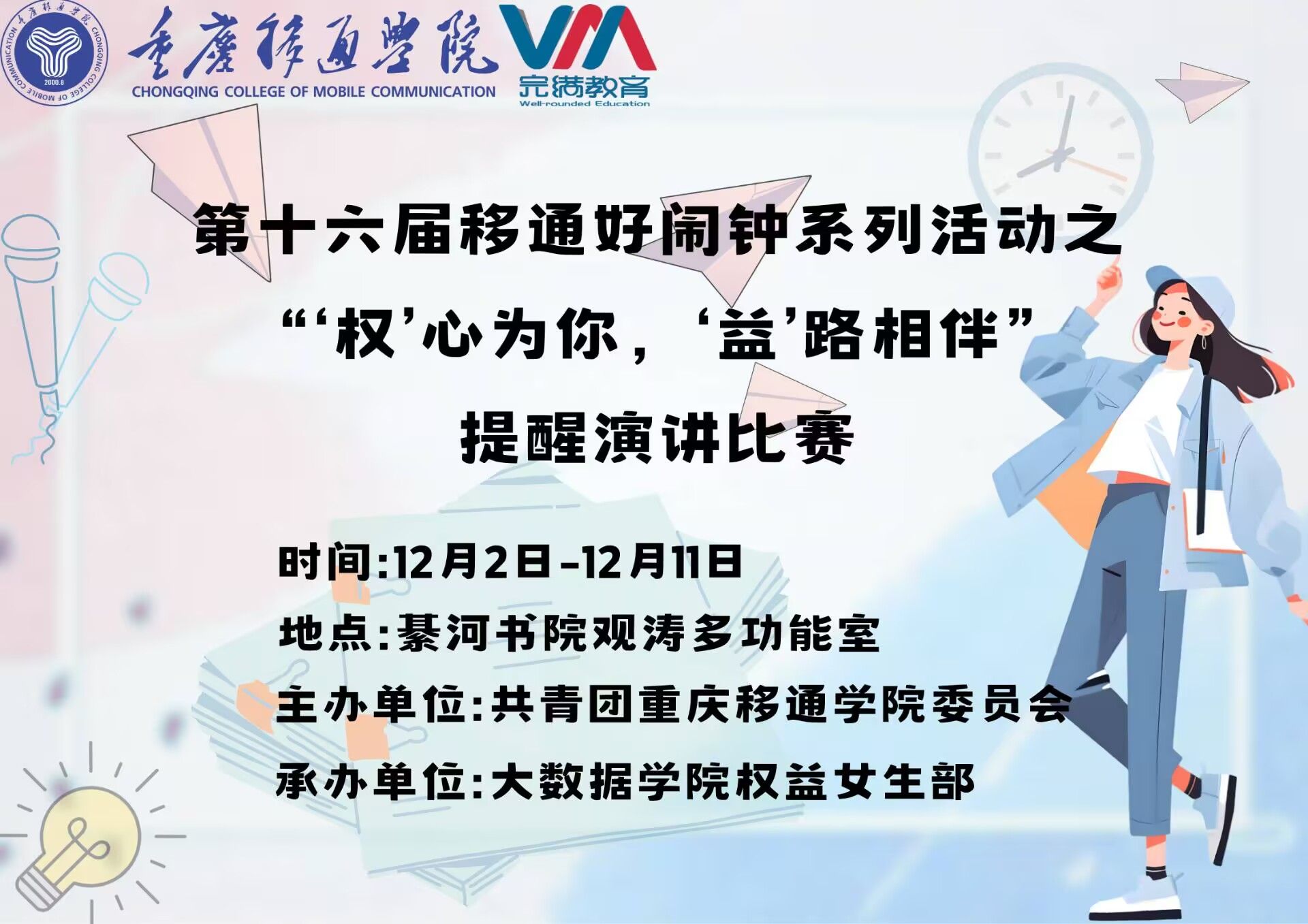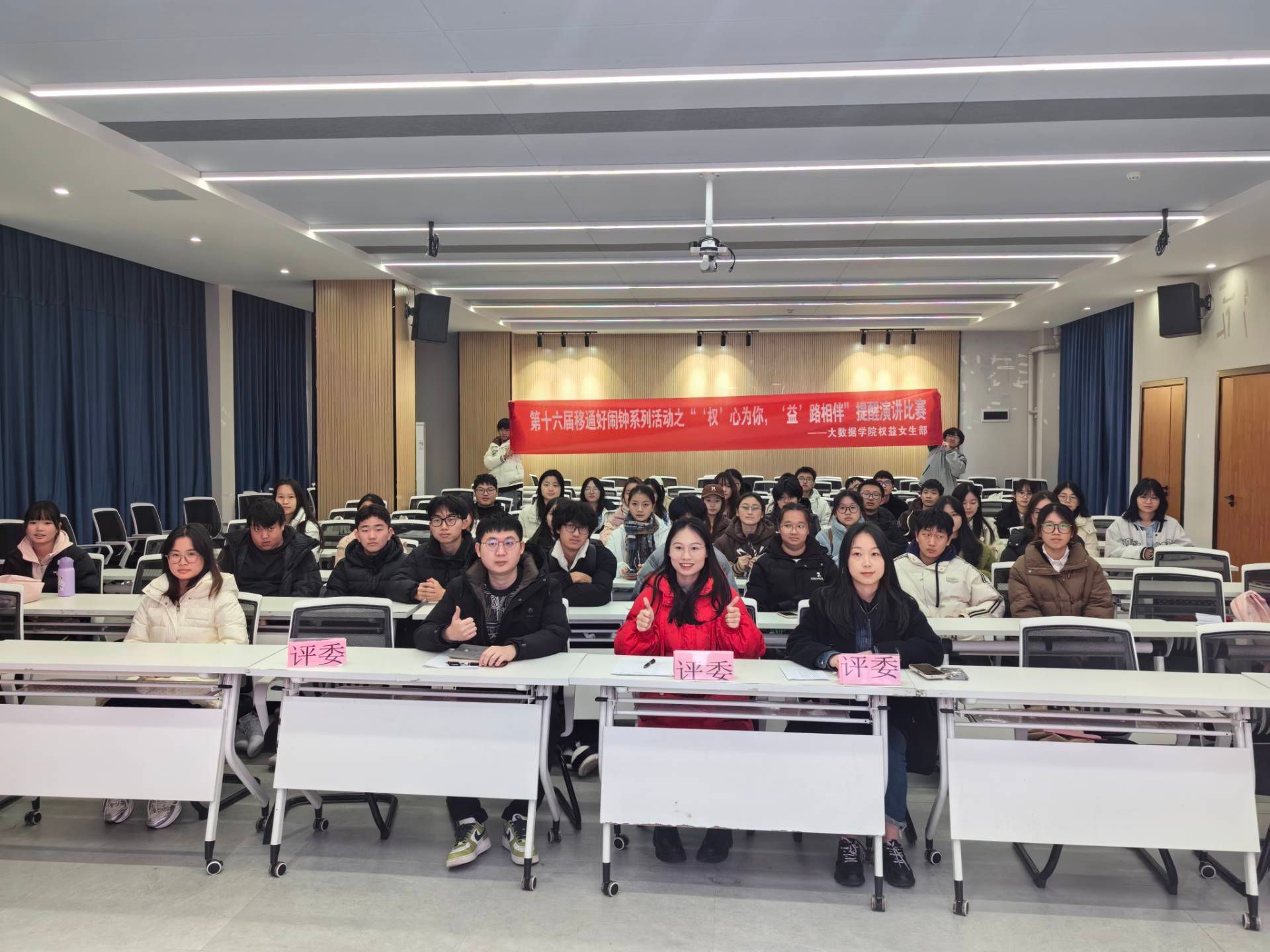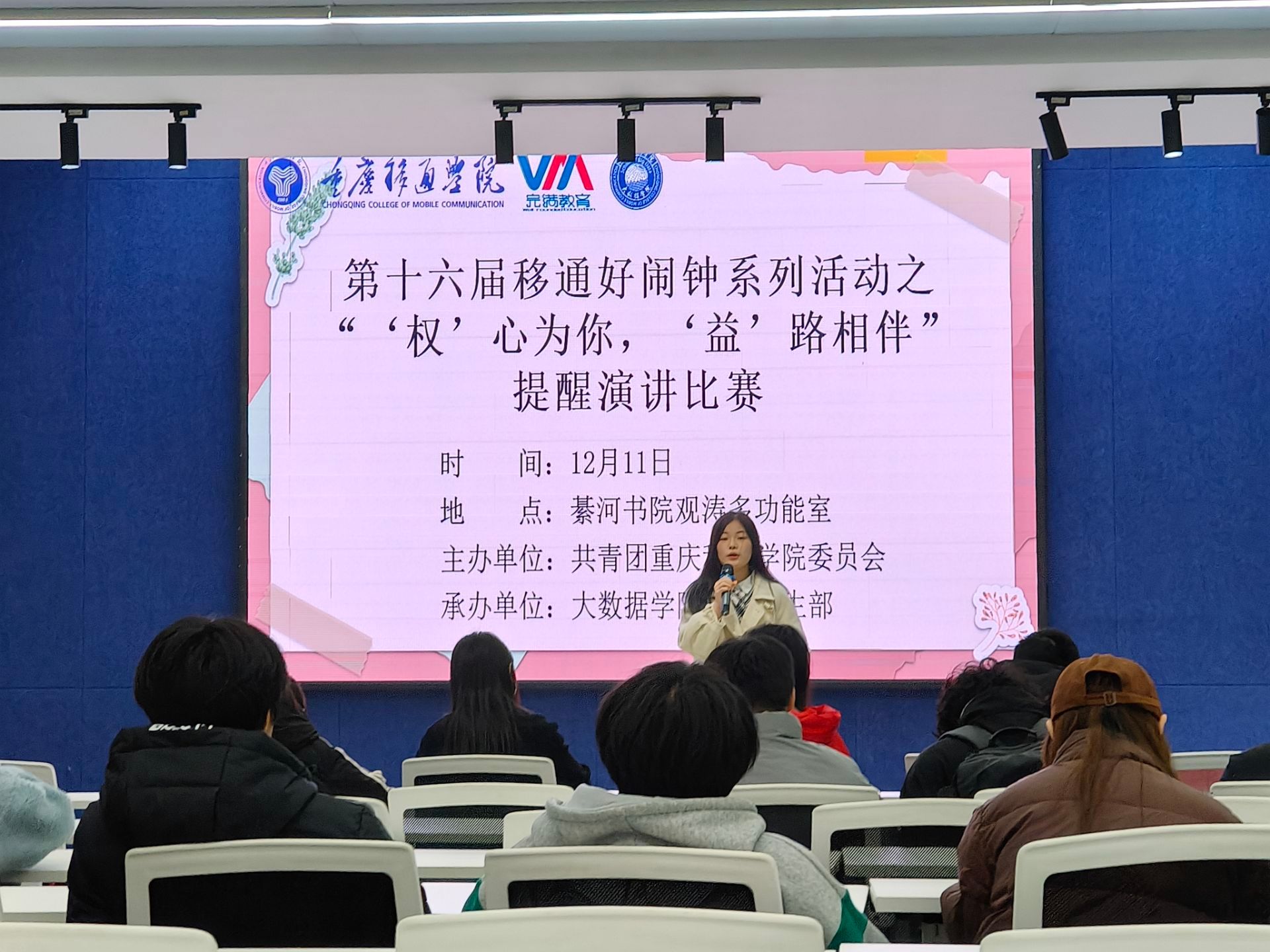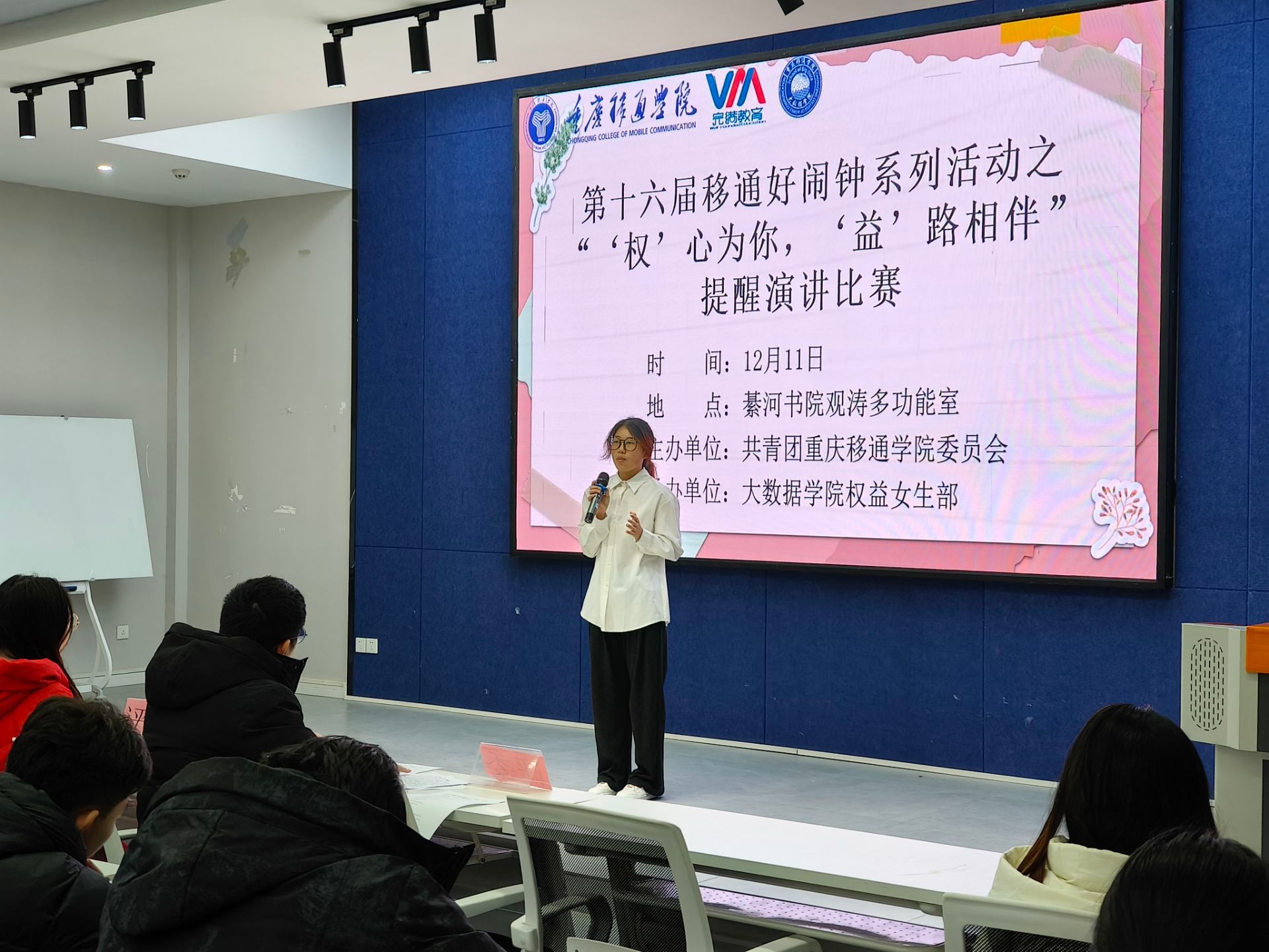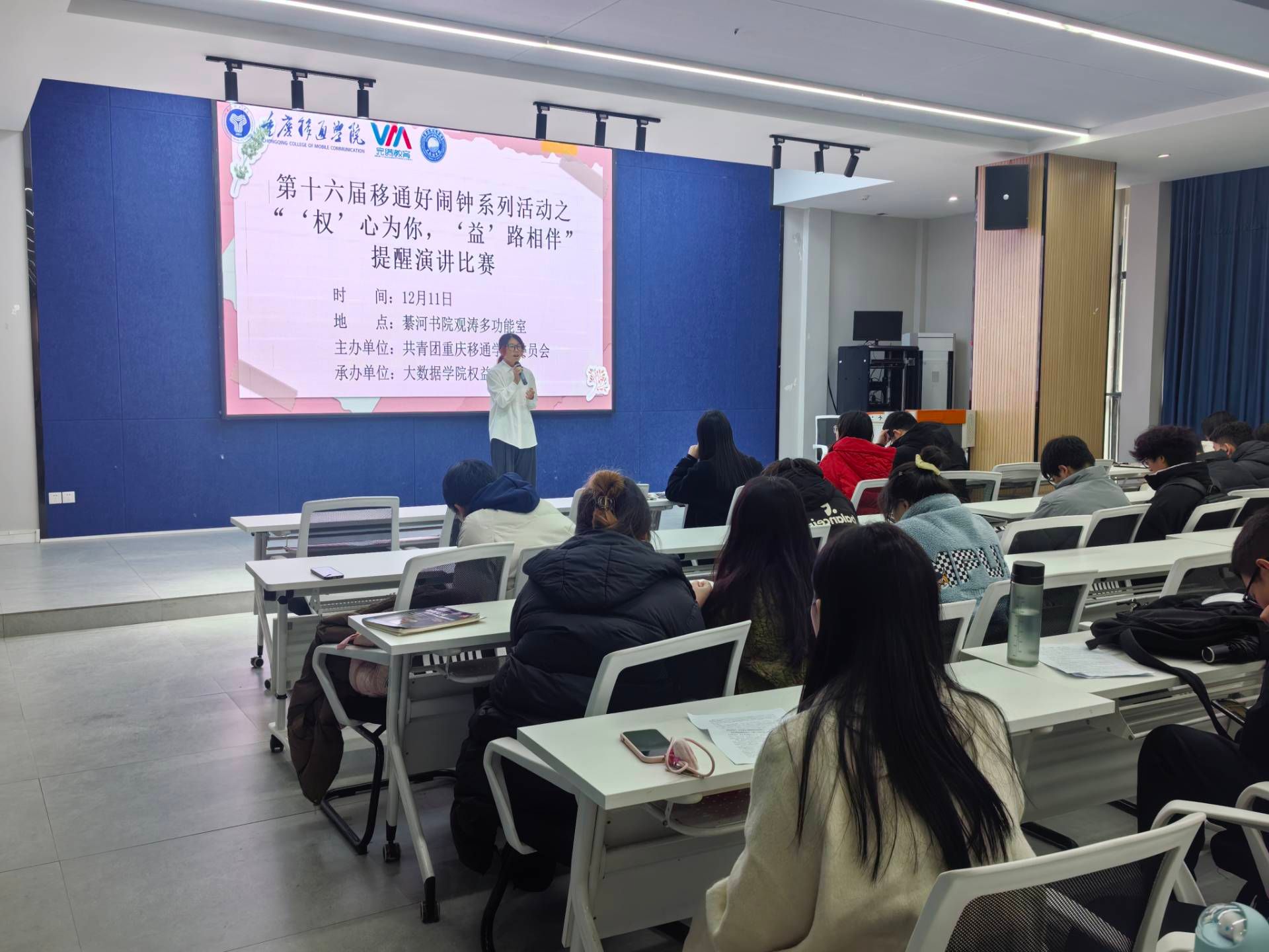 权益,是每个人心中的天平,衡量着社会的公正与温暖。为积极推动校园权益建设,大数据学院权益女生部于12月11日12:20-14:00在綦河书院观涛多功能室举办了第十六届移通好闹钟系列活动之“‘权’心为你,‘益’路相伴”提醒演讲比赛。此次活动吸引了众多学生的积极参与,旨在提高学生的权益保护意识,鼓励他们为构建更加公正、和谐的校园环境发声。