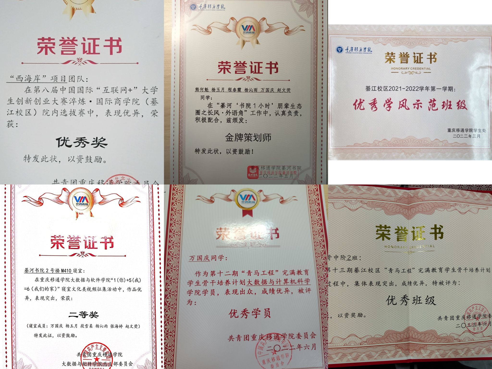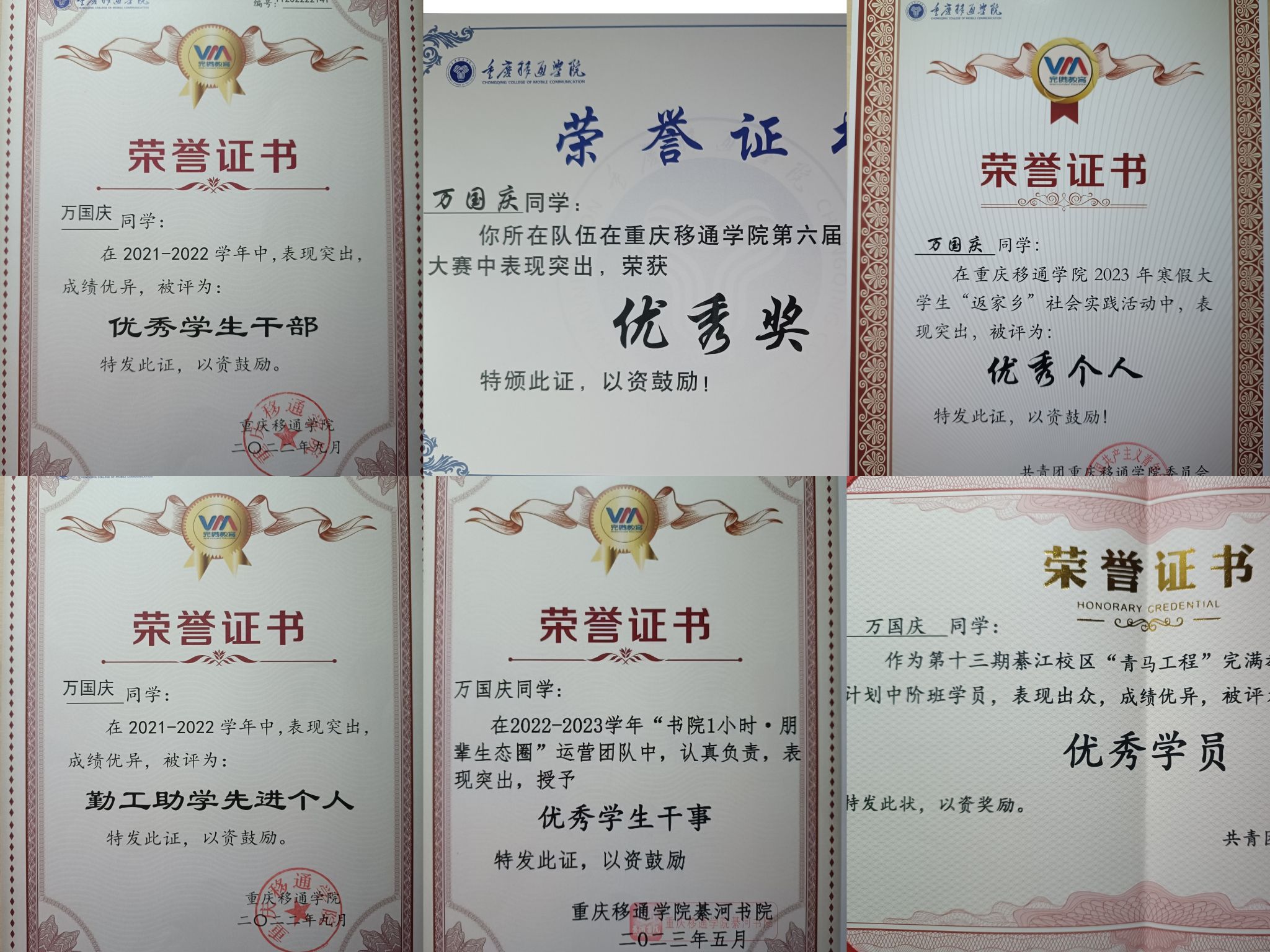万国庆,女,重庆丰都人,中共党员,2002年10月生,大数据学院2021级数字媒体技术2班学生,綦河书院学生。现任大数据学院2021级数字媒体技术2班班长,曾任大数据学院班导师,学生处学风督察员,綦河书院外语角干事。在校期间获得“筑梦奖学金”“优秀学生奖学金”“优秀学生干事”“优秀共青团干部”等多项校级荣誉。