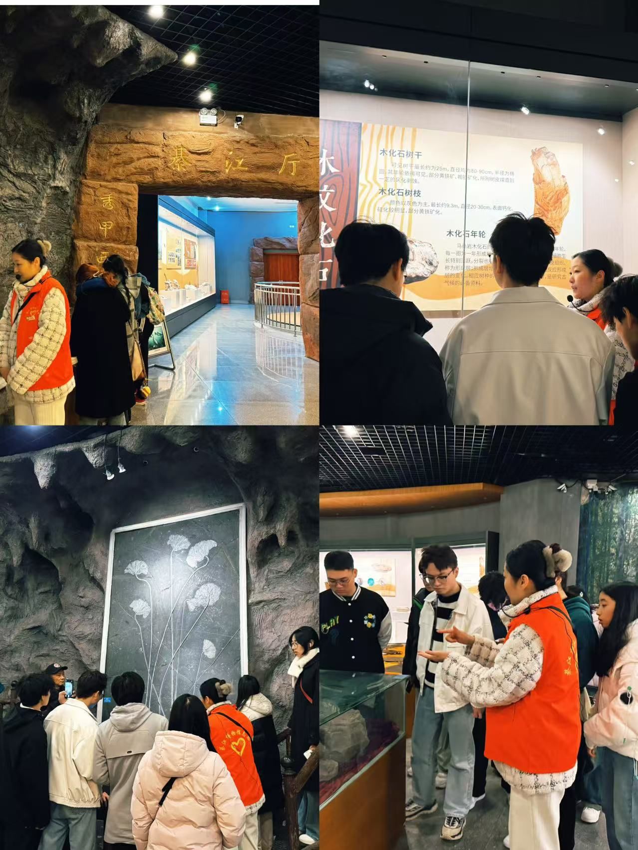 随后来到《地质展厅》,各类珍贵化石琳琅满目,木化石、恐龙足迹化石及地质矿产化石等纷纷亮相,让同学们目不暇接。而綦江博物馆的镇馆之宝 —— 三叠纪海百合化石和侏罗纪鳞齿鱼化石更是吸引了众人目光,同学们纷纷举起手机拍照留念,对綦江丰富的物产资源惊叹不已。
