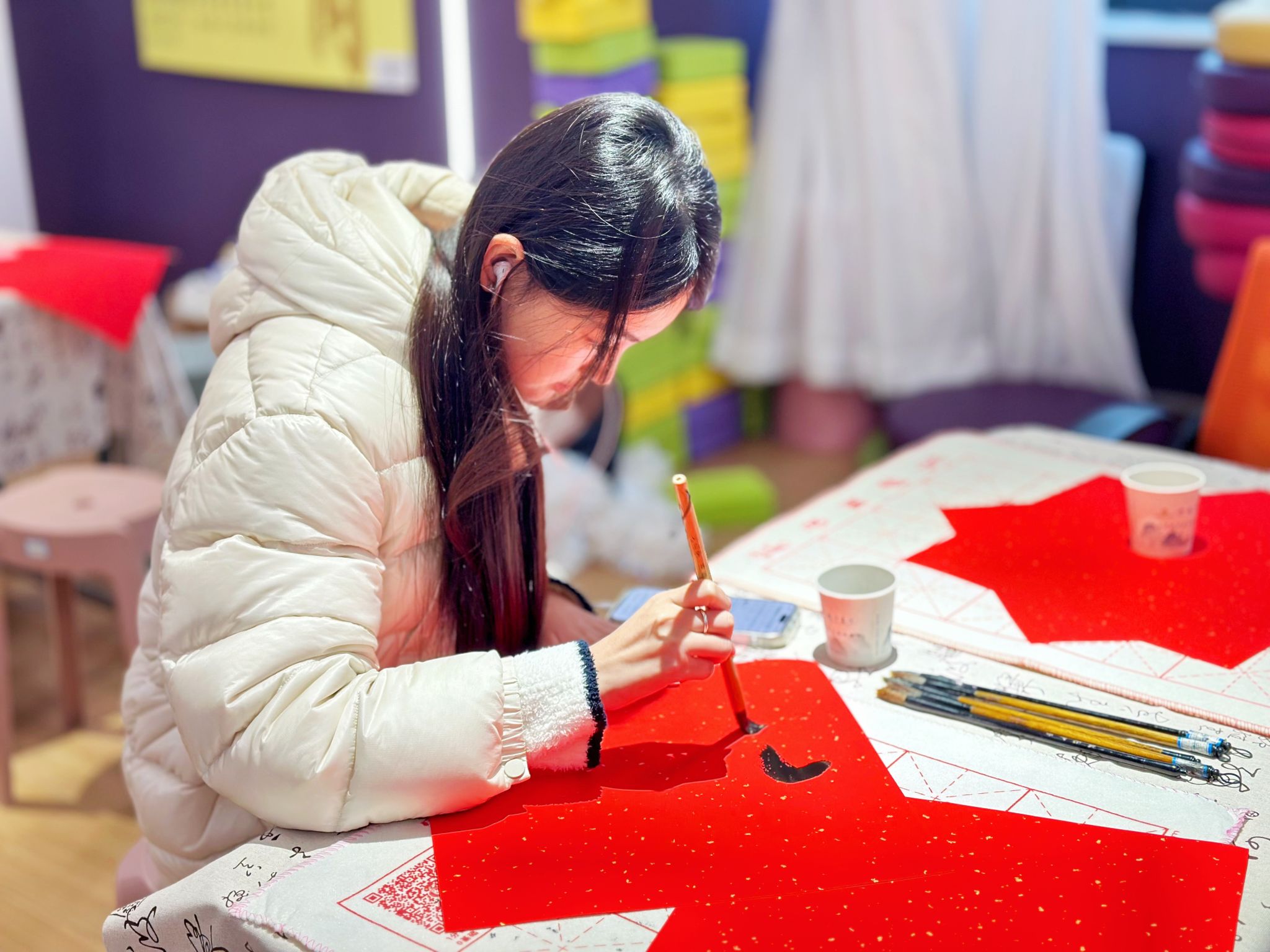 活动举行的如火如荼,于此同时,观云书院夏至・排练厅内,同学们正在挥毫泼墨,写“福”字,写春联,现场热闹非凡。