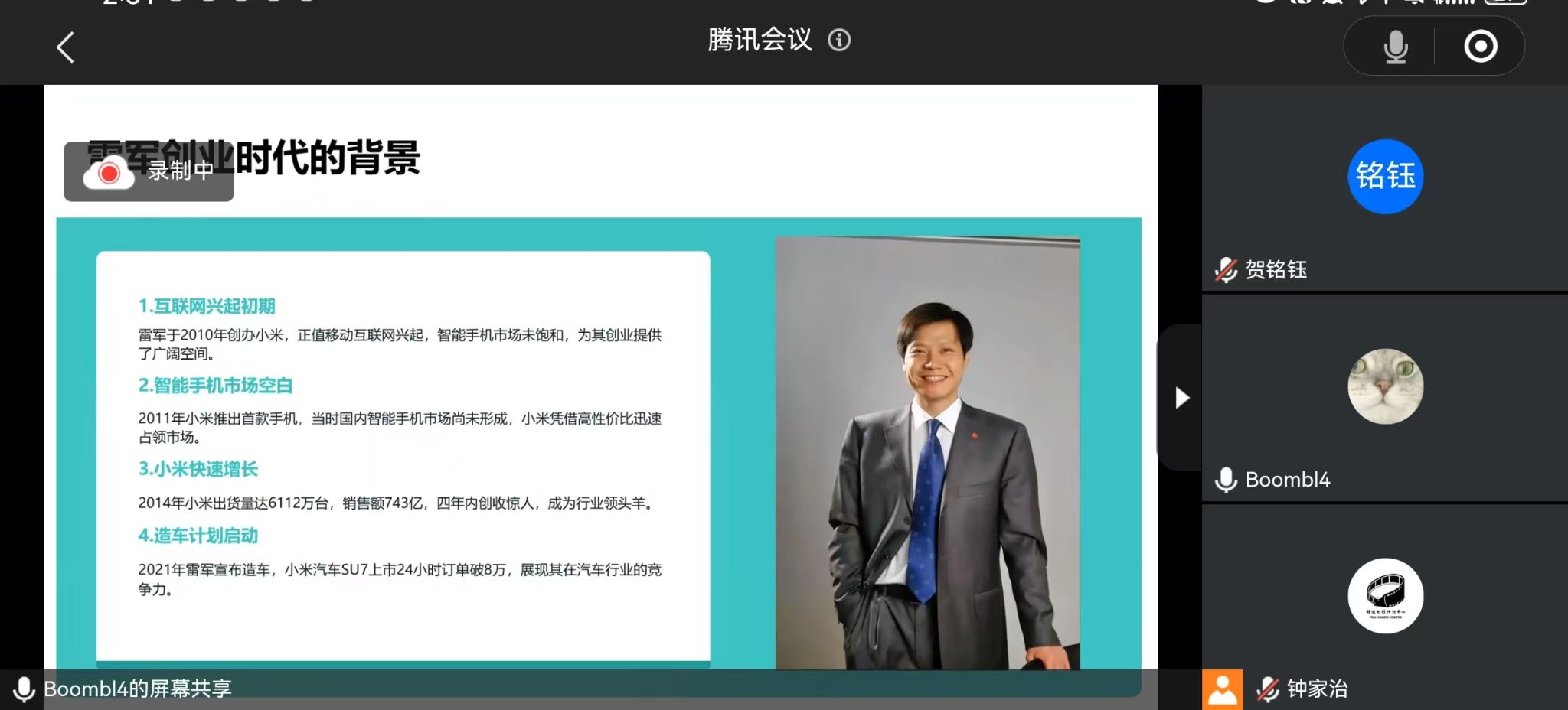 活动现场,贺铭钰导师首先向同学们介绍了雷军的个人背景和创业历程,带领大家走进了雷军那充满传奇色彩的世界。她指出,雷军的成功并非偶然,而是源于他对于梦想的执着追求和对于未来的精准规划。通过详细剖析雷军在求学、职业发展和创业过程中的重要节点,让同学们深刻感受到了规划对于个人成长和事业发展的重要性。随后,钟家治导师则从雷军的匠心精神和创新思维入手,深入解读了雷军如何凭借独特的商业眼光和敏锐的市场洞察力,在竞争激烈的市场中脱颖而出。