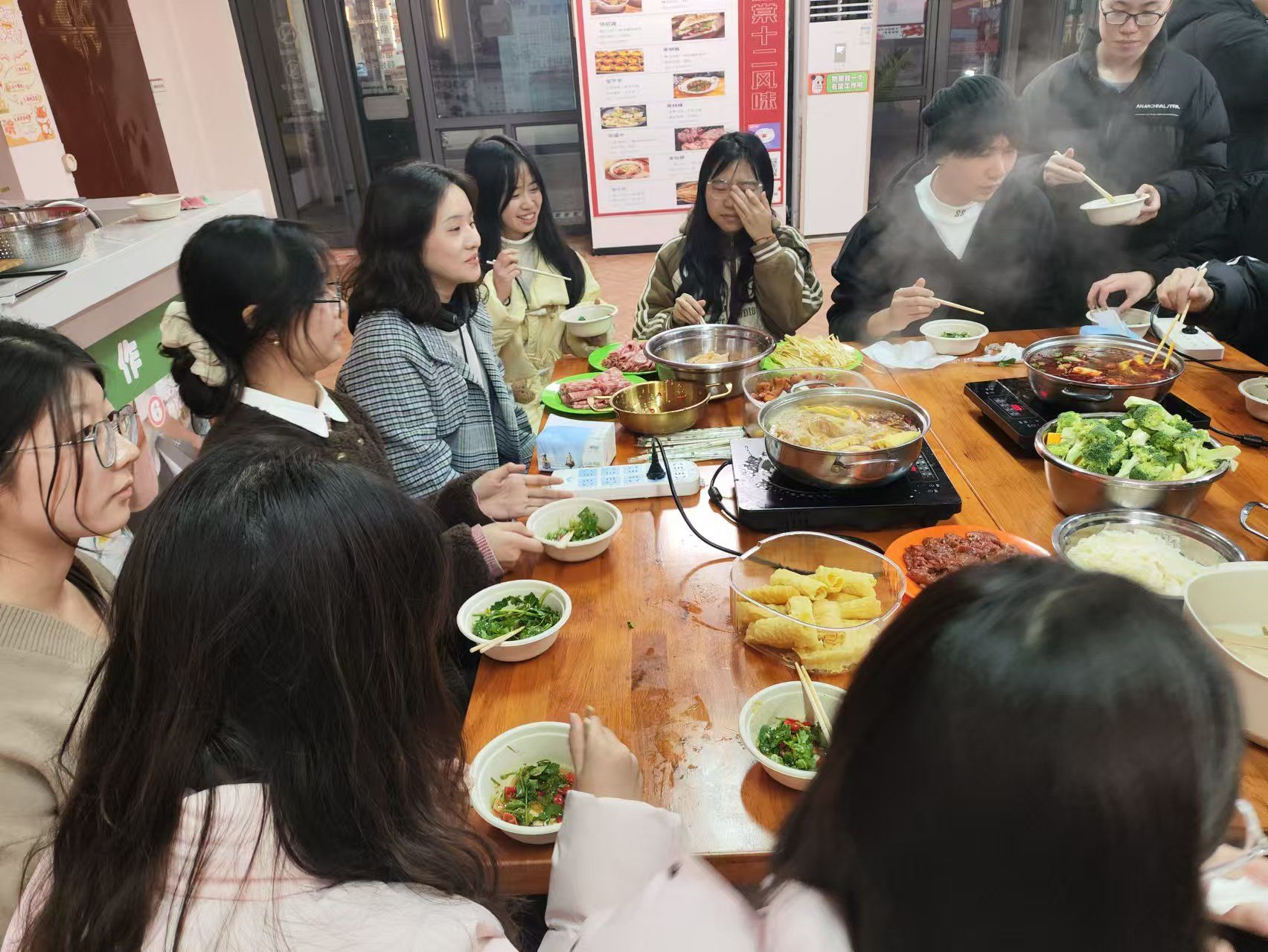2024年12月17日,大数据学院异科导师冉叶虹组织了一场别开生面的火锅活动,在玉棠半糖煮艺烘焙坊热闹展开。此次活动旨在为师生提供一个轻松自由的沟通平台,增进师生感情,为师生校园生活增添温情与乐趣。