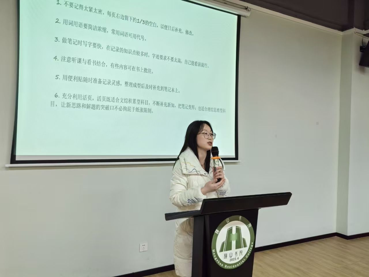 随后,陈美琪老师分享了其独特的学习经验和深刻见解。她强调,优秀的笔记不仅仅是知识的简单堆砌,更是思维碰撞、创新意识萌发的生动记录,体现了记录者对知识的深度思考、独特见解及创新整合能力。陈老师寄语同学们,要秉持严谨认真的学习态度,灵活运用科学方法,探索适合自己的学习路径,以期在未来道路上不断进步,书写个人的学术辉煌。