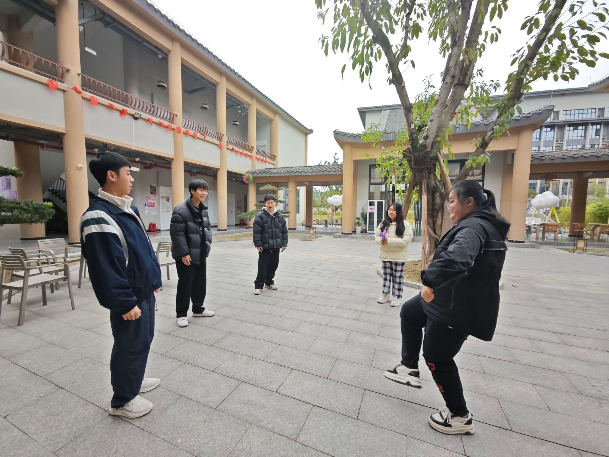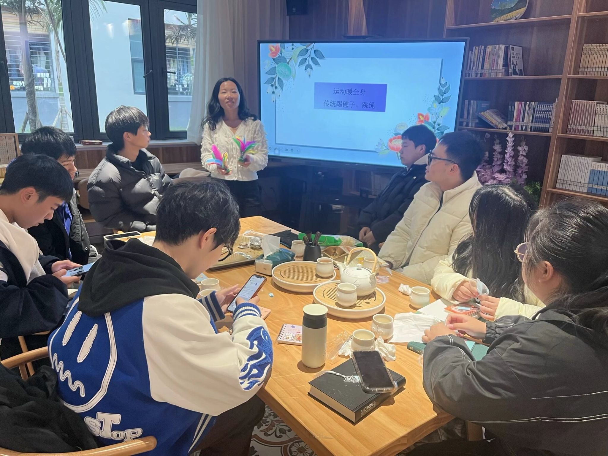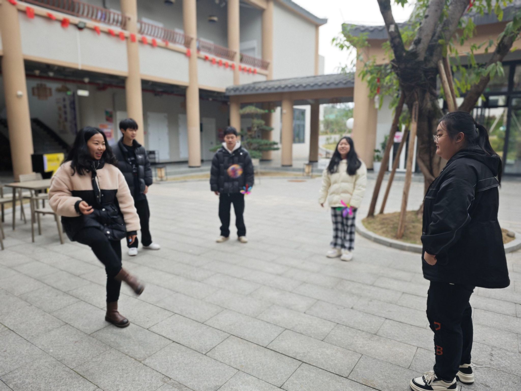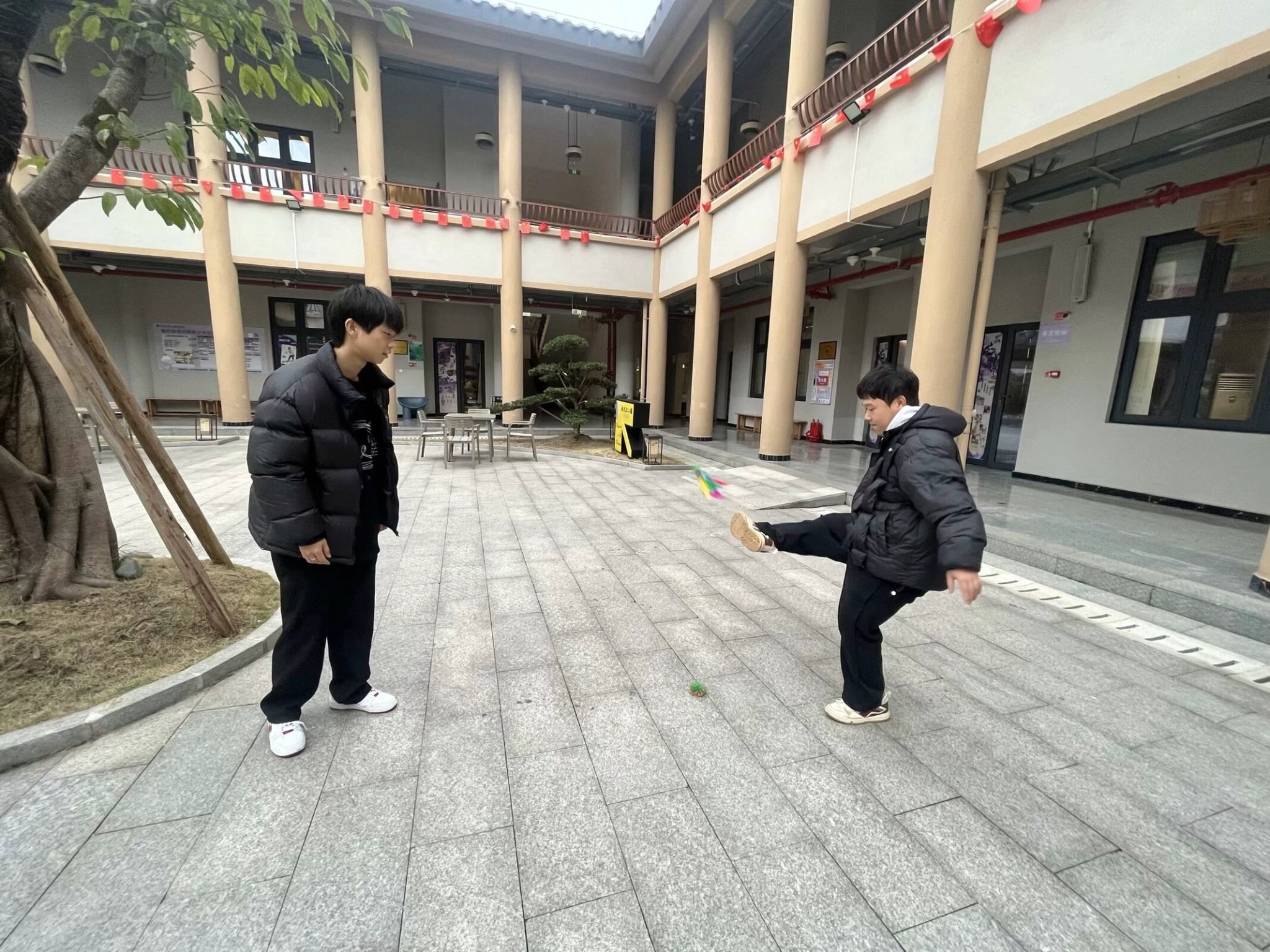同时,为了增加冬日暖意,张老师还为同学们介绍了毽子的相关传统历史,接着,张老师与同学们来到观云书院中庭空间,大家围成一圈,共同踢起了五彩斑斓的毽子。他们时而灵巧地接住飞来的毽子,时而因失误而引来阵阵欢笑。通过这项活动,导师与学生们不仅锻炼了身体,还增进了彼此的了解和信任。