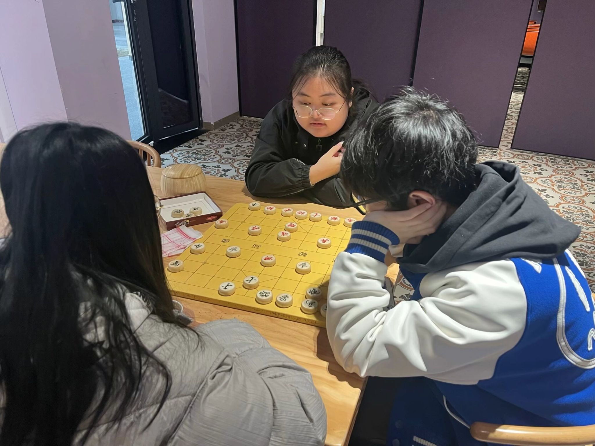 接着,张老师说今天很难得大家在期末时刻一起交流坐坐,借助观云书院的功能室,我们一起下五子棋、象棋等,更好回归内心,认识对方。在棋盘上,同学们相互斗智斗勇,时而陷入沉思,时而露出得意的笑容。通过下棋,同学们不仅学会了如何冷静思考、分析问题,还深刻体会到了“棋如人生”的道理。张老师则通过棋局,观察学生的性格特点,给予他们有针对性的心态引导和建议。