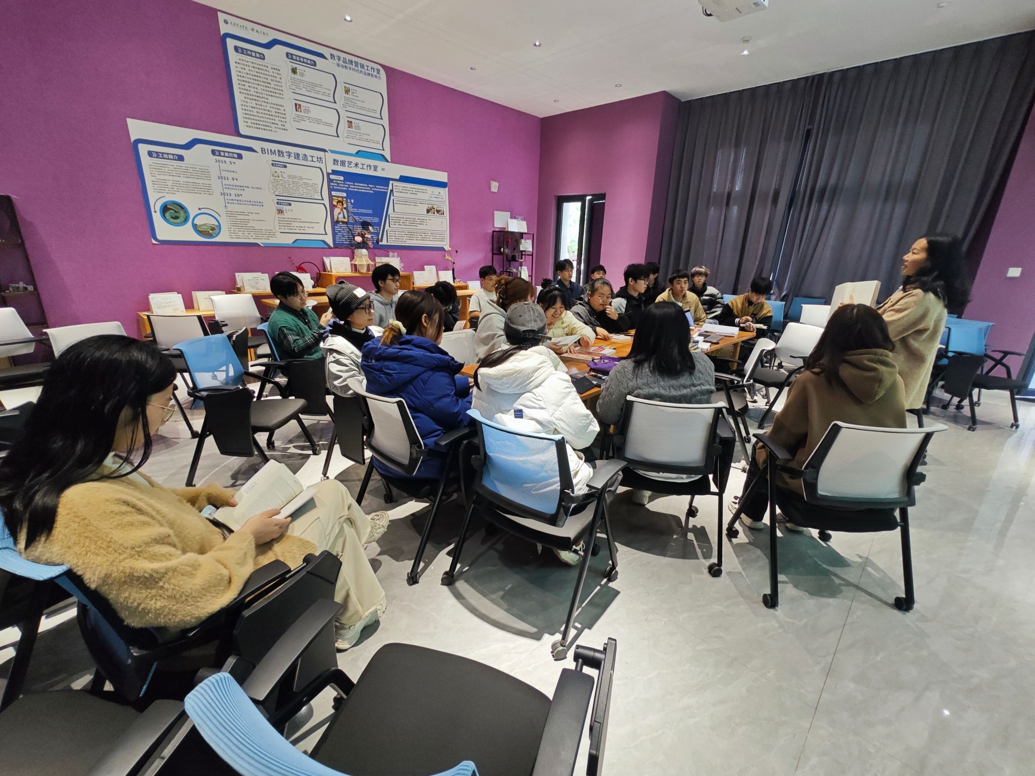 为积极响应学校全生异科导师育人工作,更好让学生参与商业大咖传记阅读计划,11月21日12:30,张红老师与她的34位大数据学院2024级数字媒体技术专业专升本4、5班的同学们,在綦江校区观云书院立冬朋辈交流空间,开展了“读大咖的人生,懂自己的生活”主题的师生阅读会。