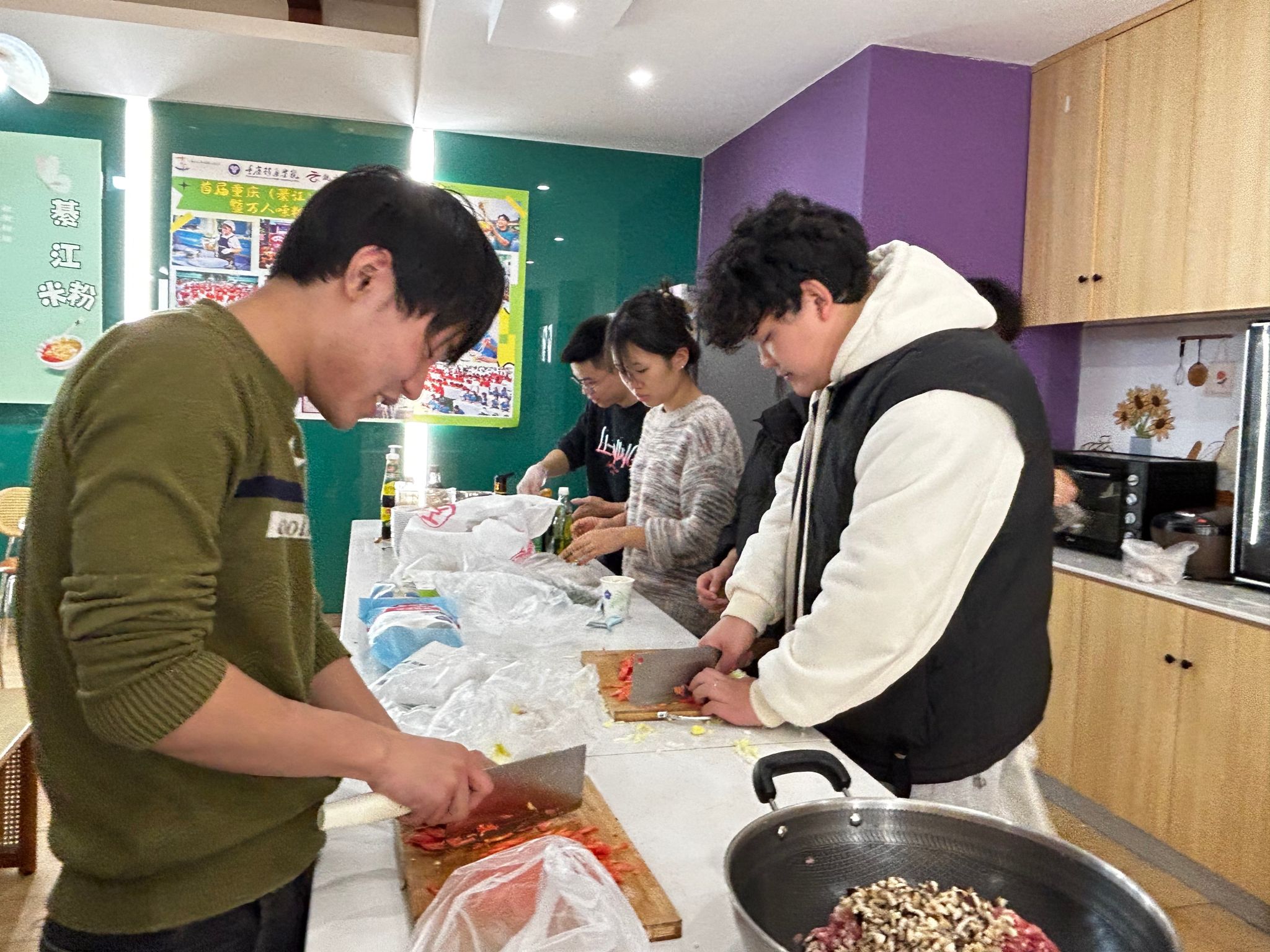 活动从下午四点开始,书院厨房里一片热闹景象。同学们分工合作,有的洗菜,有的剁馅,还有的开始现场学习包饺子。谢国庆老师也加入其中,和大家一起忙活。师生们一边动手,一边与彼此分享冬至习俗的来历和自己小时候的节日故事,气氛十分融洽。