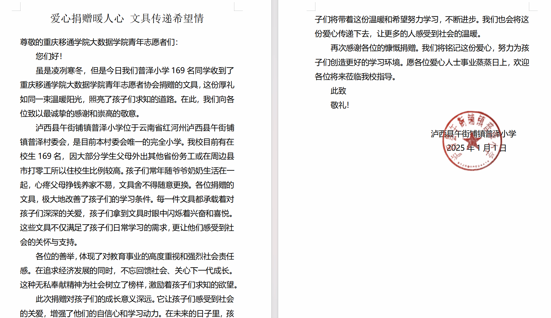 “一粥一饭,当思来之不易;半丝半缕,恒念物力维艰。”秉持着珍惜粮食的理念,大数据学院青年志愿者协会组织志愿者积极参加由中国光华科技基金会发起的“益”起守护中国粮活动,最终号召3749人参与,光盘48507次,节约粮食1.84吨,减少碳排放7.13吨,最终获得由基金会提供的节粮礼金4300余元。为更好的传达志愿服务初心,活动中产生的节粮礼金,大数据青协最终全部用于为云南省红河哈尼族彝族自治州泸西县的普泽小学购置学习用品,以实际行动传递爱心,助力孩子们的成长。感谢大家对活动的支持和积极参与,当初你们节约的每一粒粮食,现在都变成了孩子们手中的文具!