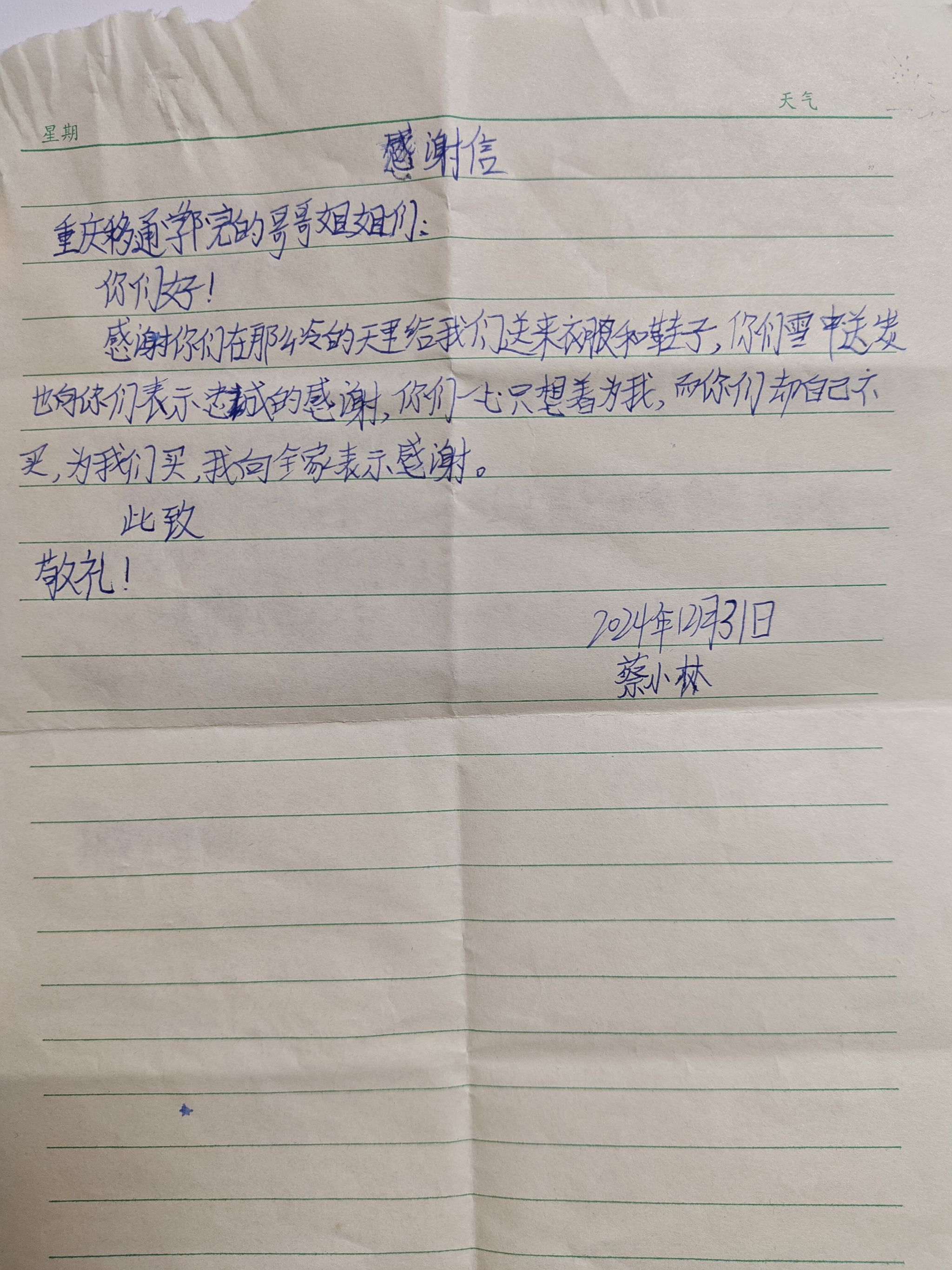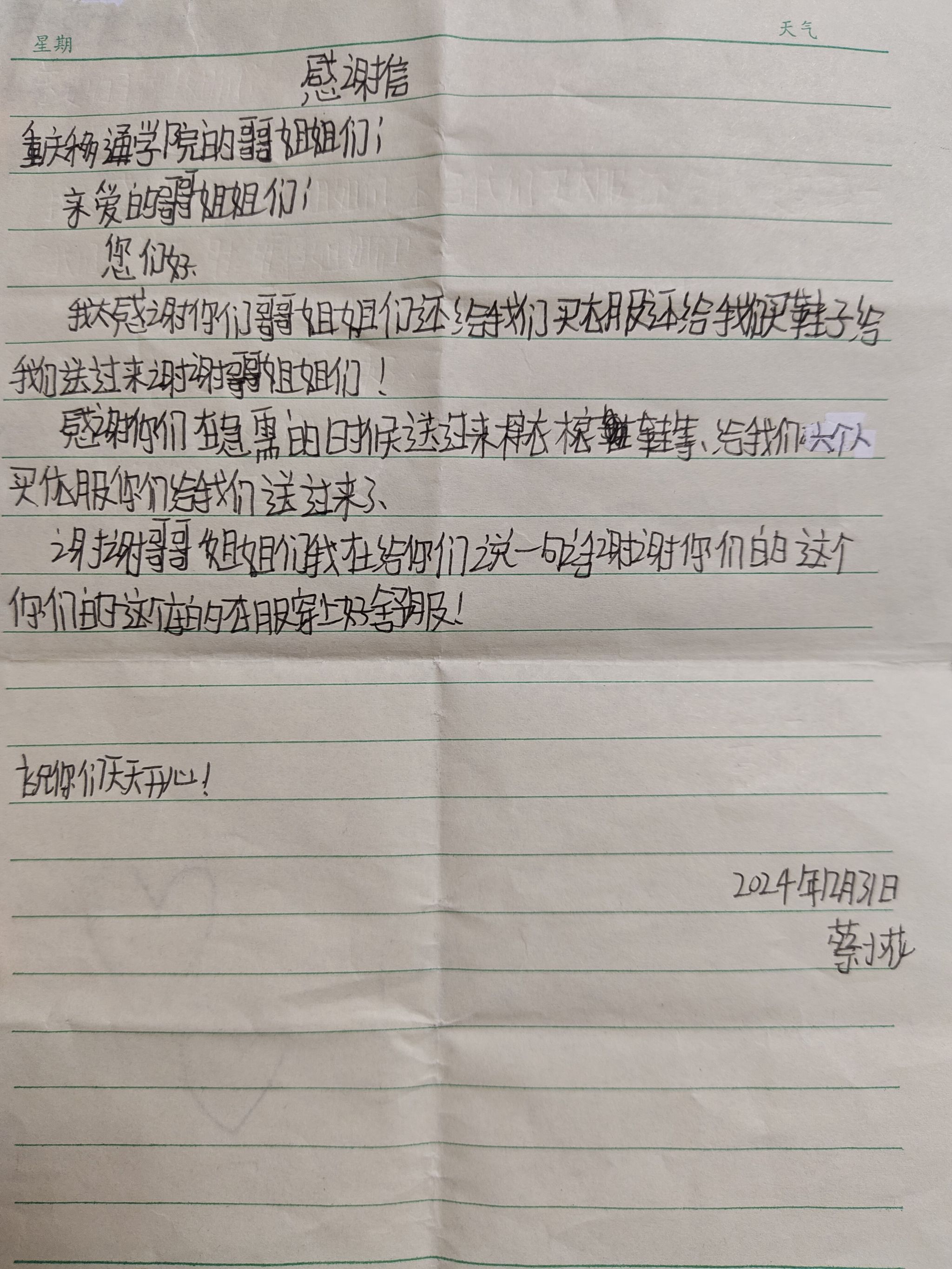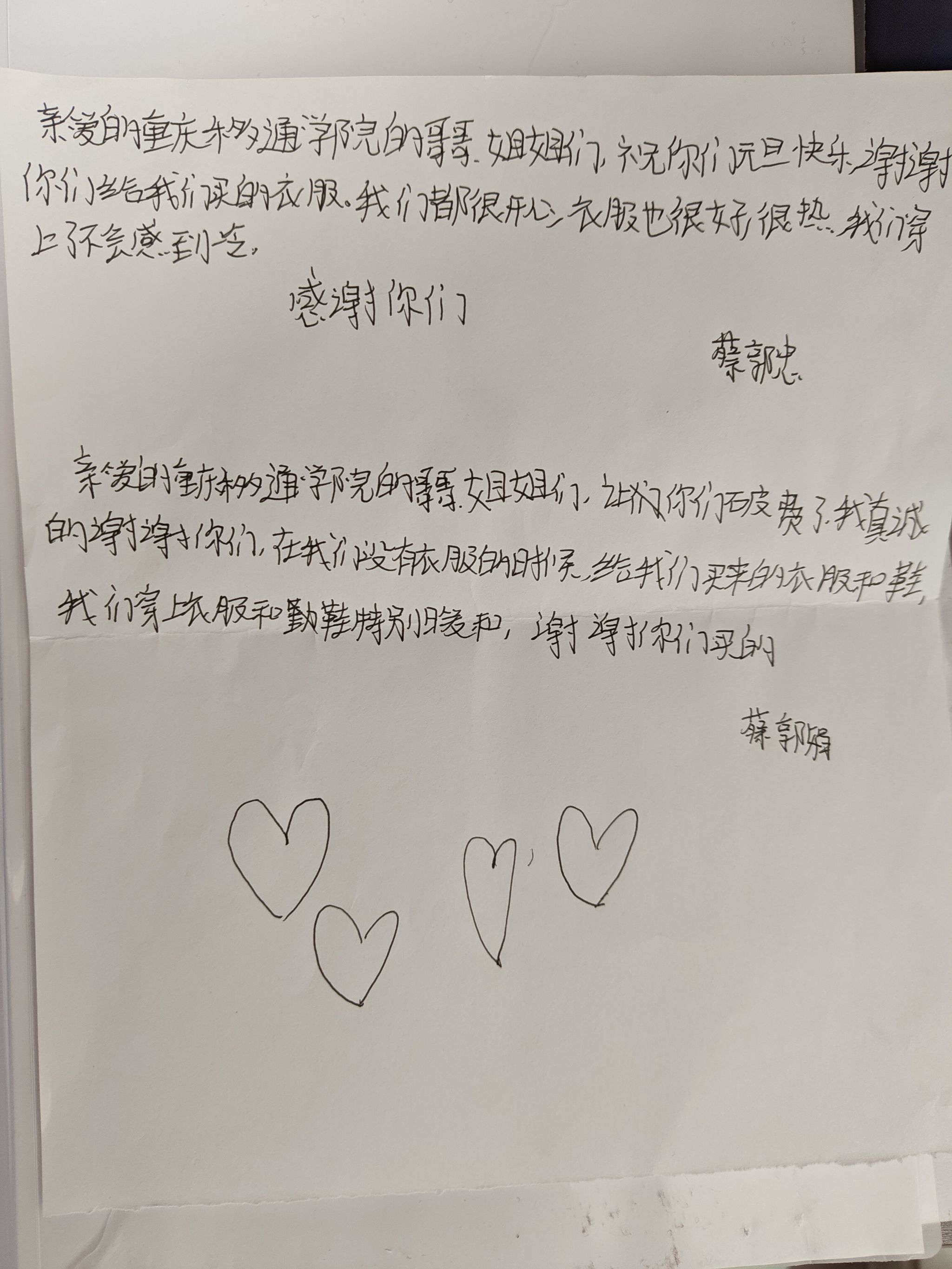 根据小朋友们的实际需求和喜欢的颜色,青协干部购买了棉衣和加绒运动鞋,希望他们能够幸福、快乐地度过寒冷的冬天。孩子们收到这些崭新的衣服和鞋子时,脸上露出灿烂的笑容,也通过稚嫩的文字,向志愿者们表示感谢。“谢谢哥哥姐姐们送来的新衣服和新鞋子,好暖和!好舒服!”“感谢!感谢!感谢!”