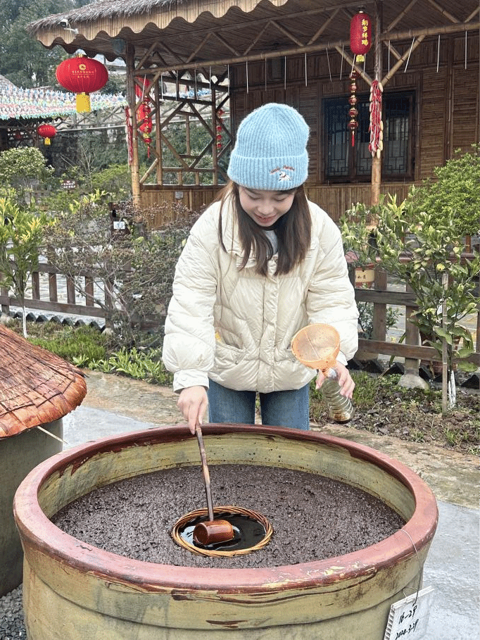 2025年2月14至19日,邓渝婷同学全身心投入南川大观园三不加酱油厂非遗酿造基地的乡村振兴实践,此行旨在深入了解并助力家乡特色产业。在酱油厂师傅的指导下,她深入探索了酿造流程。从筛选非转基因大豆开始,体会到优质原料的重要性。接着学习调控制曲车间的温湿度,确保微生物健康生长。在发酵池旁见证了酱油的奇妙转变,深刻感受到传统技艺的魅力。此外她不仅担任临时讲解员,向来访者解说非遗技艺。同时还参与短视频拍摄,记录酿造精彩瞬间,并通过社交媒体传播,成功提升了酱油厂的品牌影响力。