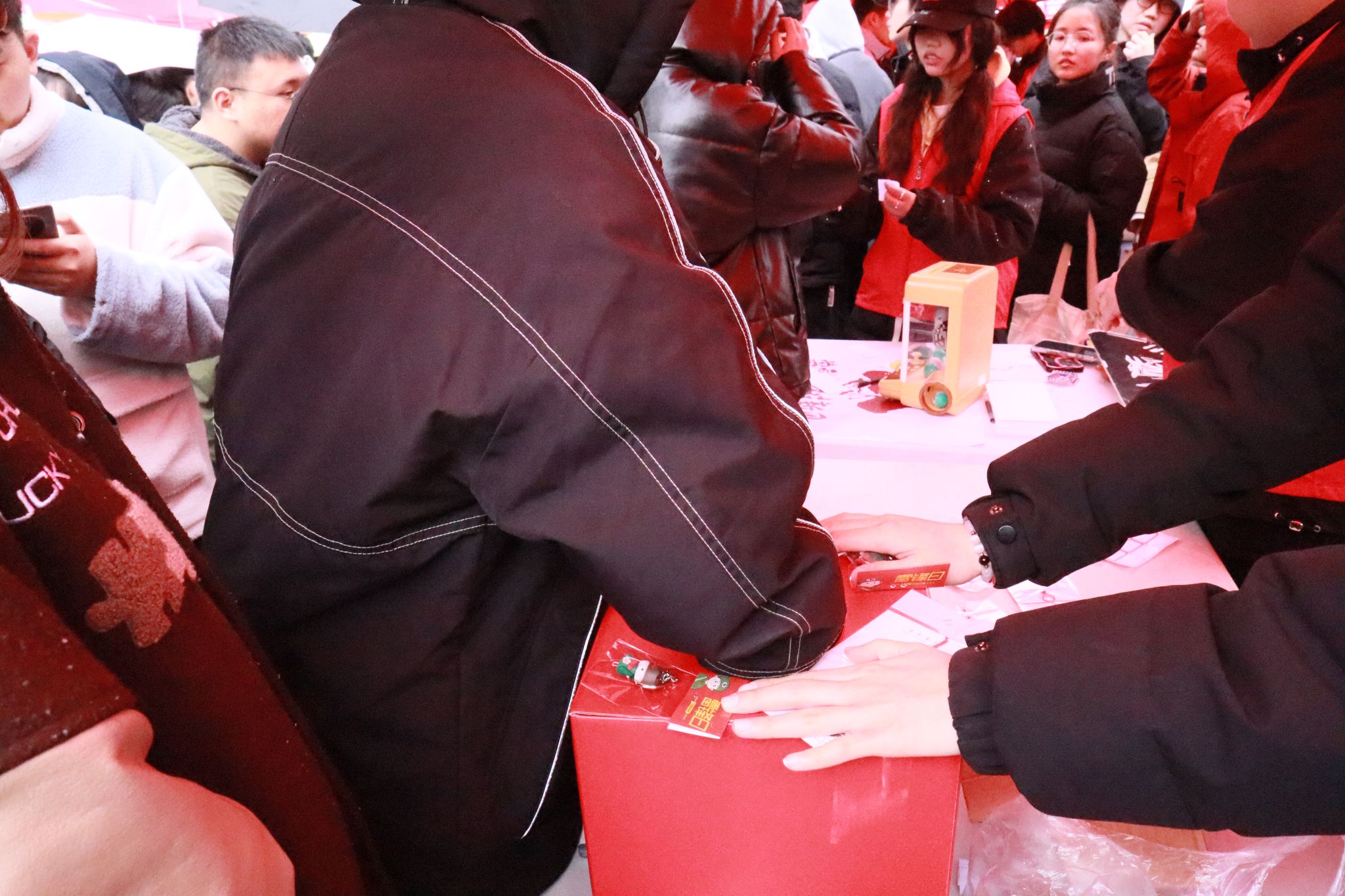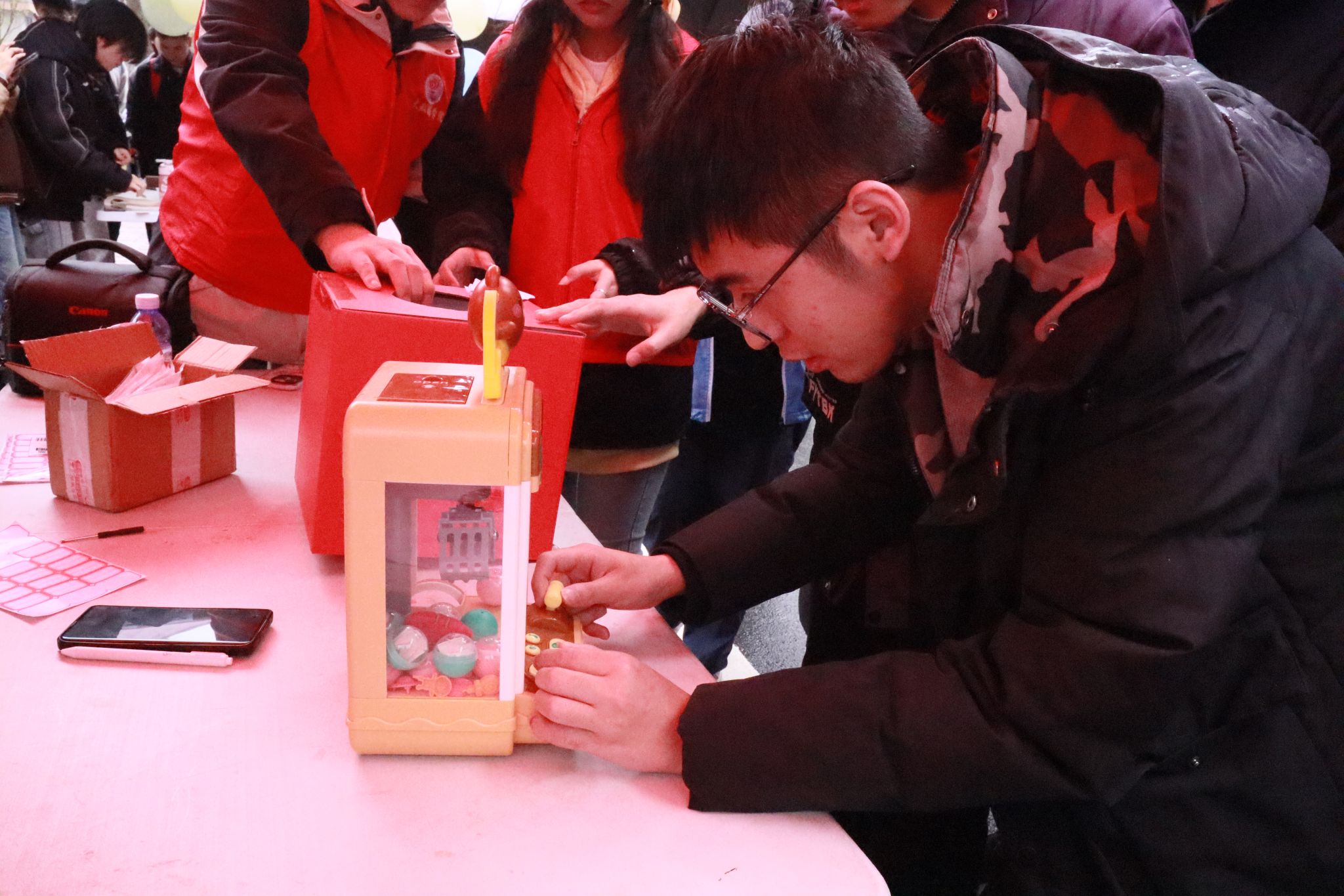 尽管活动当天下着雨,但学生们的热情丝毫未减。中午十一点,志愿者们早早来到贤者楼前广场,穿戴好红马甲,迅速布置活动场地。活动现场设置了“雷锋盲盒”互动环节,参与者可以将自己的需求写在贴纸上,附上联系方式,放入扭蛋中投递至盲盒箱。随后,参与者转动扭蛋机,抓取一个扭蛋,查看他人的需求。如果能够帮助对方,参与者与联系工作人员进行对接,双方达成帮助意向后加入进度群,并获得盖章机会。