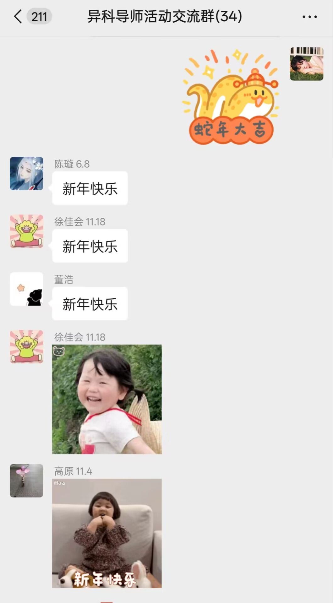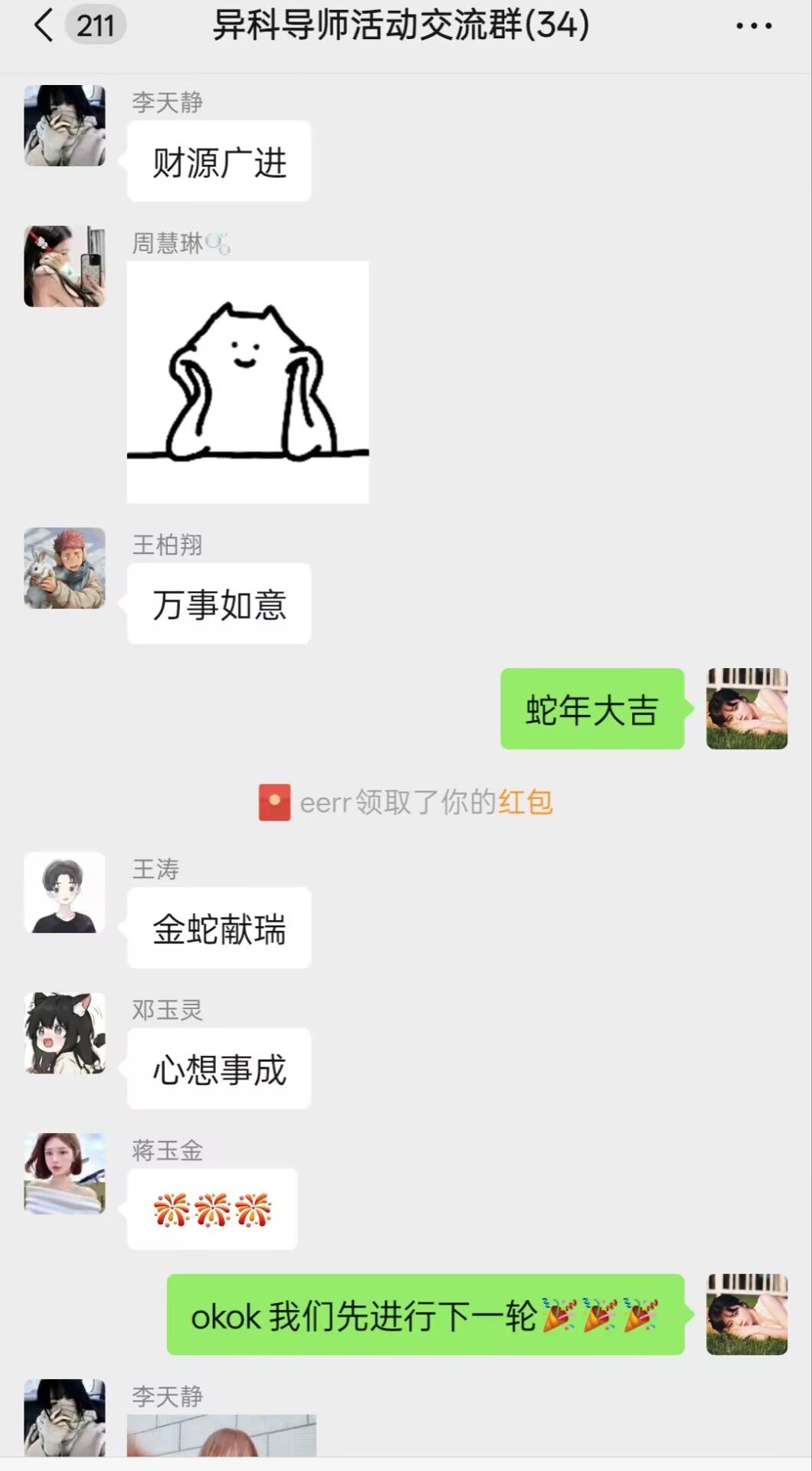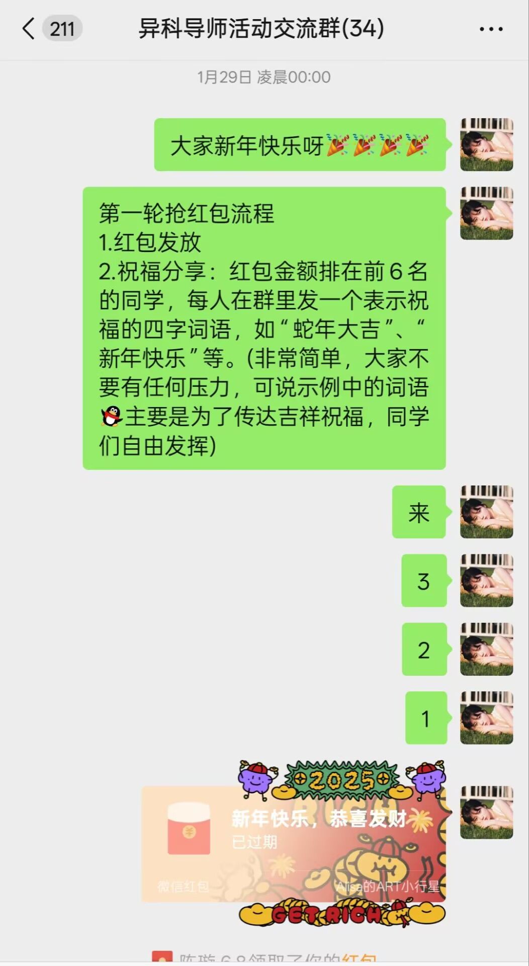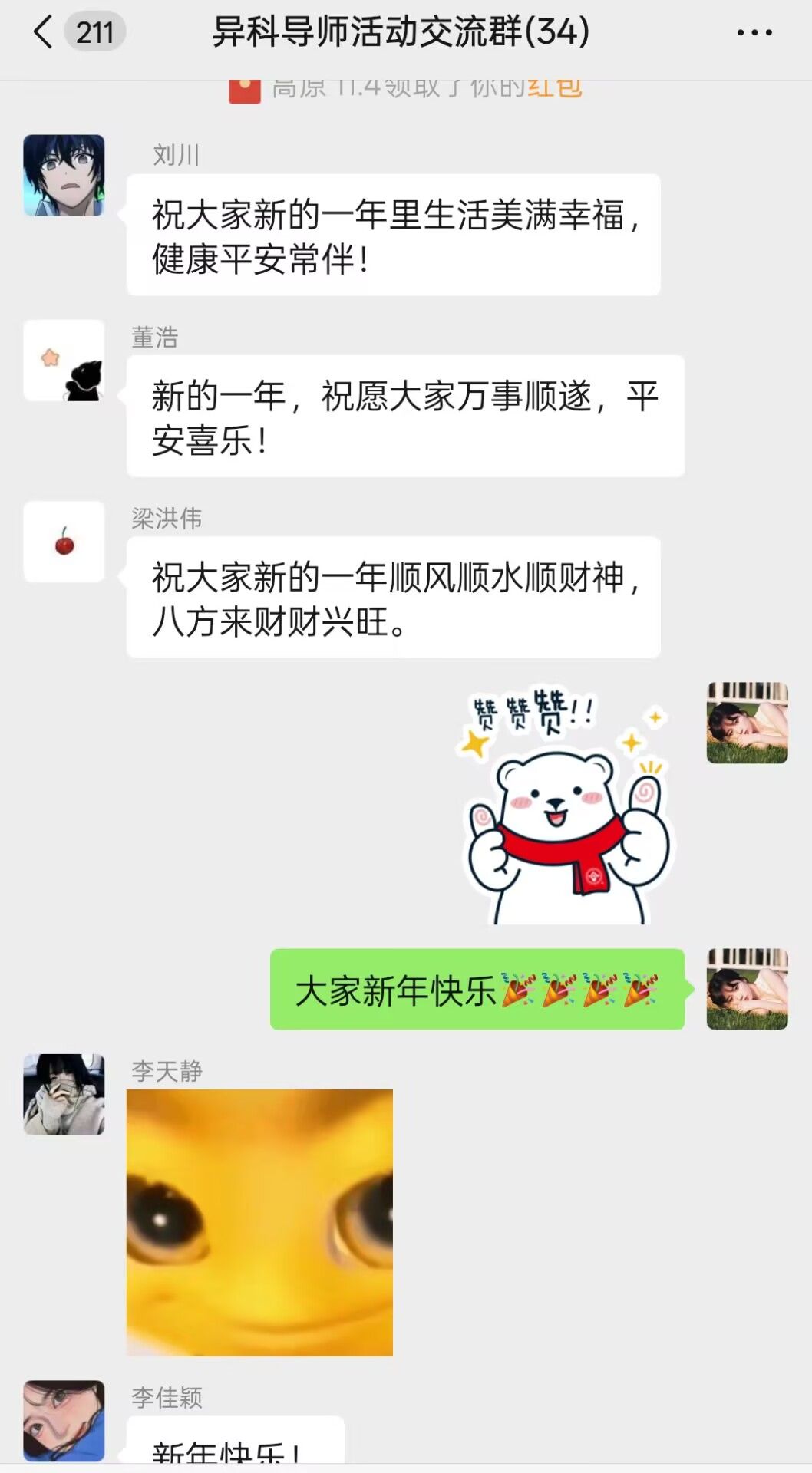 活动接近尾声,负责发放红包的同学代表周冬杨老师向异科班全体同学表达了新春的祝福,并感谢大家的积极参与和热情支持。最后,同学们共同在群内发送了“新年快乐”的祝福,为本次活动画上了圆满的句号。