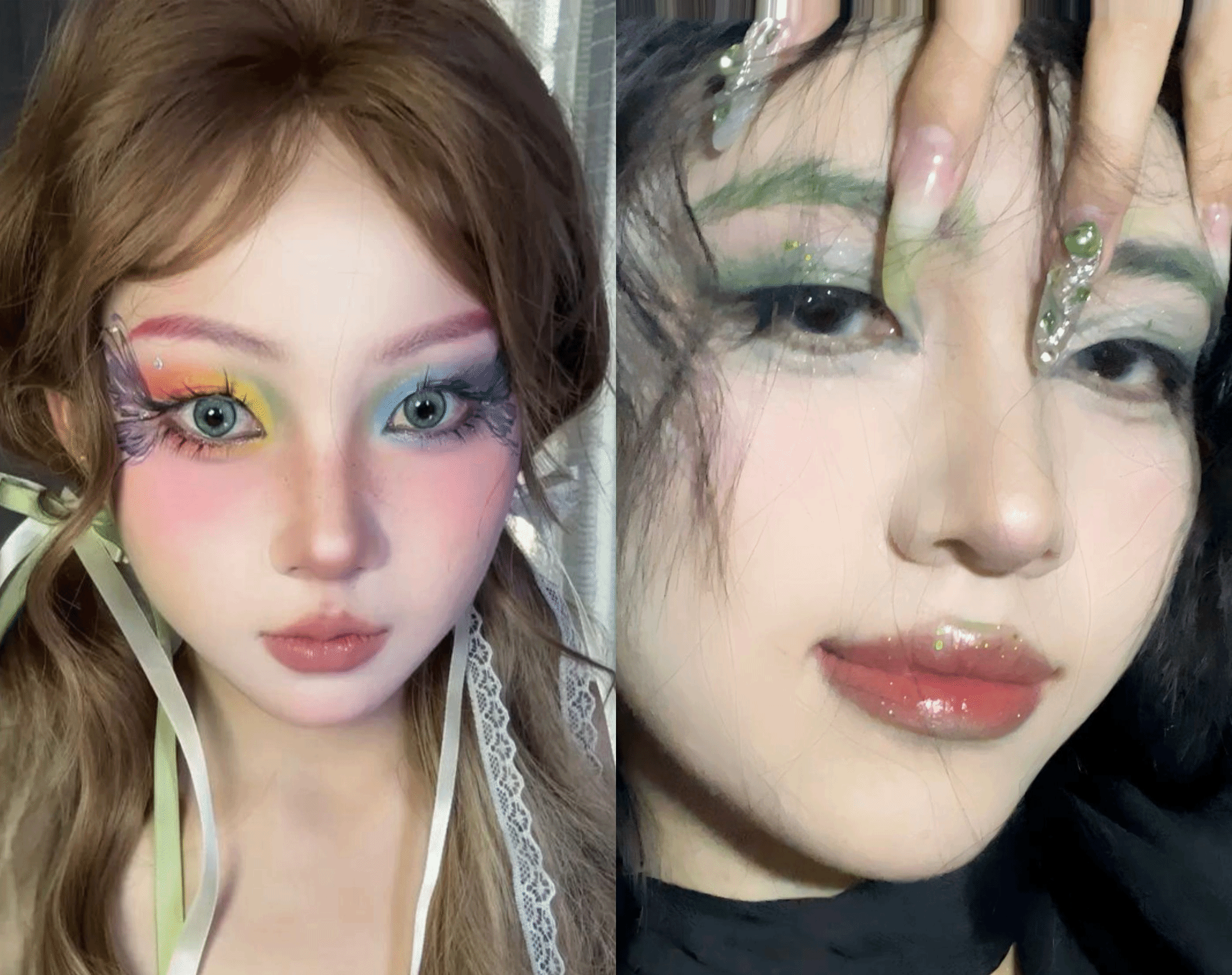 蔡润堃同学的作品凭借绚丽色彩与创意设计吸睛无数。妆容以大胆的彩虹色系为主,色彩过渡自然,眼妆部分还添加了精美的蝴蝶点缀,使双眸宛如灵动蝶翼,极具梦幻感。腮红采用眼下大面积的粉色调,营造出甜美俏皮的氛围。发型方面搭配浅棕色卷发和丝带蝴蝶结,充分展示了对色彩的精妙运用和独特的妆造巧思。