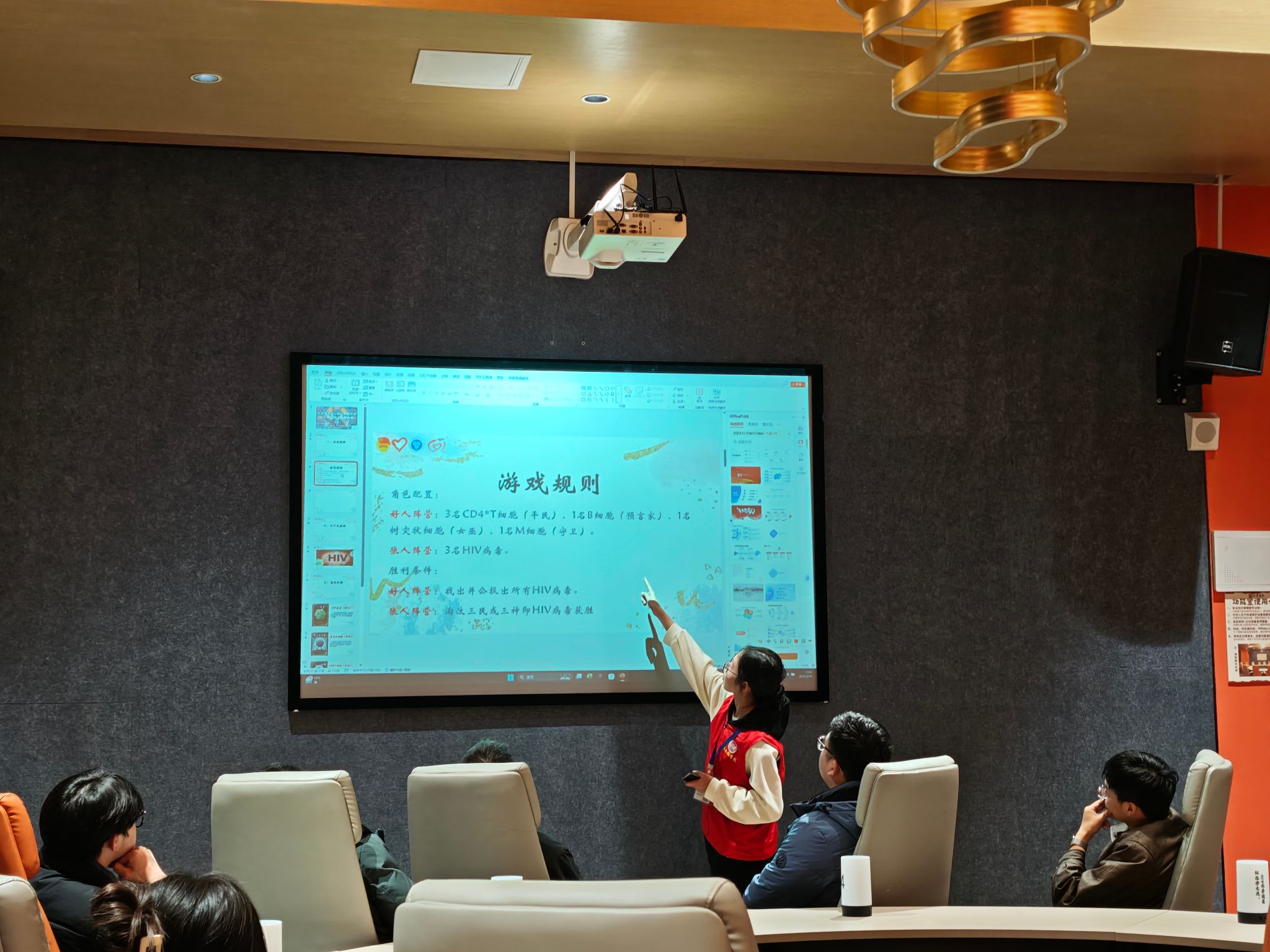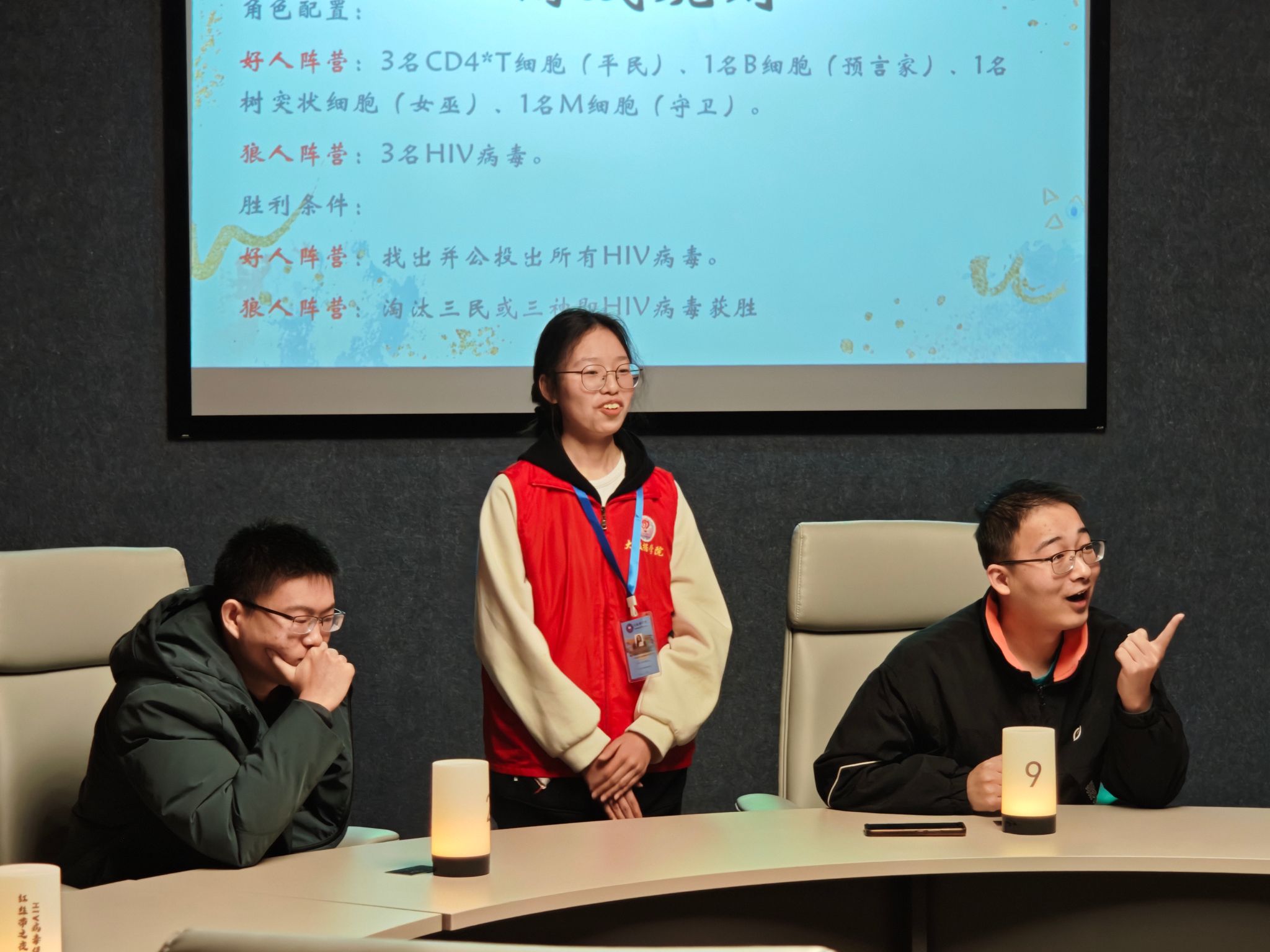活动开始前,工作人员播放了HIV病毒感染过程的动画视频,将艾滋病知识与趣味桌游巧妙结合,生动展现HIV病毒传播机制,激发参与者兴趣。随后,工作人员详细讲解细胞版狼人杀规则,确保游戏顺利进行,为活动营造了有趣且富有教育意义的氛围,让参与者在轻松愉快的游戏中增长知识,提升了活动的吸引力和实效性。