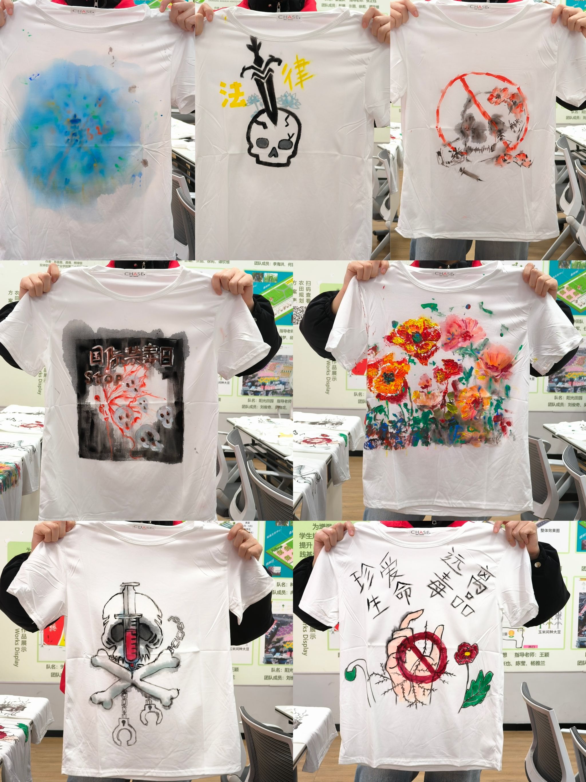 随着活动接近尾声,一件件饱含着同学们心血与禁毒愿景的文化衫被一一收集起来。这些作品不仅是艺术创作的结晶,更是同学们坚定禁毒决心的有力证明。通过此次线下绘制文化衫的活动,同学们不仅深入学习了禁毒知识,更显著提升了自身的禁毒意识。未来,相信同学们能将“无毒青春”的理念传递给更多人,为校园禁毒事业添砖加瓦,贡献一份力量。