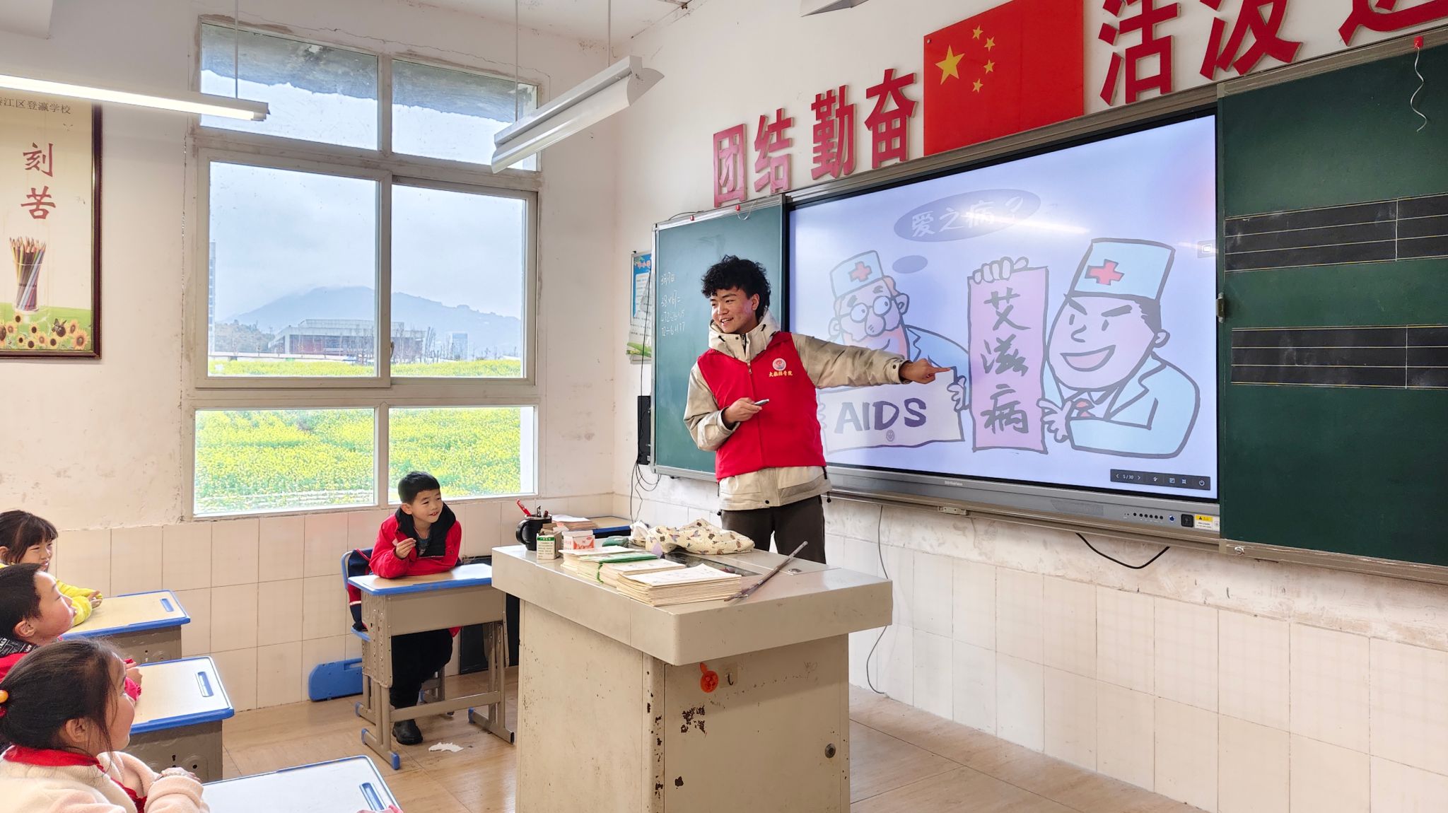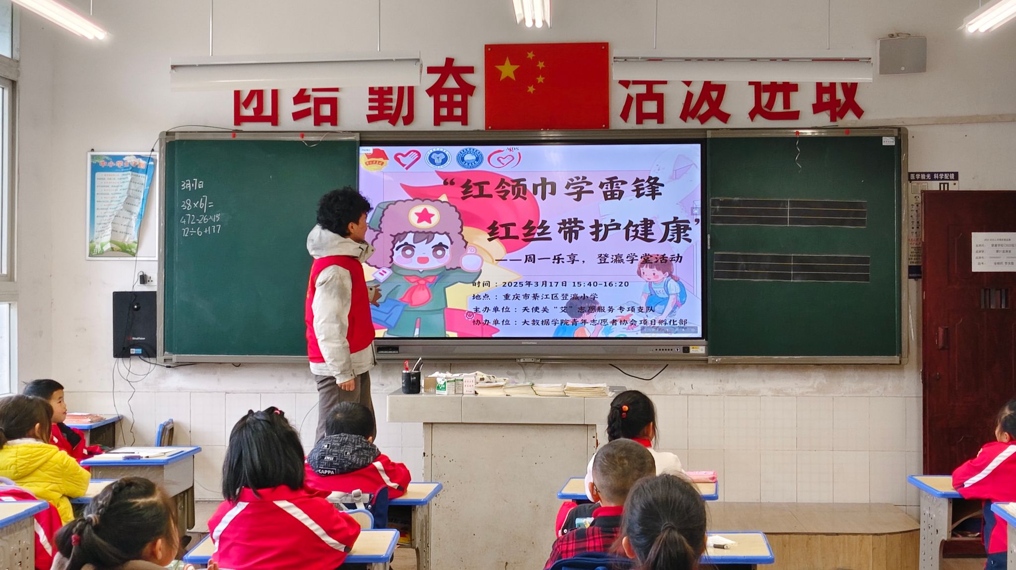 2025年3月17日,大数据学院天使关“艾”志愿服务专项支队与项目孵化部志愿者们携手走进綦江登瀛小学,开启“红领巾学雷锋,红丝带护健康”周一乐享登瀛学堂活动。此活动旨在为小朋友们科普艾滋病防治及学雷锋知识,传递温暖关爱,引导小朋友们了解艾滋病知识,消除对艾滋病患者的歧视,培育关爱他人意识。