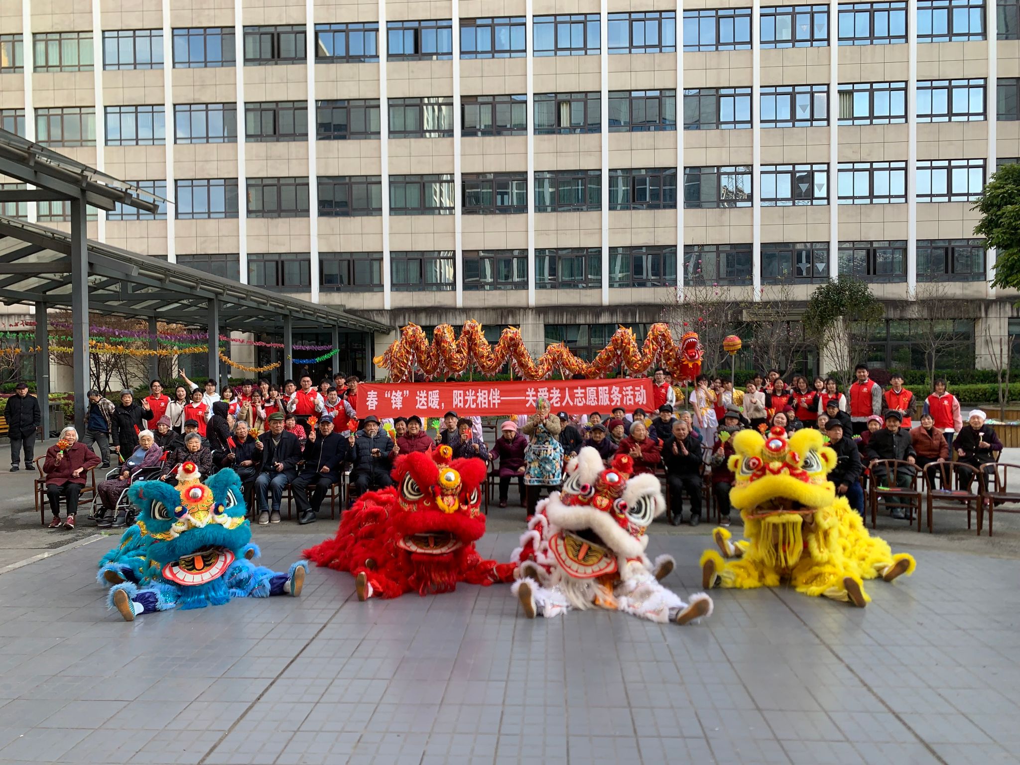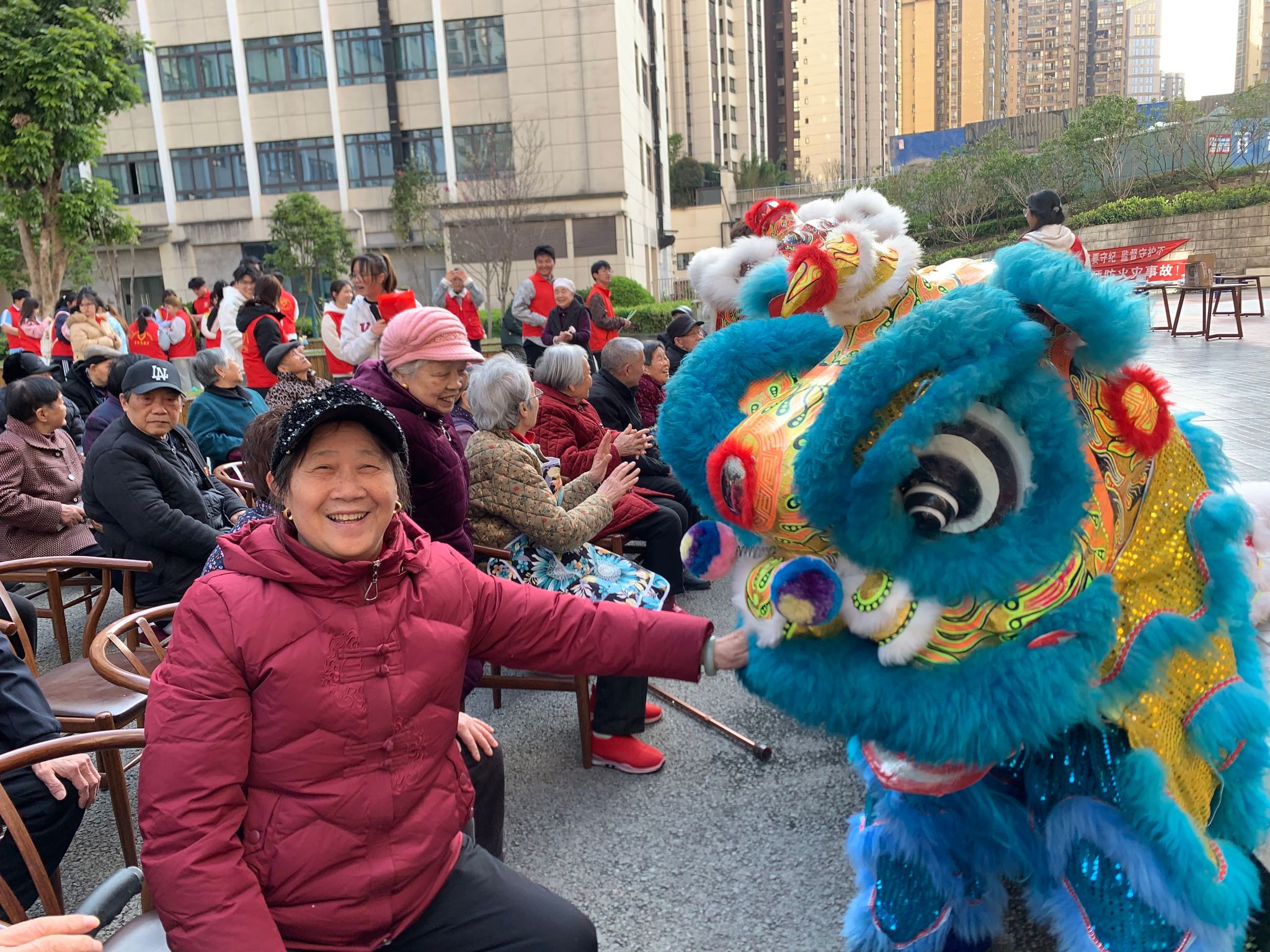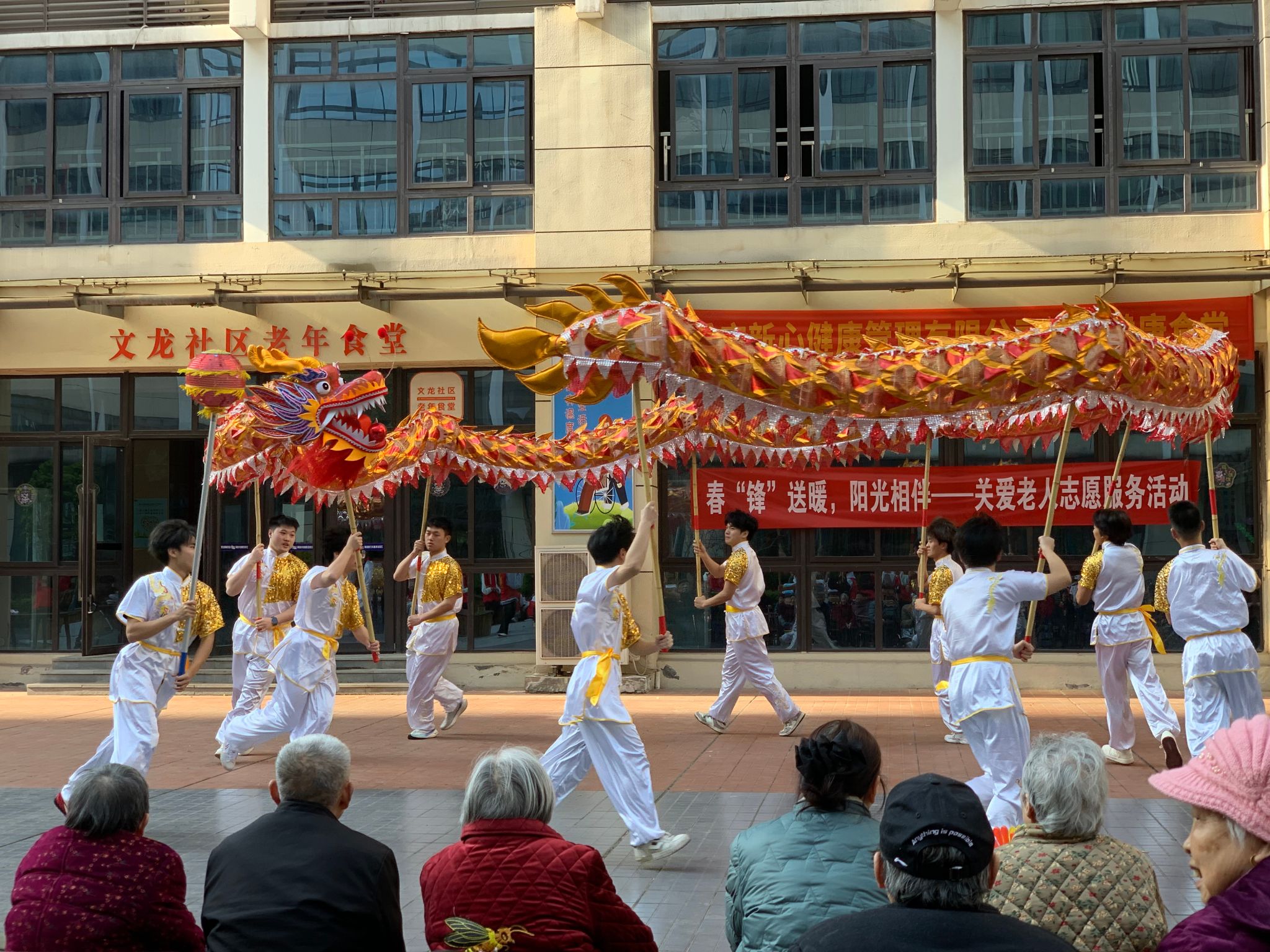 随后,舞龙舞狮社团的同学们为老人们呈上了妙趣横生的民俗表演。活灵活现的舞狮时而俏皮眨眼,时而轻盈跳跃,与老人们进行了温馨亲密的互动,其憨态可人的模样逗得现场笑声连连。紧接着,一场气势恢宏的舞龙表演震撼上演,只见巨龙在铿锵有力的鼓点伴奏下,时而如蛟龙出海般矫健有力,时而似游龙戏珠般灵动自如,充分展现了中华传统文化的独特韵味与非凡魅力。老人们在这欢声笑语中深切感受着传统文化的深厚底蕴,脸上绽放出幸福满足的笑容,现场充满着温馨与和谐的气氛。