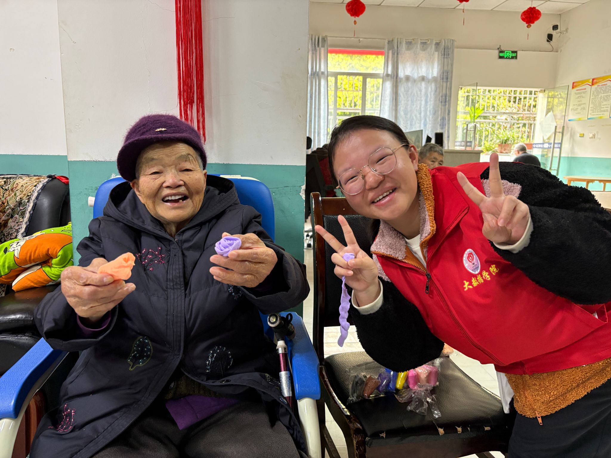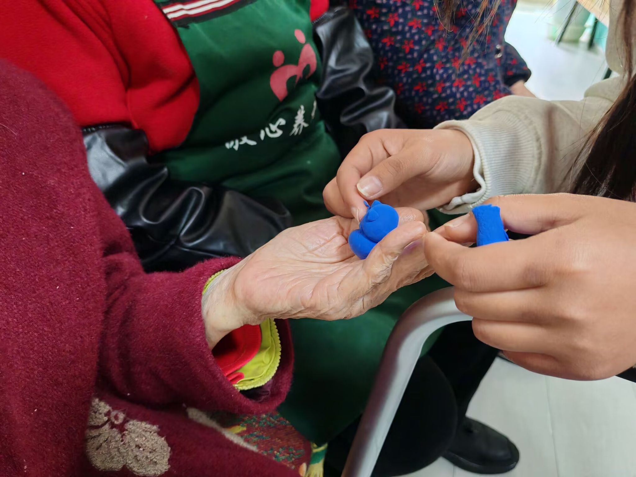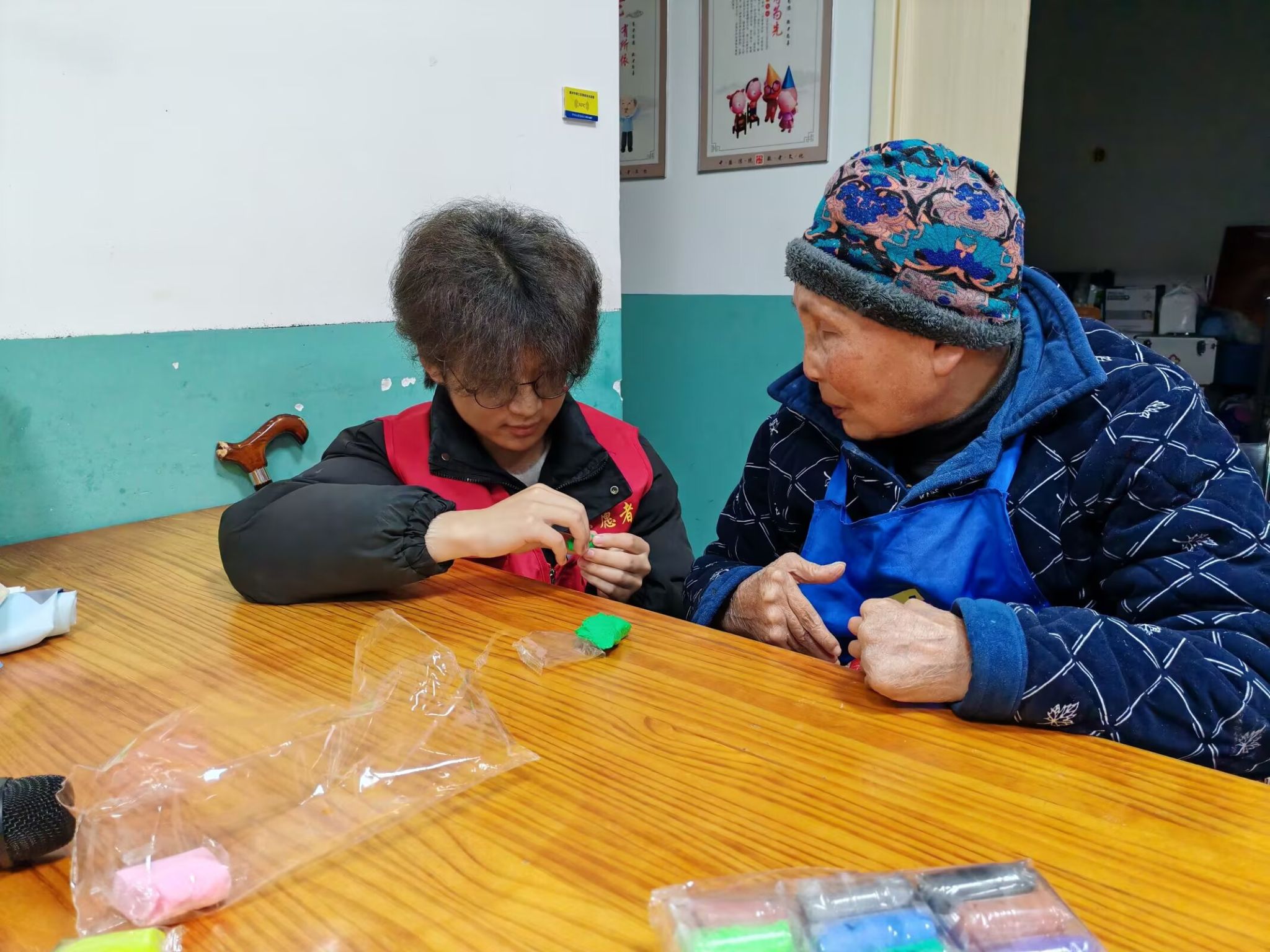 欢乐的时光总是短暂,但关爱老人的行动不会结束。活动最后,志愿者与老人们一起进行手工创作——粘土制作,老人们脸上绽放孩童般笑容,沉浸其中。一位老人感慨地说:“今天的活动真让我们开心,感受到了年轻人的活力和关心,希望以后能多有这样的机会聚在一起。”另一位老人也补充道:“你们的陪伴就是最好的礼物,希望你们能常来看看我们。”