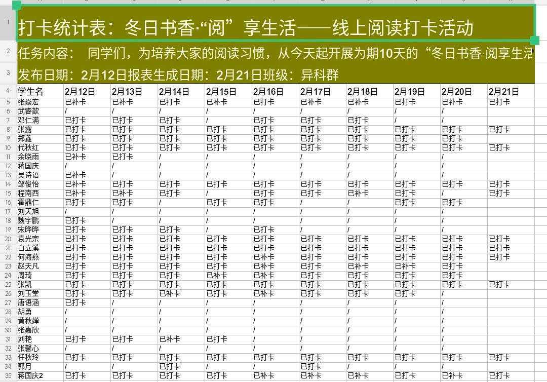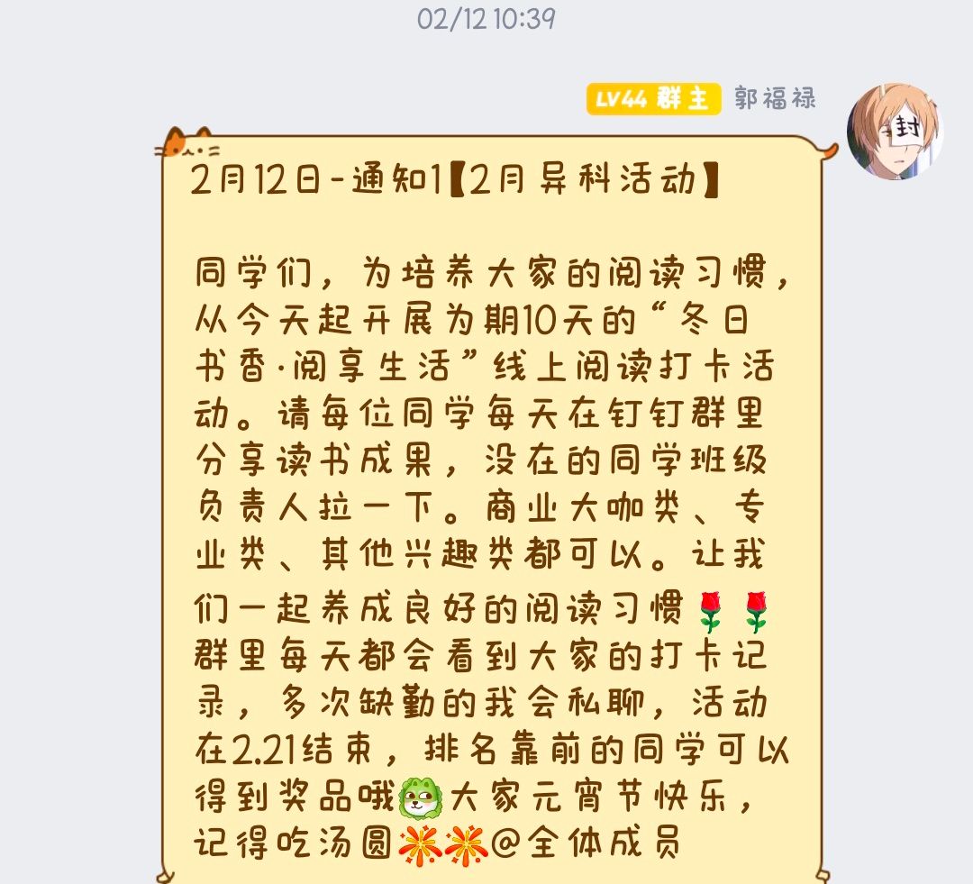 为培养学生的阅读习惯,营造浓厚的学习氛围,郭福禄老师于2月12日发起了为期10天的冬日书香·“阅”享生活——线上阅读打卡活动。此次活动由郭老师精心策划并组织,得到了异科班学生的积极响应和热情参与。