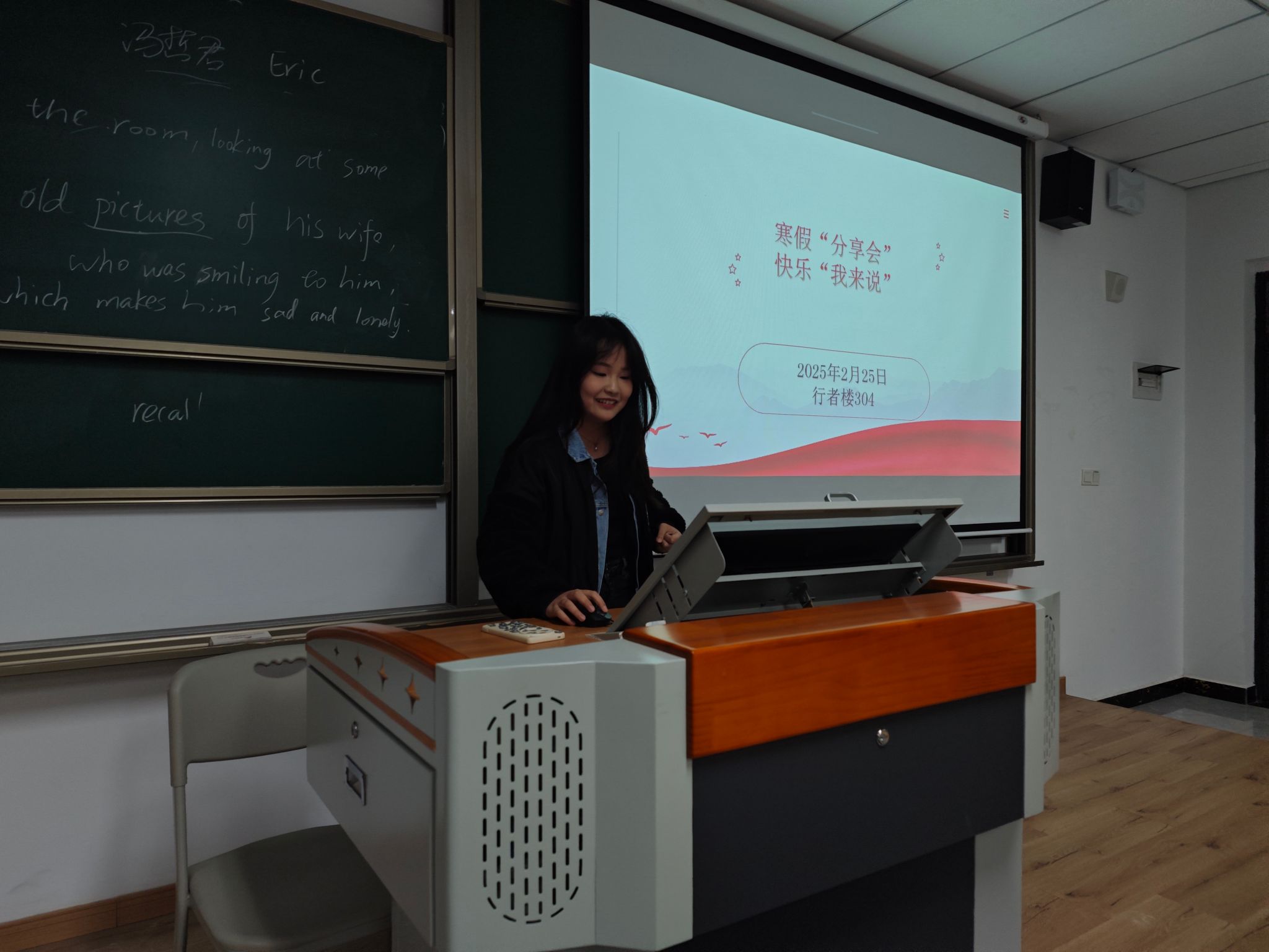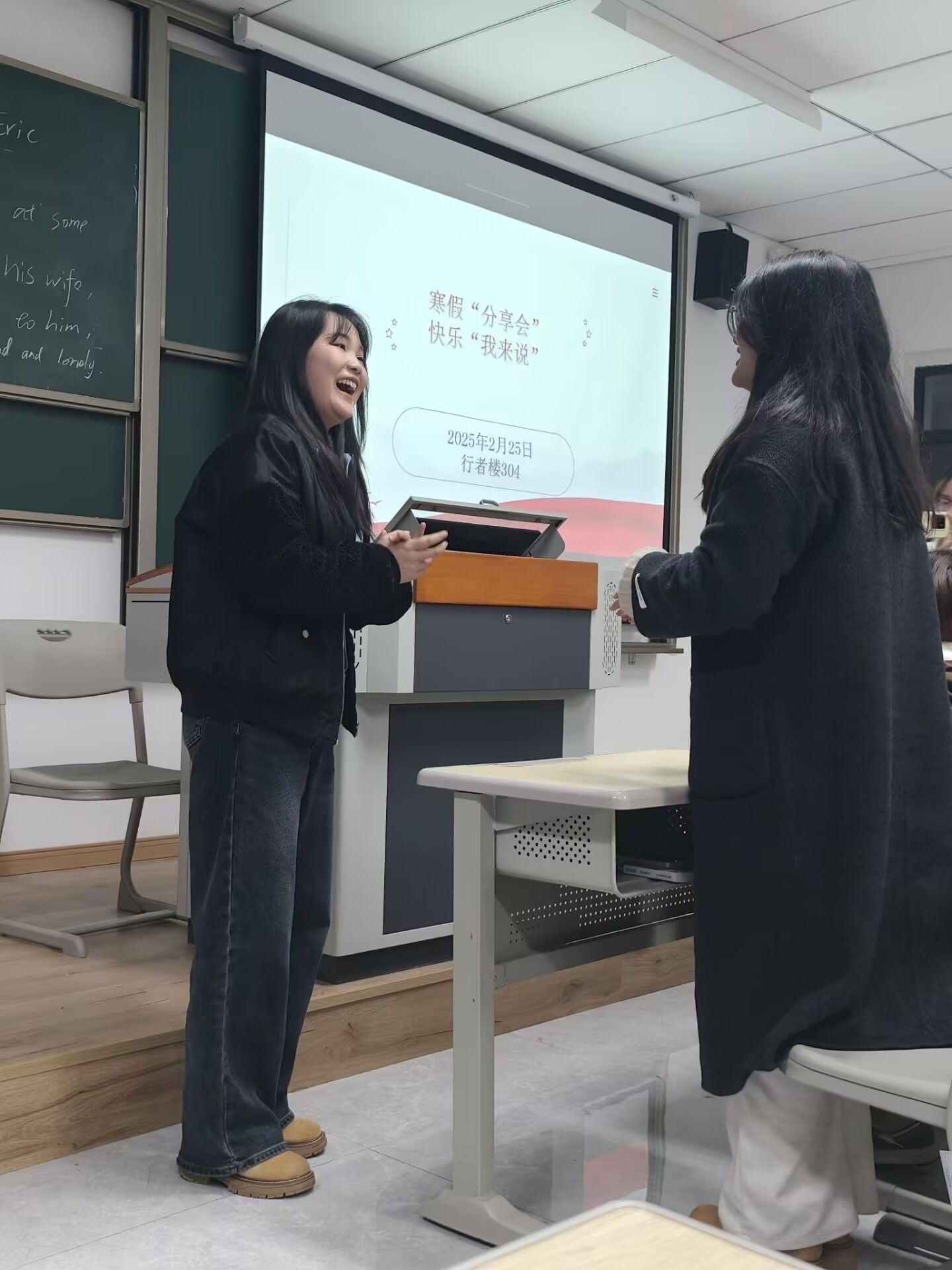 2025年2月25日晚8点30分,行者楼304的教室里洋溢着欢声笑语,2024级数科5-6班异科班的同学们正在进行“寒假分享会,快乐我来说”的寒假主题分享会。本次活动在陈安鹏老师的指导下由班委陈思竹同学主持。