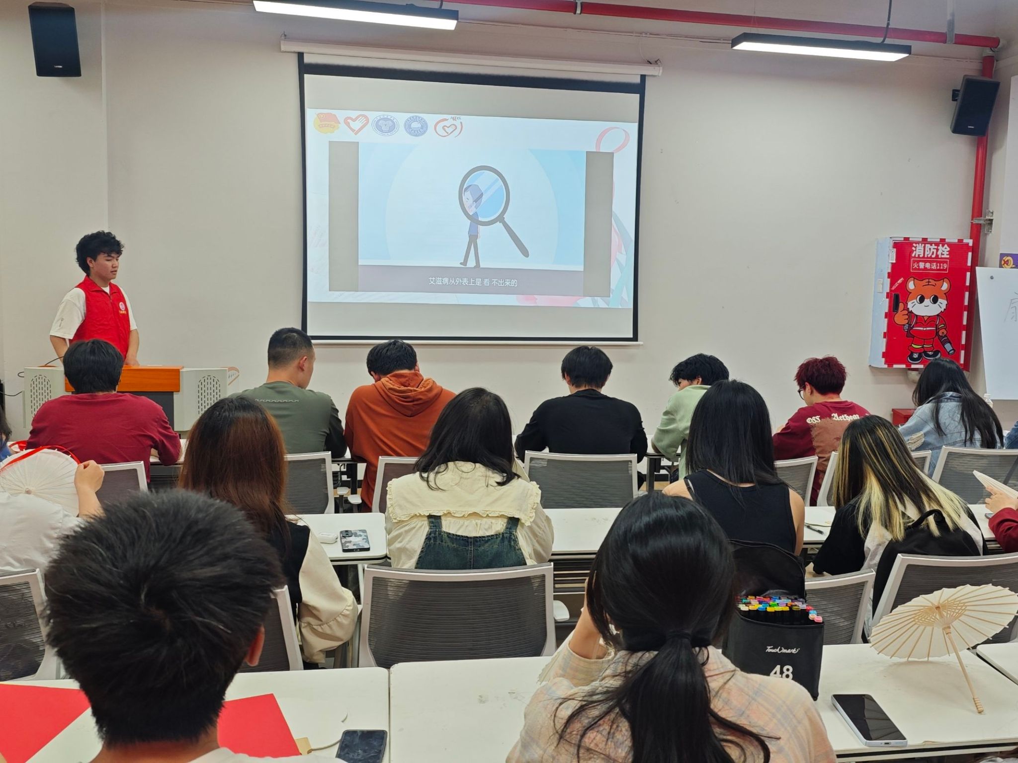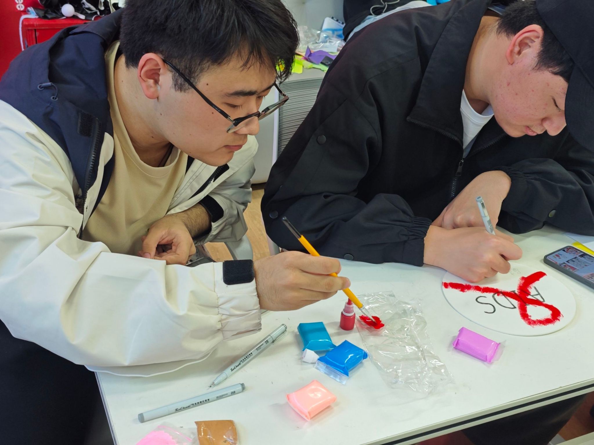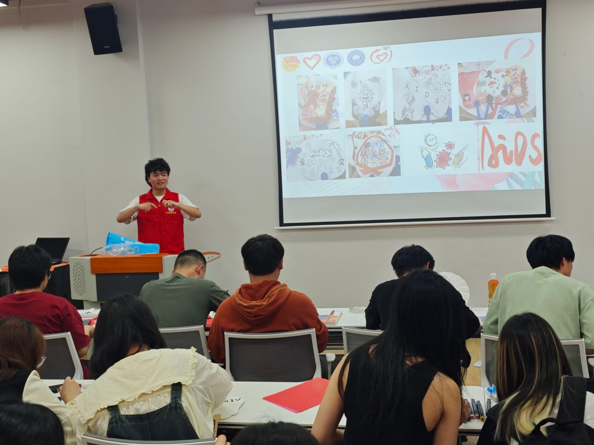 活动开始,参与者观看防艾科普视频。视频生动讲解艾滋传播、预防及患者关爱,真实案例与专业解读让大家全面认识艾滋,强调检测重要性,鼓励主动检测早治。此环节为后续DIY制作奠定理论根基,使参与者在动手前思路更明晰,对防艾有深刻理解,为活动注入知识力量。