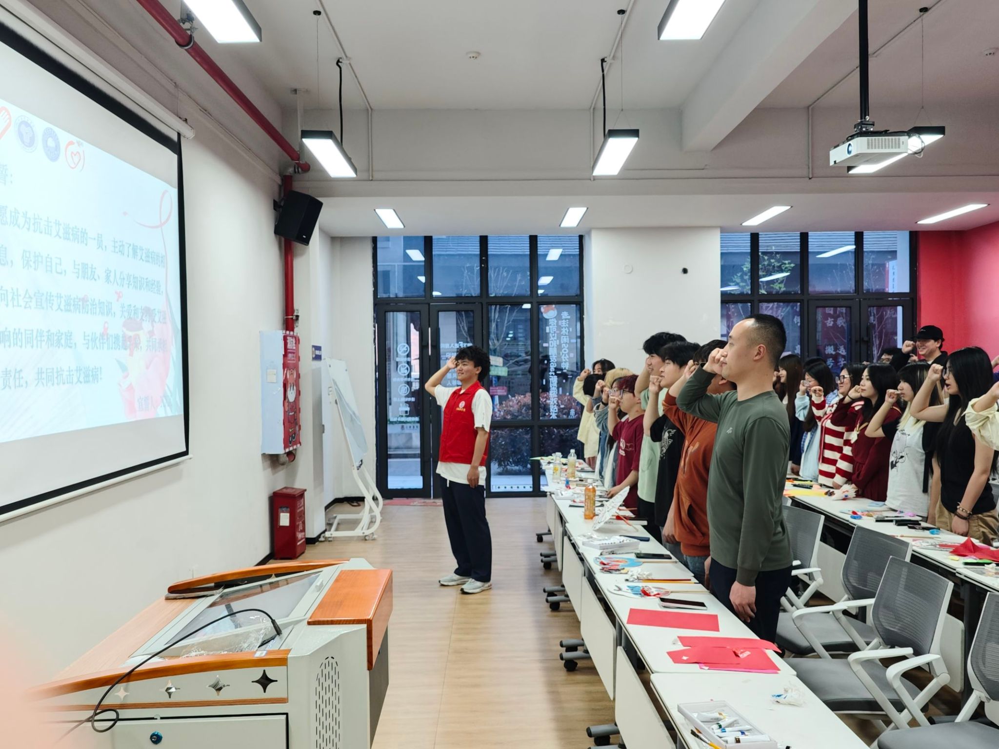 立体扇制作完毕后,活动进入宣誓环节。参与者们整齐站立,庄严宣读防艾誓言,声音洪亮坚定。他们承诺关爱艾滋病患者,从自身做起,积极传播防艾知识,共同抗击艾滋病毒,为社会贡献力量。此宣言展现个人决心,同时呼吁全社会重视防艾。参与者借此传递理念,助力构建包容、关爱的社会环境,让防艾意识更加深入人心,共筑健康防线。