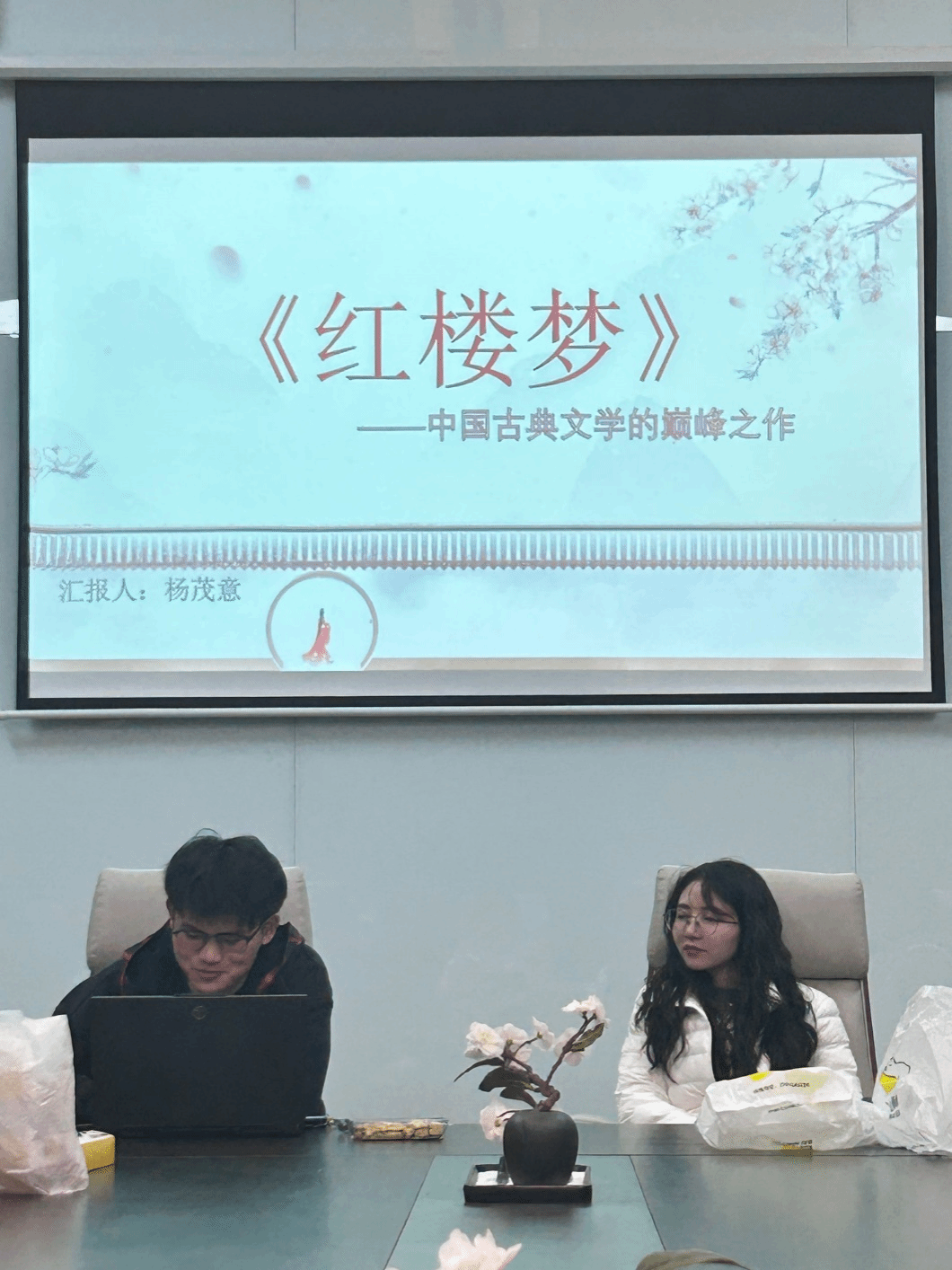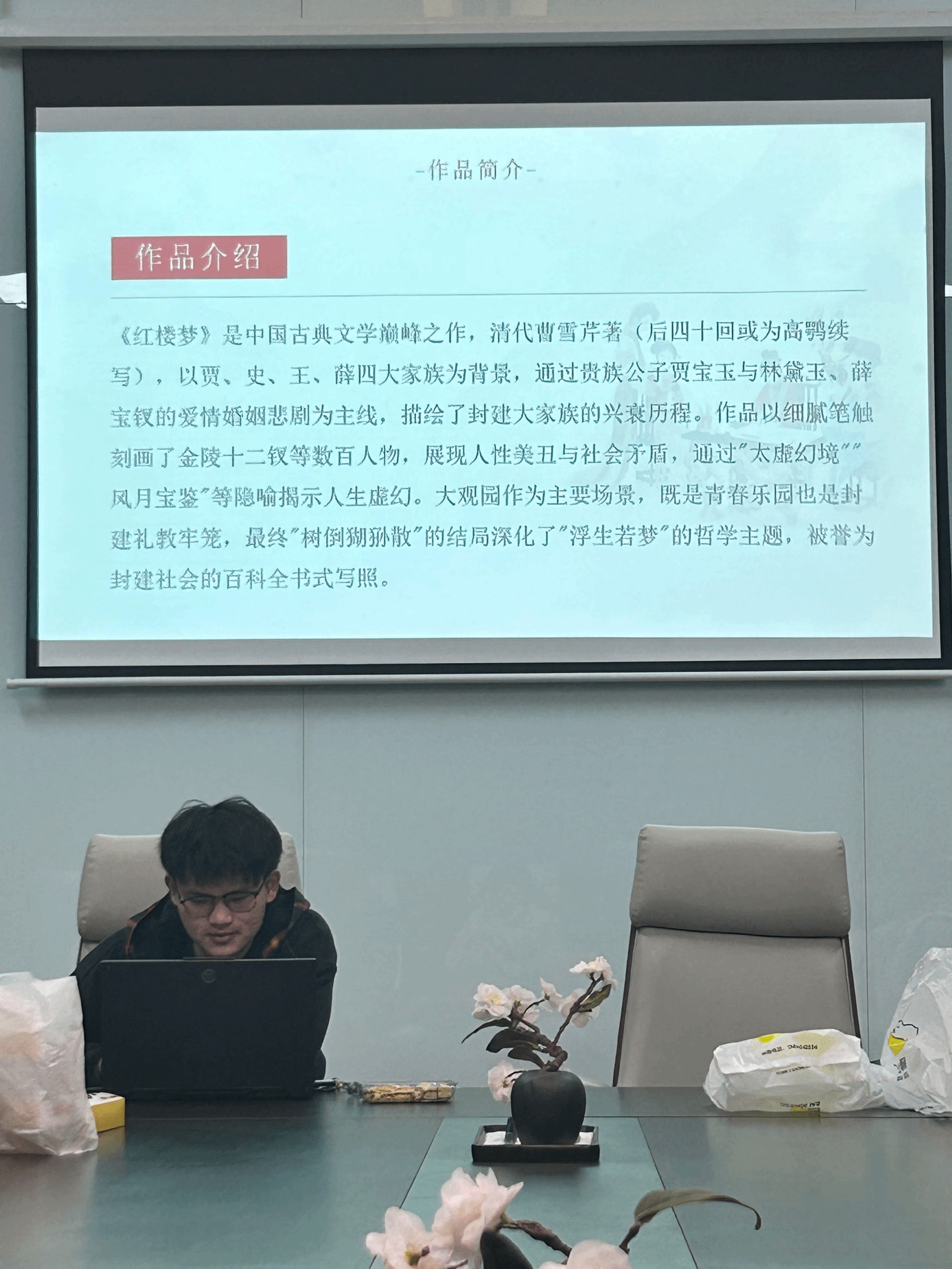 本次活动的分享人杨茂意同学,带来的是中国四大名著之一,曹雪芹先生所著的《红楼梦》。杨茂意同学依次为我们讲述了《红楼梦》的作品简介、人物介绍、作品鉴赏、读后感悟和对我国文学的贡献与影响。在他的介绍下,我们了解到了该书中的大致背景、主线故事和主要的人物形象。《红楼梦》是中国古典文学巅峰之作,描绘了封建大家族的兴衰历程,展现人性美丑与社会矛盾。以大观园作为主要场景,既是青春乐园也是封建礼教牢笼,最终“树倒猢狲散”的结局深化了“浮生若梦”的哲学主题,被誉为封建社会的百科全书式写照。在这次分享活动上,杨茂意同学还讲了《红楼梦》中的诸多谐音暗示,让我们知道了其中包含的深意。