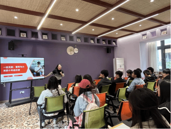 本次会议召开之前,同学们做了诸多准备。大会伊始,由马克思主义学院卫峥妮老师和罗娅老师分别就《任正非传》和《一往无前》两本书进行分享。卫老师分别从任正非的人生经历与《任正非传》的内容进行讲解。她指出,所谓华为精神则是:吃苦耐劳、敬业、艰苦奋斗的精神。其次非常崇尚“狼”,认为狼是企业学习的榜样,要向狼学习“狼性”,“学习”“创新”“获益”“团结”,用狼性文化来说,学习和创新代表敏锐的嗅觉,获益代表进攻精神,而团结就代表群体奋斗精神。正是由于任正非坚韧不拔的性格才造就了今天的华为,今天的华为精神也是对任正非性格的彰显。罗老师则向大家分享了《一往无前》,她指出在小米的创业历程中,雷军展现出了非凡的战略眼光和执行力。他提出的"专注、极致、口碑、快"的互联网思维,不仅颠覆了手机行业,也为我们提供了一种全新的思考方式。小米用互联网模式做硬件,用性价比打破行业壁垒,用粉丝文化重塑用户关系,这些创新举措让我深刻认识到,真正的创新往往来自于跨界思维的碰撞。罗老师强调到:成功不是偶然,雷军的成功不是偶然,而是持续努力和不断学习的结果。