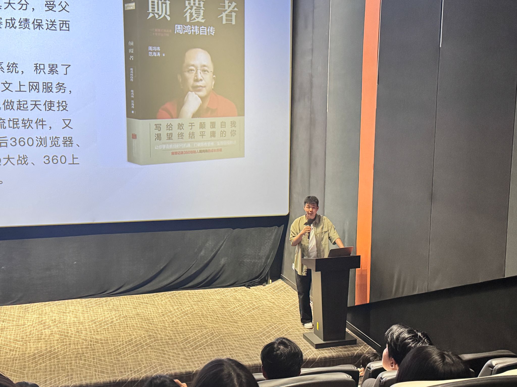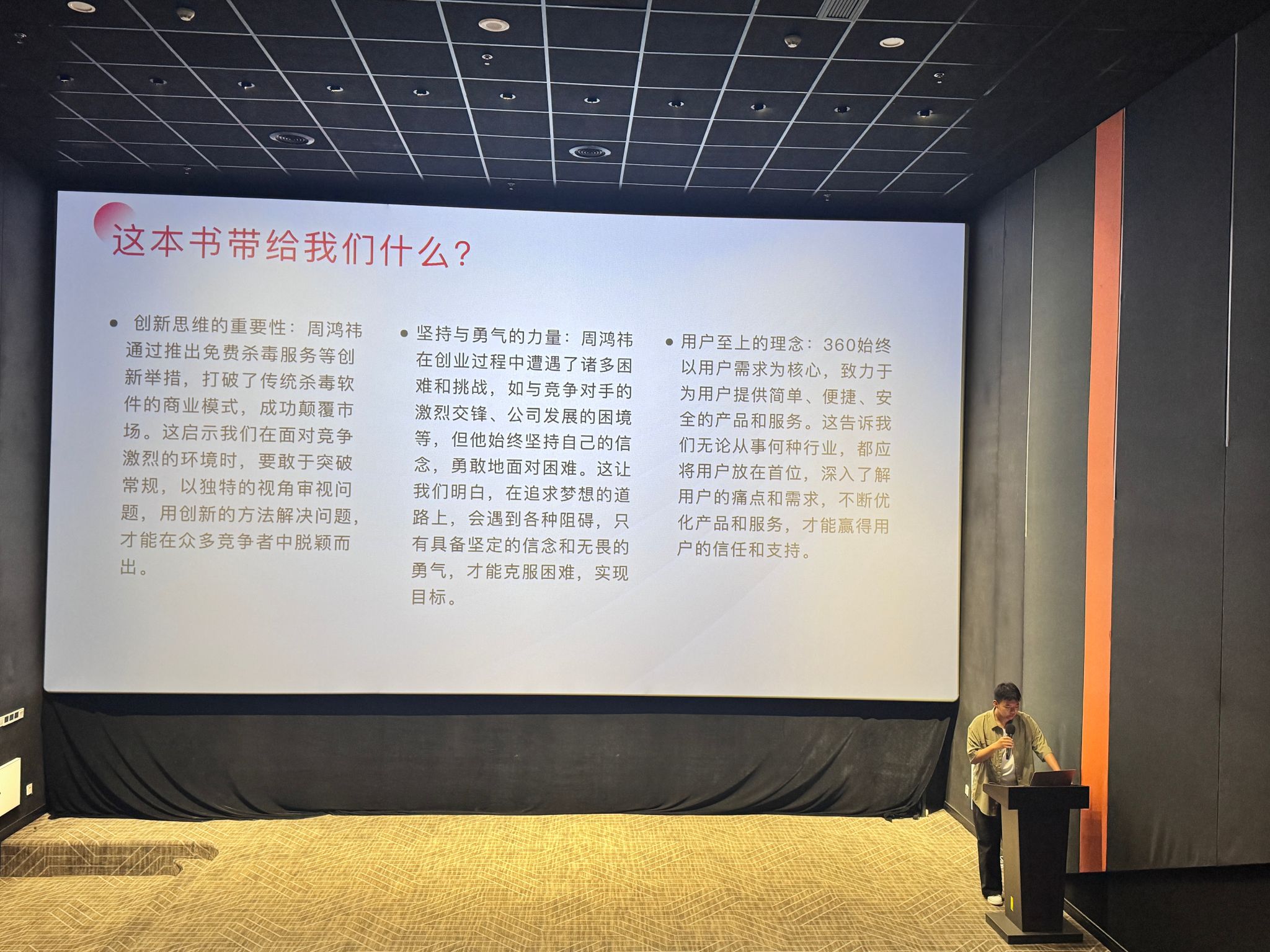 当晚 19 时,“大咖阅读”活动在郝宇辉同学的分享中拉开帷幕。作为 2024 级数据科学与大数据技术专业学生,他以独特的技术视角剖析周鸿祎的创业历程,从 360 安全卫士如何通过免费模式打破杀毒软件市场壁垒,到“互联网思维”中用户痛点转化为产品价值的核心逻辑,逐一拆解商业创新背后的思维密码。“周鸿祎在书中说‘颠覆不是破坏,而是用更简单的方式解决用户问题’,这让我想到我们专业学习中数据驱动的本质——技术最终要服务于人的需求。”郝宇辉结合当下 AI 技术发展趋势,引发同学们对“如何在数据科学领域实现颠覆性创新”的思考。活动现场,他通过360安全卫士发展历程中的关键事件,如与瑞星市场博弈、面对技术封锁时的自主研发,展现出创业者在危机中的决断力与创新勇气。台下同学频频点头,不时就“传统行业如何借力互联网思维”等问题与主讲人互动,思想的火花在热烈讨论中不断迸发。