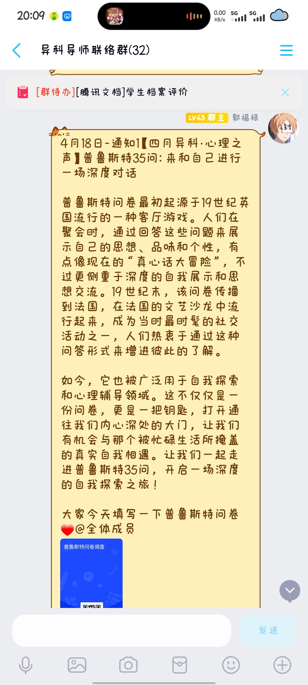 在本月的活动中,郭福禄老师首先依托自己的法语专业背景,于4月第8周组织了一次别开生面的“普鲁斯特问卷”调研活动。他不仅介绍了问卷的历史背景及其在心理学与自我认知中的重要地位,还引导学生们深入探讨个人的价值观与人生目标。这一活动巧妙地将学科知识与人文教育相结合,极大地提升了学生的思辨能力和自我认知水平。