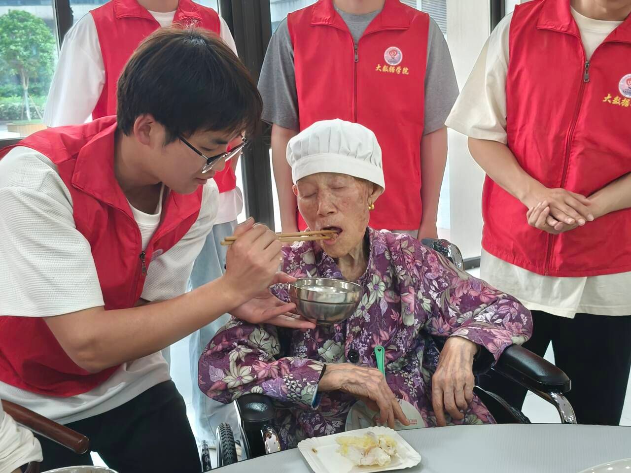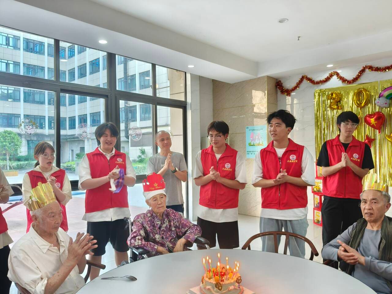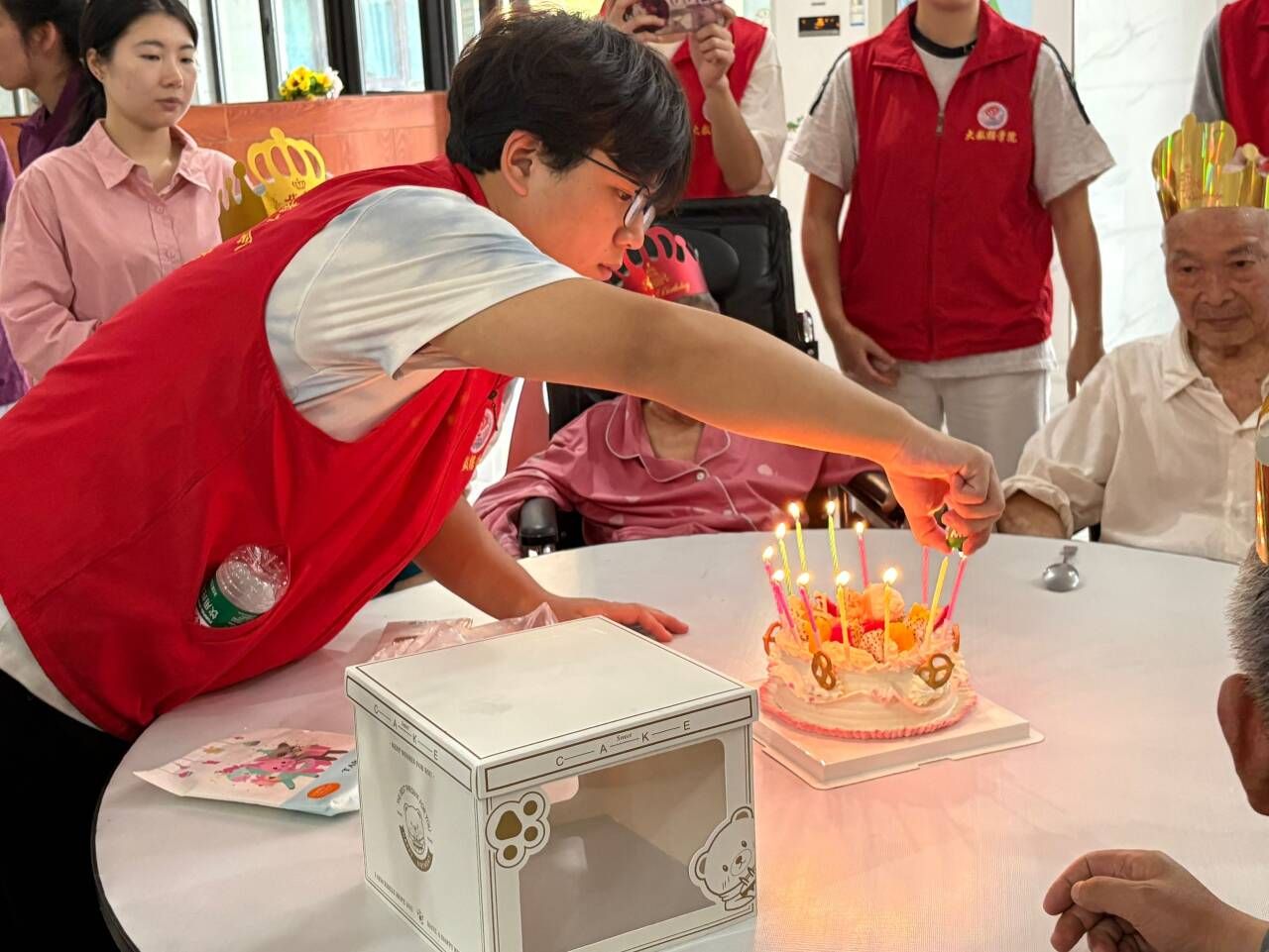 恰逢当月集体生日会,志愿者们精心布置寿星主题餐桌,为行动不便的老人夹菜盛汤,确保每位老人都能品尝到热腾腾的佳肴。伴着《生日快乐》歌曲的旋律,志愿者们推出蛋糕,与寿星老人们共同许愿、吹蜡烛。张奶奶在志愿者搀扶下切下第一刀蛋糕,烛光中,银发与青春的笑脸交织,温情流淌。
