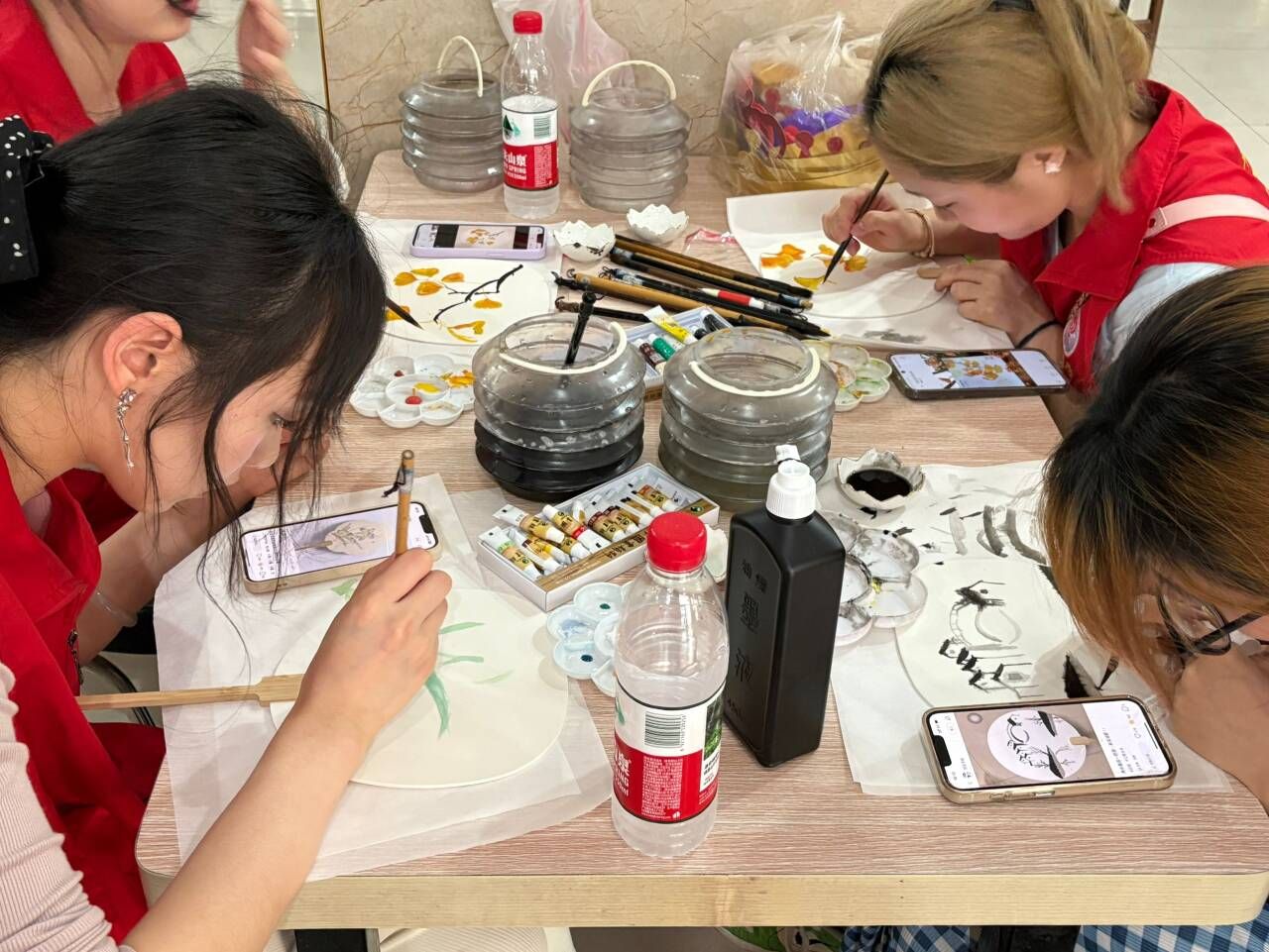 活动中,志愿者们铺开画纸、调匀颜料,与老人围坐一堂共同创作。同学们引导老人们执笔挥毫,共同描绘“小桥流水人家”的水墨意境,用金黄与赤红点染秋日枫叶的层叠之美。每幅作品完成后,志愿者们在背面工整书写老人姓名,将艺术创作化为专属纪念品。