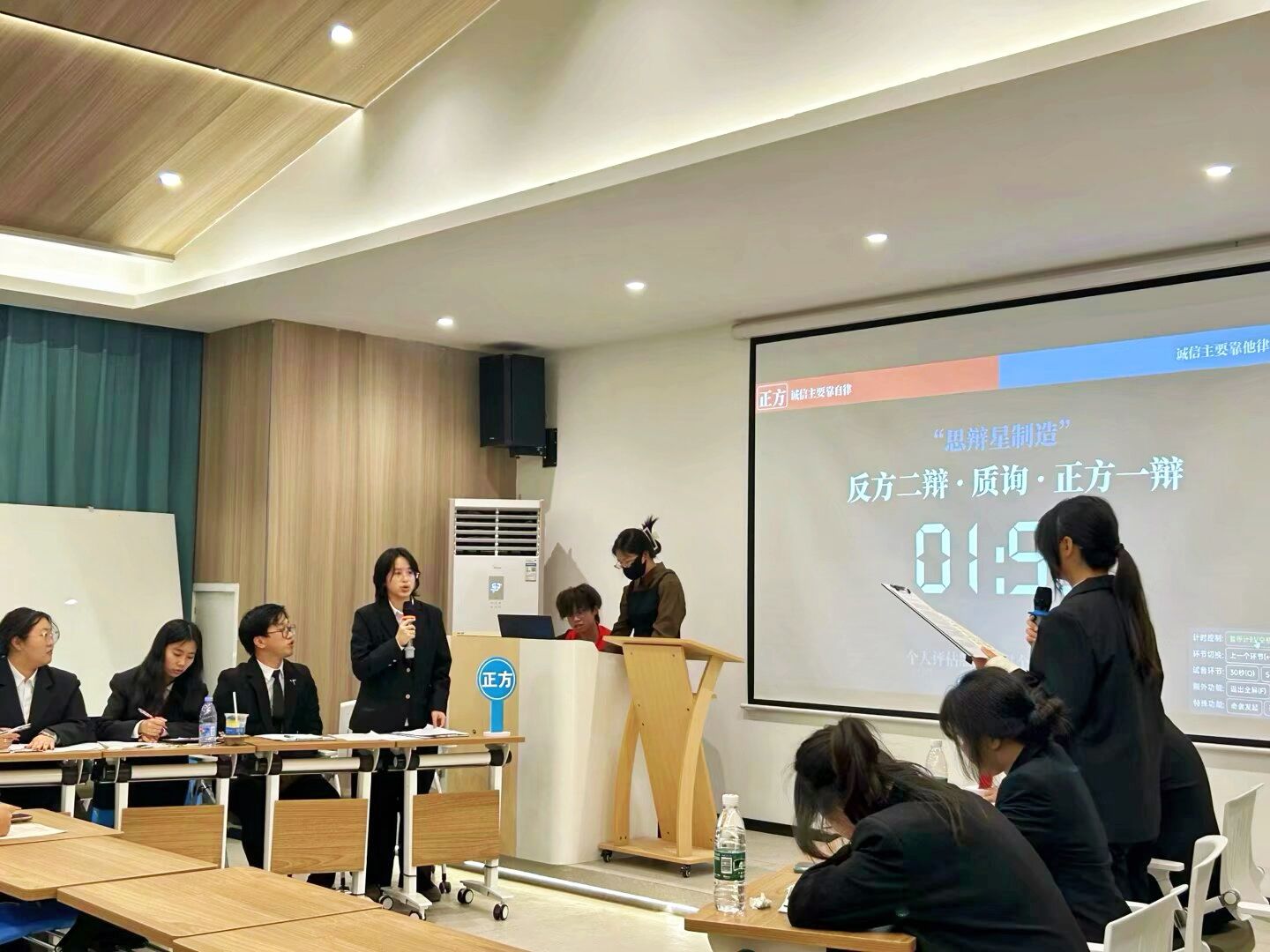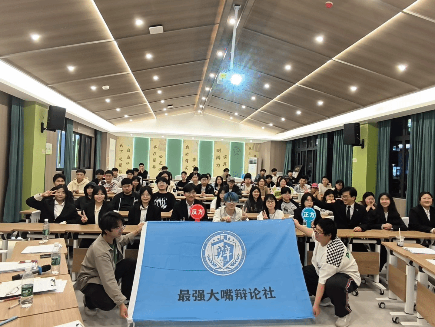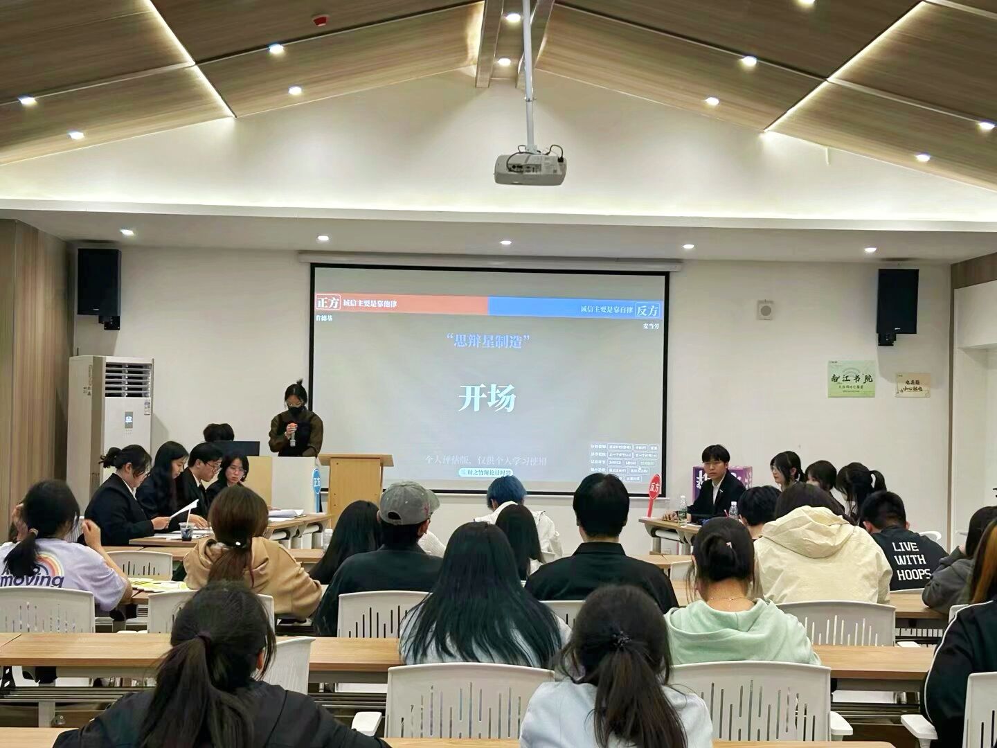 活动选择具有热点的诚信辩题,最强大嘴辩论社的选手们分成两支辩论队,展开高水平的辩论对决。赛场上,每队四名辩手都全神贯注,围绕辩题依次从学术、社会、生活等多维度进行深度剖析。在立论环节,双方一辩分别清晰阐述己方观点,为后续辩论奠定基础;攻辩环节中,辩手们你来我往,犀利得提问与巧妙得应答不断碰撞出思维的火花,;自由辩论阶段,更是将辩论气氛推向高潮,双方激烈交锋,用生动的语言和严谨的逻辑进行激烈对抗;总结陈词时,四辩将观点进行升华,再次强调己方立场,引发观众对诚信问题的深度思考。台下观众全神贯注,随着辩论的推进,观众对辩题立场的倾向也在实时发生变化,都沉浸在诚信话题的思辨魅力之中。