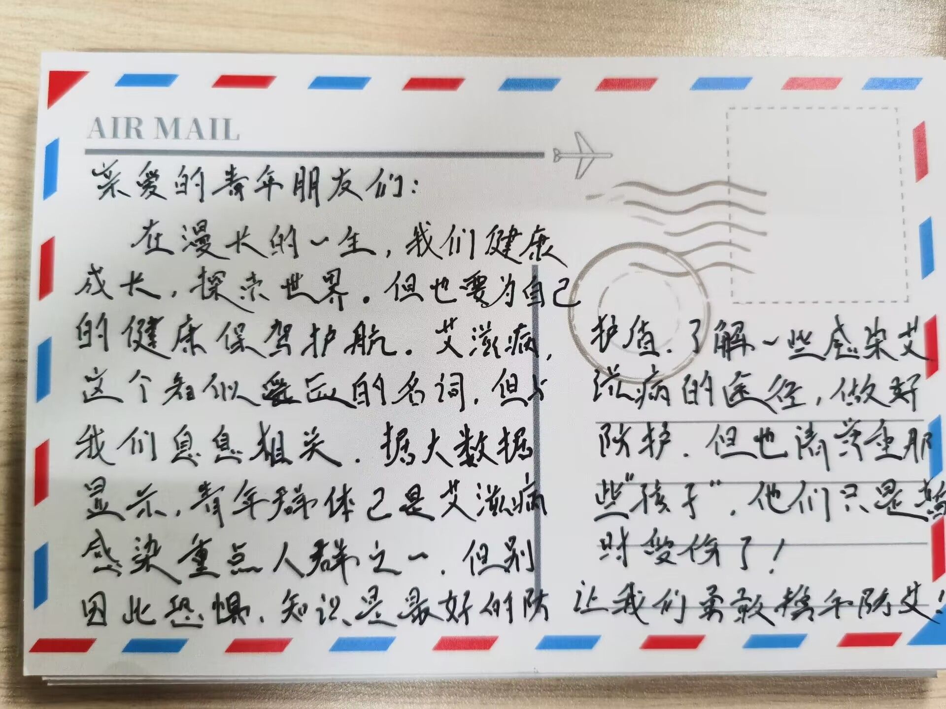 这场明信片活动成功突破传统防艾宣传的单向传播模式,将生硬科普转化为情感对话。小小的明信片,既是美学载体,又肩负着消除偏见的使命。防艾知识经视觉重构自然浸润,手写字迹穿透健康与患病群体的认知壁垒,实现科学理性与人文关怀共振、理性与感性融合,笔墨交织搭建起双向理解通道。此次校园实践活动以温柔坚定的力量,加固了社会文明的温度与厚度。