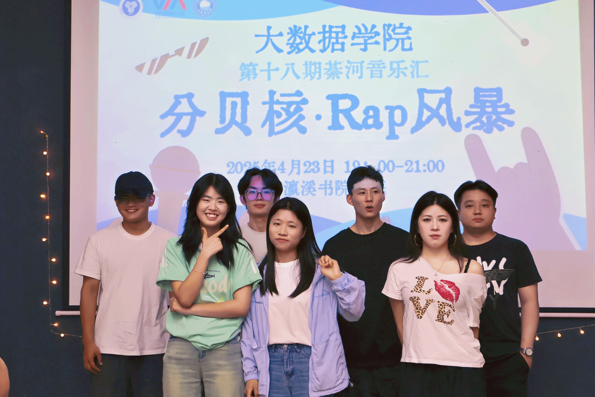 2025年4月23日晚19点,瀛溪书院二楼回声报告厅内气氛热烈,大数据学院第十八期綦河音乐汇“分贝核·Rap风暴”在此成功举行。本次音乐汇以Rap文化为核心主题,参赛者们炫酷的歌曲演唱和趣味十足的互动环节,为现场观众奉上了一场震撼的视听盛宴,充分展现了当代青年的音乐才华与青春活力。