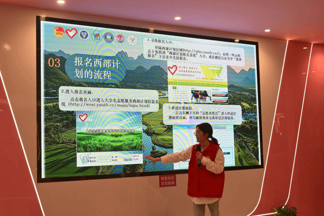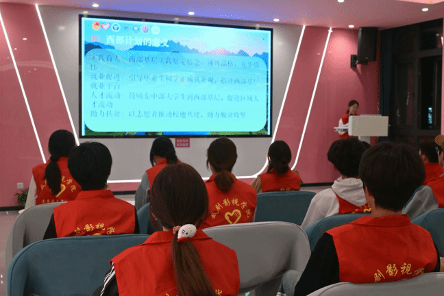青春正当时,热血赴西部!大学生志愿服务西部计划一直以来都是青年学子奉献自我、实现价值的广阔舞台。4月29日,戏剧影视学院青年志愿者协会与大数据青年志愿者协会于丁山书院射手座的·多功能空间开展以“培训赋能,助力西部计划绽放青春”为主题的第二期花果培训会。本次会议由大数据青协负责人李欣蔓以展示各个数据和相关蒸车拉开培训的序幕。