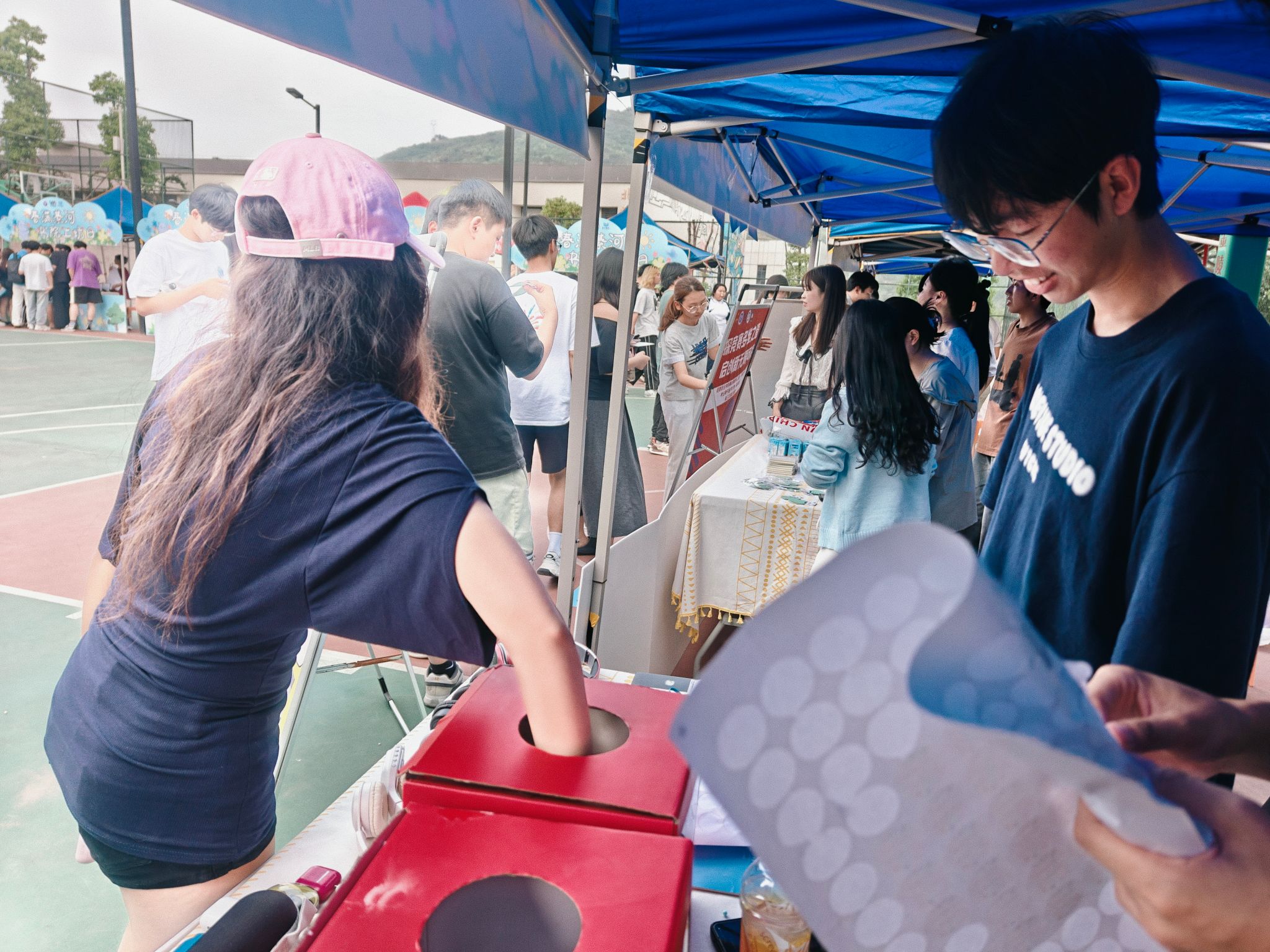 参与者们排起长队等待挑战,围观同学都怀着激动的心情看着参加者,蠢蠢欲动都很想上前参与活动,毕竟同学们都很不想错过购买减免的机会。在工作人员细致讲解规则后,活动顺利照常进行。盲盒中含有平时很易丢失的耳机,雨伞、眼镜盒、充电宝等等,在活动过程中不仅借此机会加深了大家对丢失物品的印象,并且减少了物品丢失概率。义卖摊位前,选购商品的同学络绎不绝,不少人在享受折扣的同时,主动追加捐赠,让公益行动更具温度。活动现场还设置了拍照打卡区,记录下参与者的笑脸与善举。