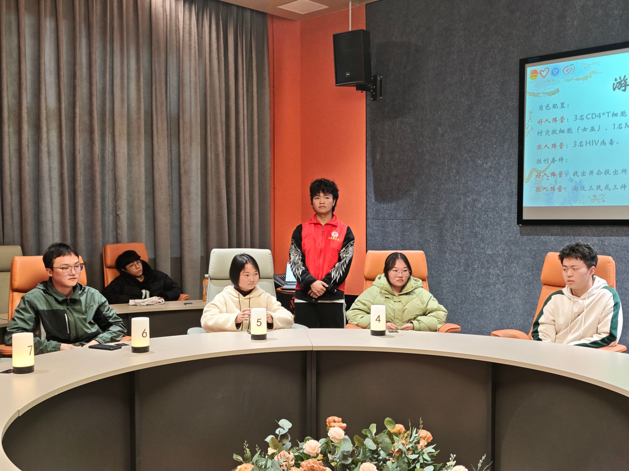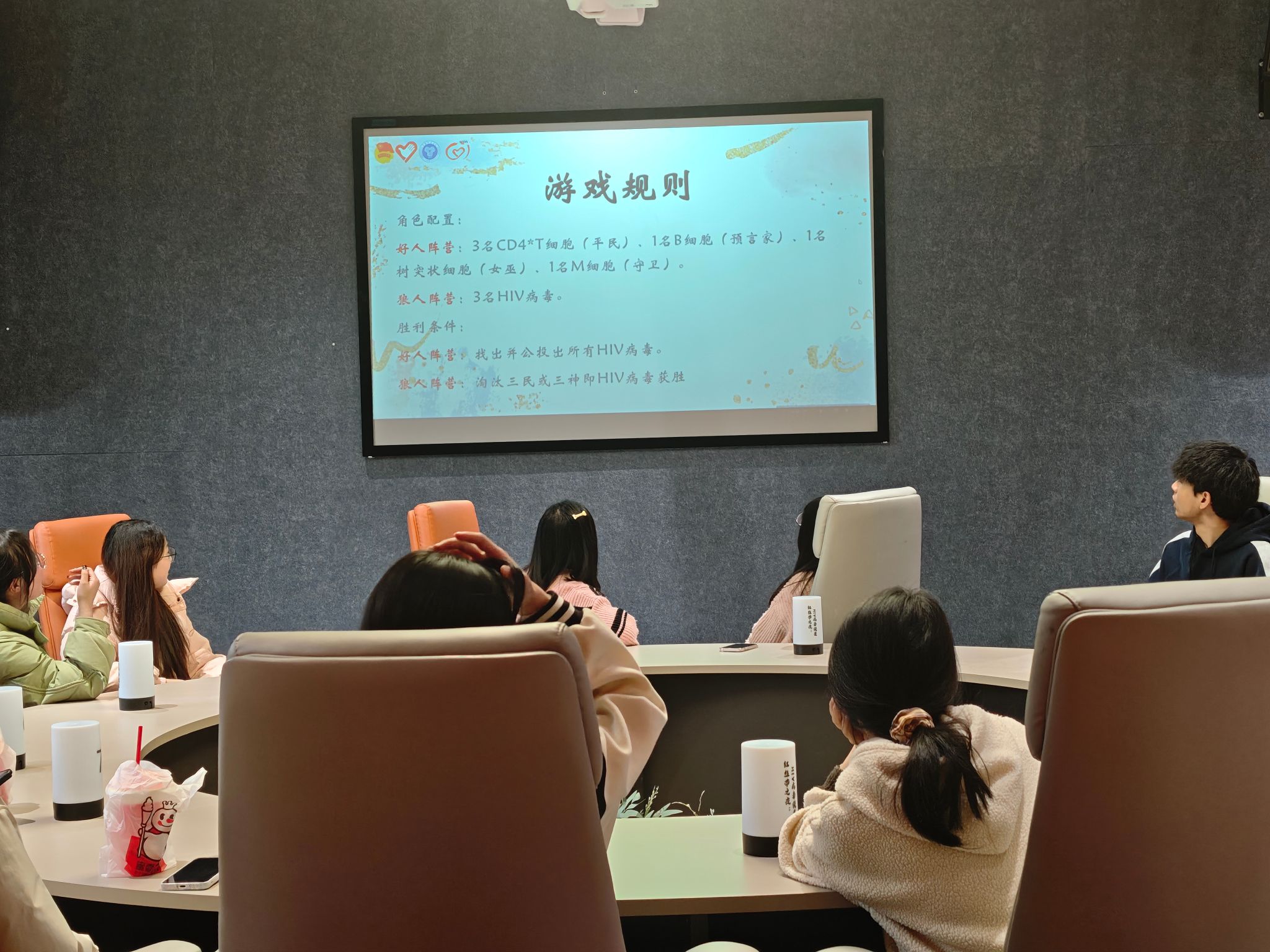 2025年4月2日下午17:00 - 19:00天使关“艾”志愿服务专项支队与桌游社携手在古剑书院龙泉·会议室、灵宝·心理卡牌屋成功举办“红丝带之夜,HIV病毒侵袭”防艾狼人杀活动。活动现场,工作人员播放了HIV病毒感染过程的动画视频,有效加深了参与者对艾滋病传播机制的认识,为后续防艾主题活动的开展筑牢了知识根基。