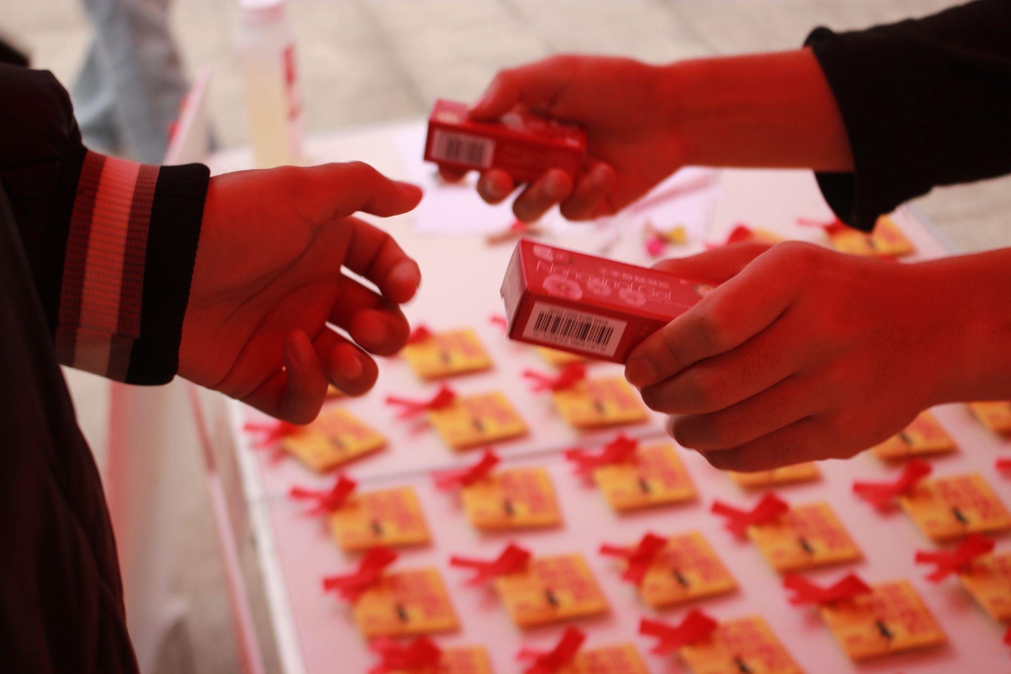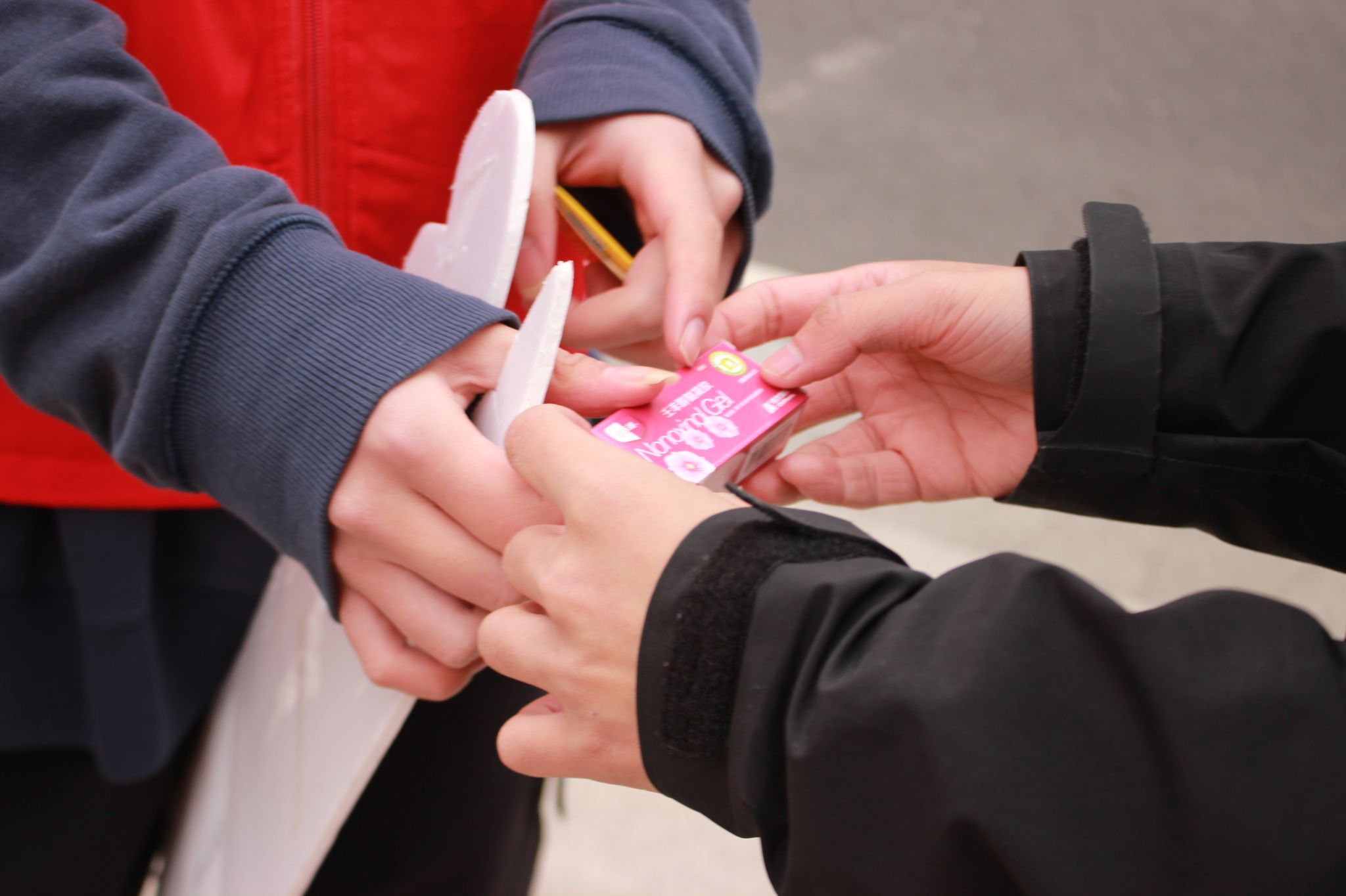 活动正式开始,现场进入互动游戏环节——套圈挑战。每位参与者手握五次投掷机会,目标直指贴有红丝带的安全套。成功套中三件或以上即可赢得奖品,全中者更是能获得整盒奖励。这一新颖形式吸引同学们踊跃参与,现场气氛热烈。同学们在游戏中展现出专注与冷静,沉稳瞄准,精准投掷。“这个活动真是太有趣了!我不仅玩得开心,还学到了很多防艾知识。”一位同学兴奋地告诉志愿者,“我之前对这方面了解得并不多,但通过这个游戏,我更加明白保护自己的重要性。”领奖时,他们积极向志愿者询问奖品用途及使用方法,进一步丰富防艾知识。