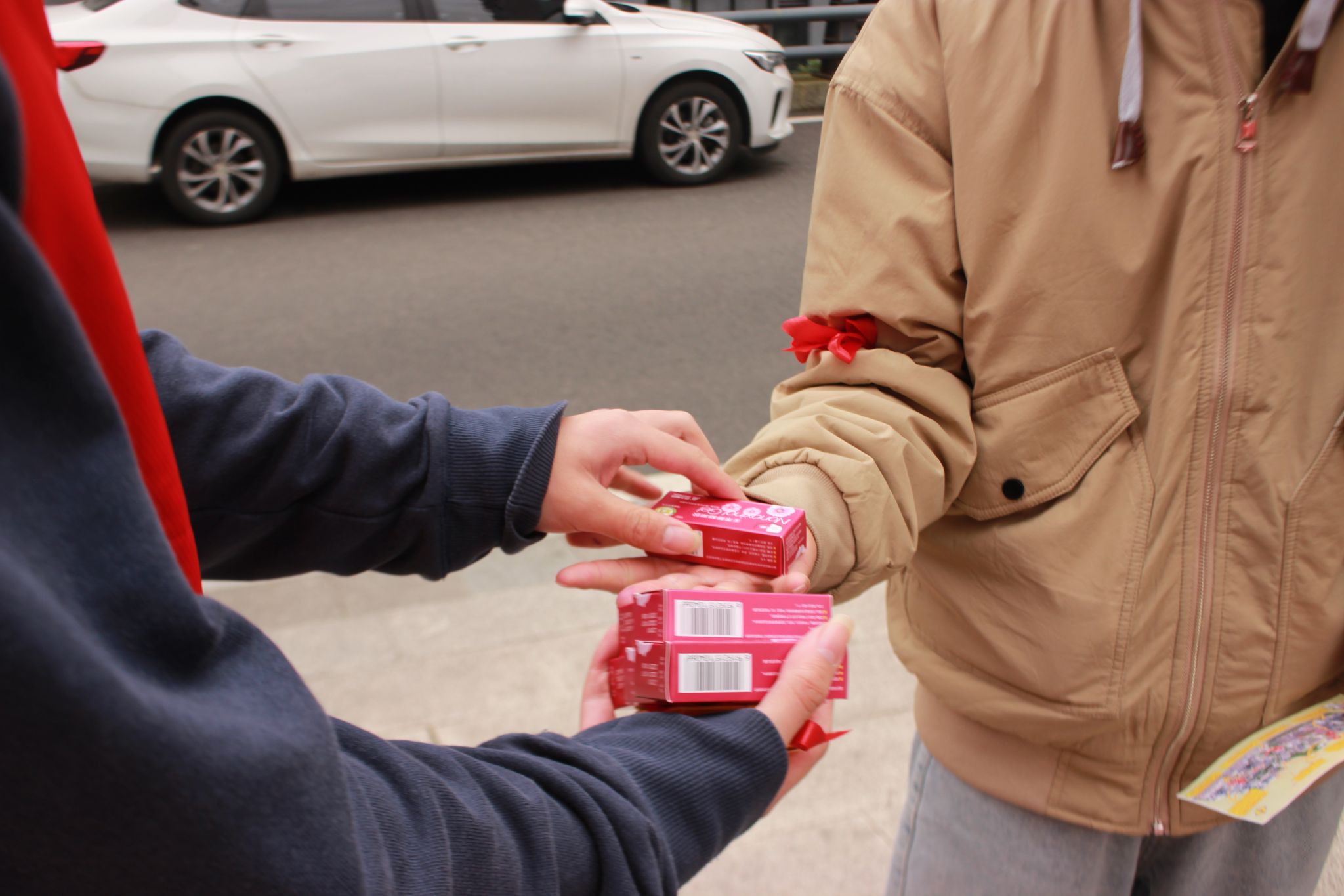 活动前夕,志愿者们提前抵达现场,迅速而有序地投入到活动筹备工作中。他们分工清晰,协作高效,确保物资准备与现场布置的圆满完成。与此同时,参与者们也展现出浓厚的兴趣与高涨的积极性,纷纷主动了解活动内容,并在一旁耐心等待,营造一个热烈且积极的氛围。在天使关“艾”志愿服务专项支队的精心组织下,活动现场布置一系列色彩鲜明的宣传展板,详尽地介绍艾滋病的传播途径、危害以及有效的预防措施。志愿者们活跃在人群之中,分发壬苯醇醚凝胶,并耐心细致地解答大家关于防艾的各种疑问,使得整个现场氛围富有教育内涵。