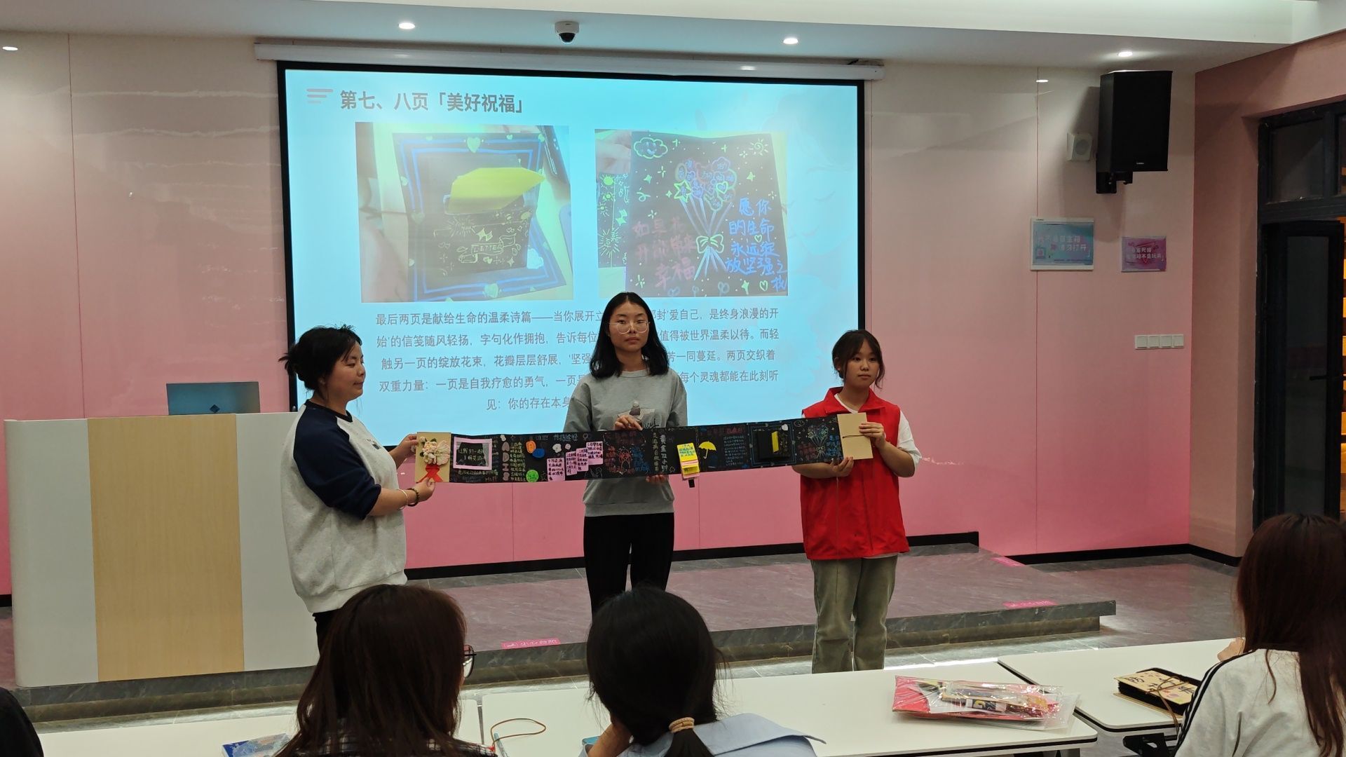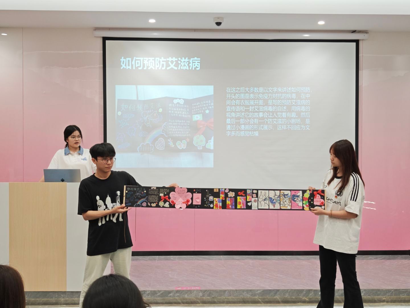 5月14日晚上20:30,在丁山书院处女座·智慧教室,活动正式进入重点,立体书介绍环节正式开始。工作人员首先介绍了活动流程,随后各小组派代表依次进行作品分享。在分享过程中,同学们不只是展示自己精心制作的立体书作品,还详细介绍了作品的设计理念和制作过程。这些作品内容丰富、形式多样,而且充满了创意和情感。同学们在这里互相分享自己独特的创作理念与精心制作的作品,进一步传递了防艾理念。