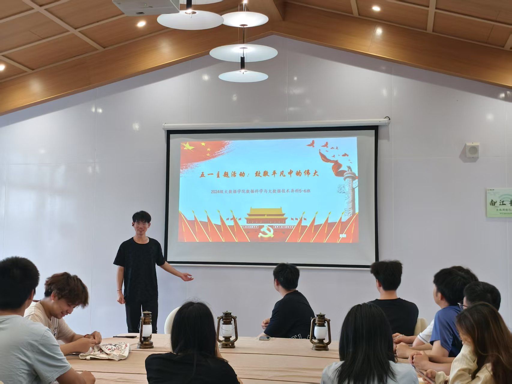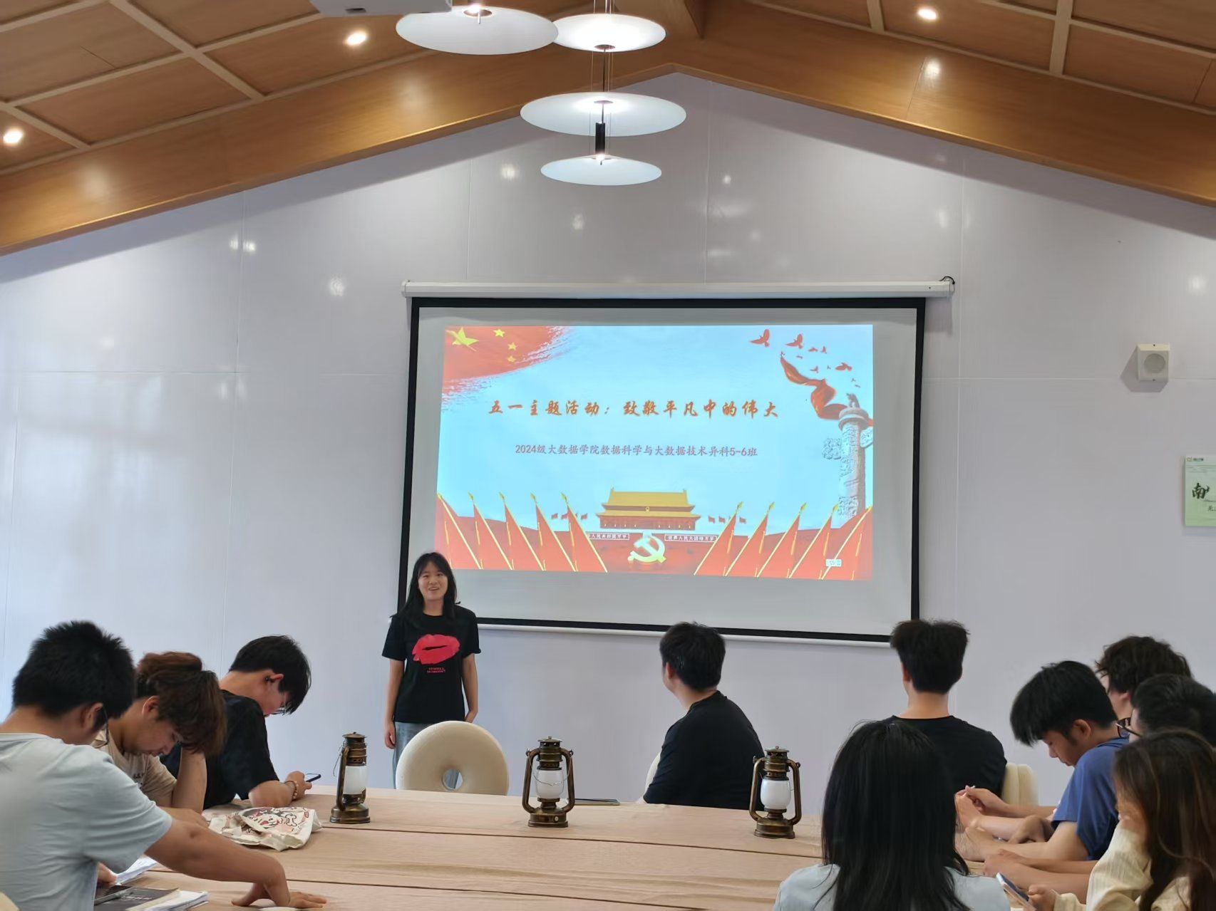 为弘扬劳动精神,培育新时代青年的责任担当,大数据学院2024级数据科学与大数据技术异科5-6班2025年5月15日中午12:00在南江书院慥慥智慧交流活动室开展了“致敬平凡中的伟大”五一劳动节主题班会。活动以“发现身边最美劳动者”为主线,让同学们深刻感悟平凡岗位中的不凡价值。